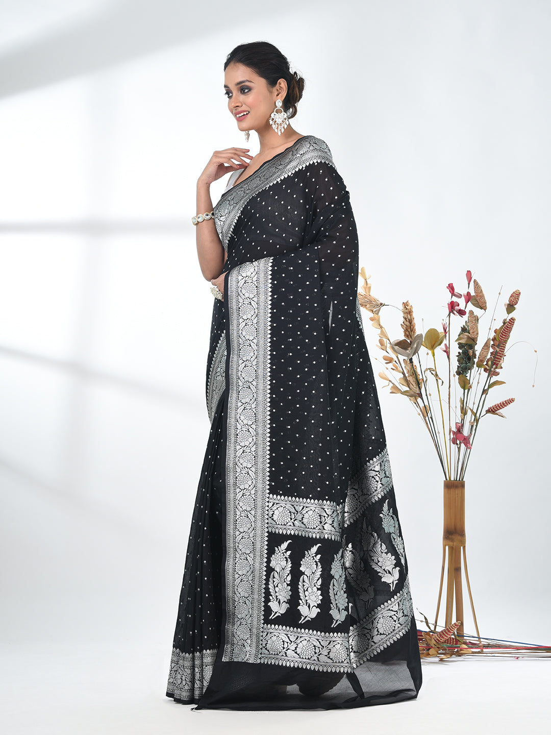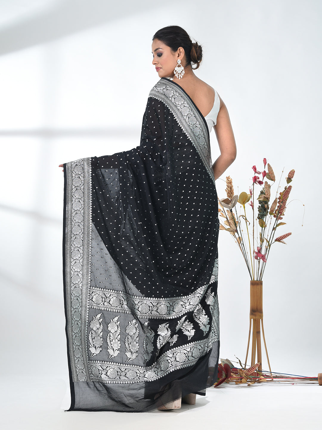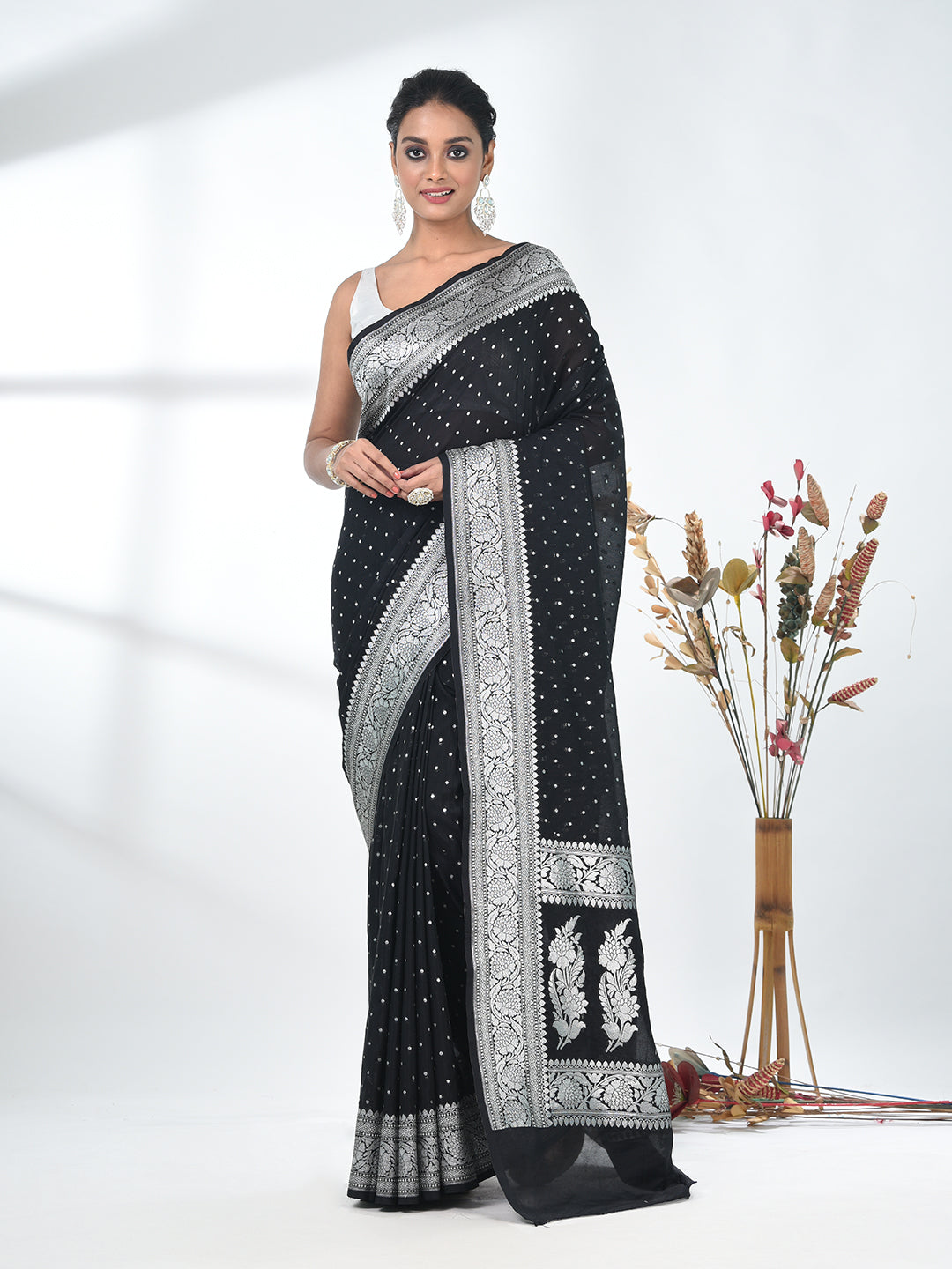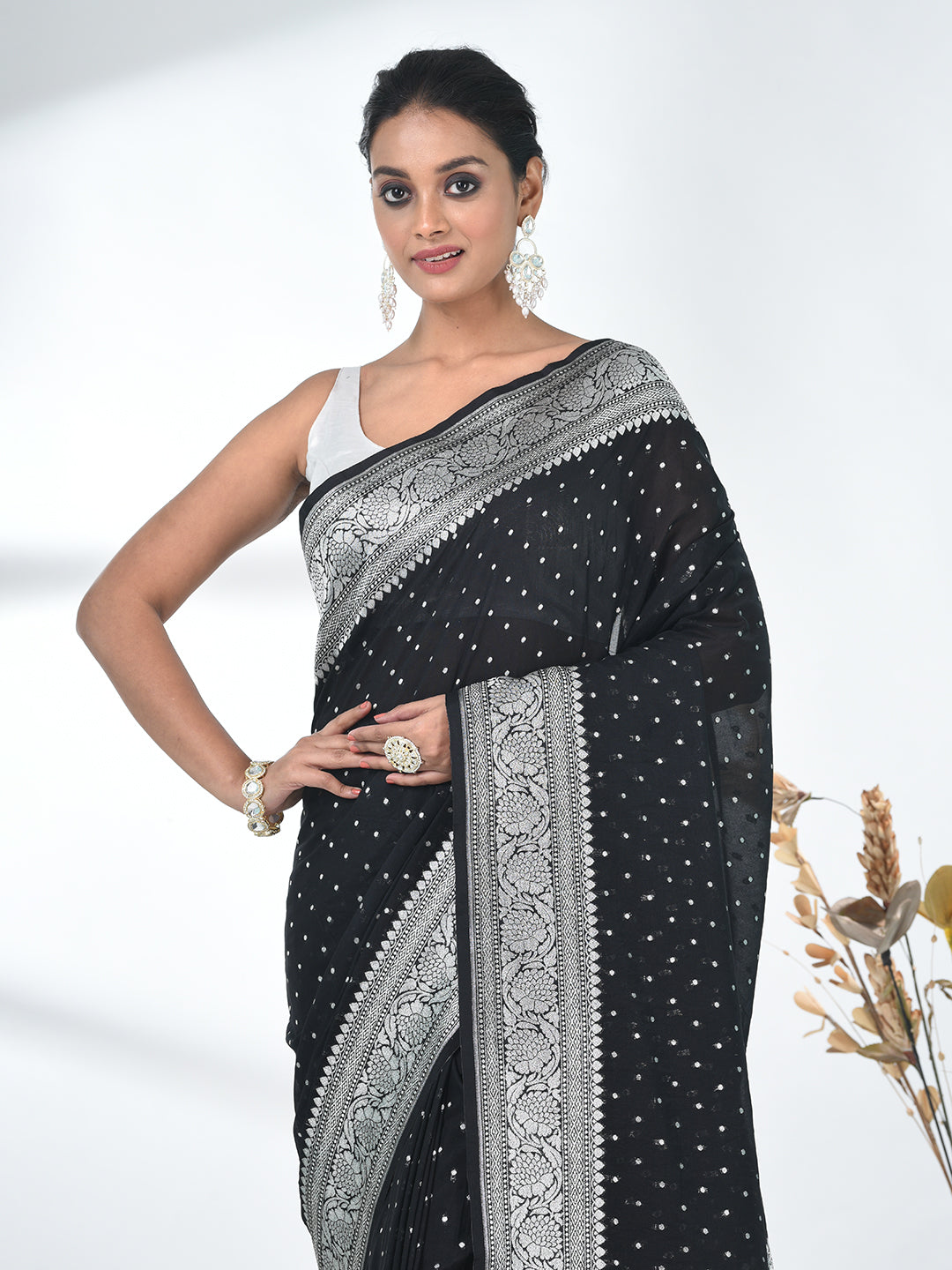 This elegant Black Georgette Blend Saree is a perfect blend of tradition and modern sophistication. Crafted from high-quality georgette fabric, it drapes beautifully, ensuring both comfort and style. The saree features a rich, vibrant black color, complemented by intricate silver embroidery along the borders and a delicate pattern throughout, adding a touch of glamour. The shimmering details elevate the overall look, making it ideal for weddings, parties, and festive occasions. Pair it with statement jewelry and heels for a standout ensemble that exudes grace and charm.