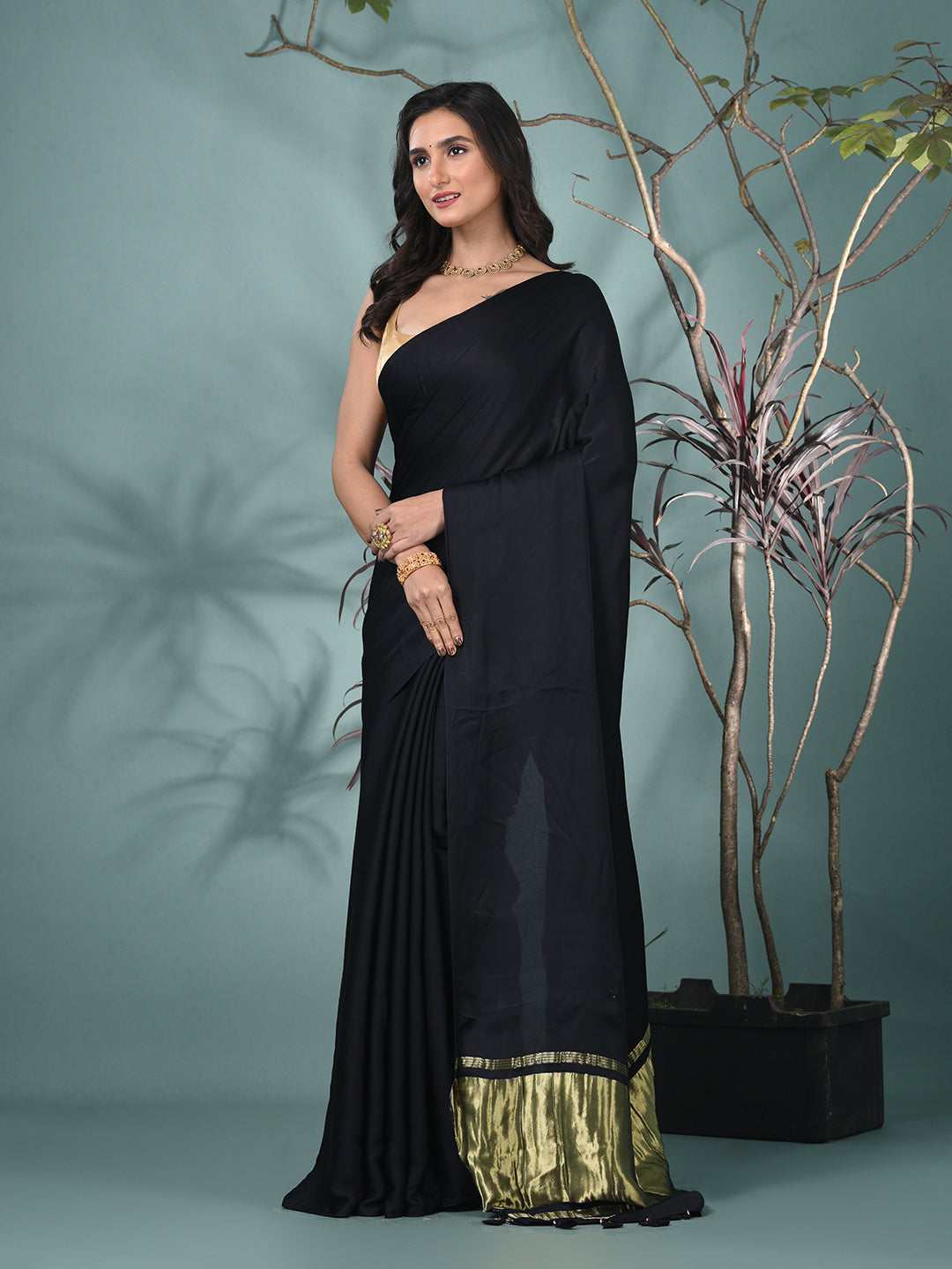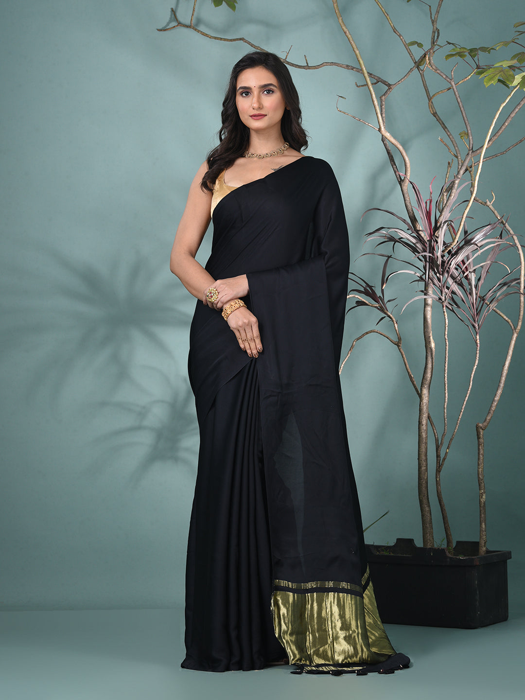 Exude elegance and sophistication with this Black Pure Modal Silk Saree. Crafted from luxurious modal silk, this saree offers a smooth and soft drape that feels as beautiful as it looks. The rich black color enhances its timeless appeal, making it an ideal choice for weddings, festive events, or evening parties. The saree is beautifully complemented by a golden border with delicate tassels, adding a touch of glamour and finishing the look with grace. Whether for a special occasion or a celebration, this saree promises to make you feel like royalty.