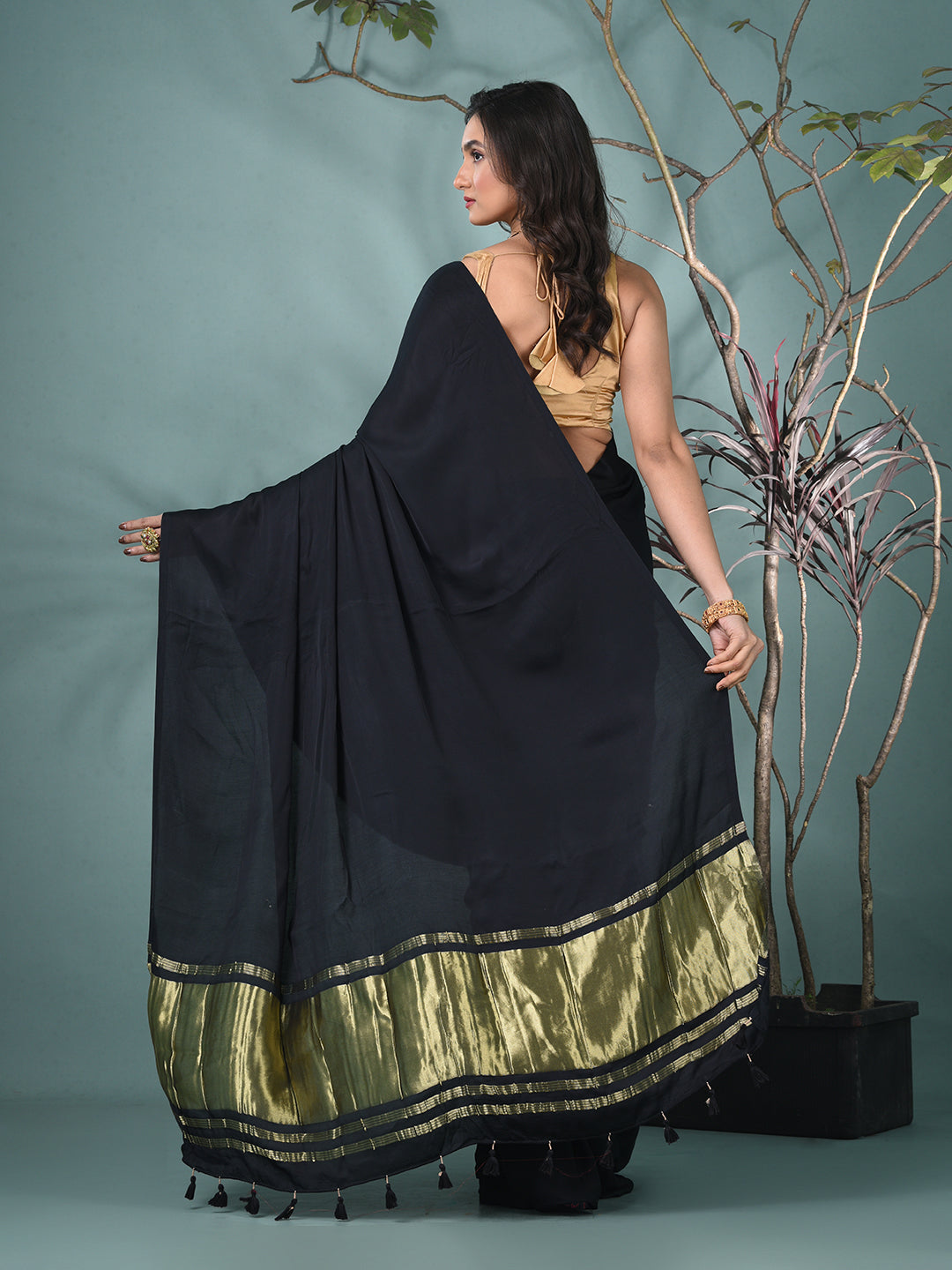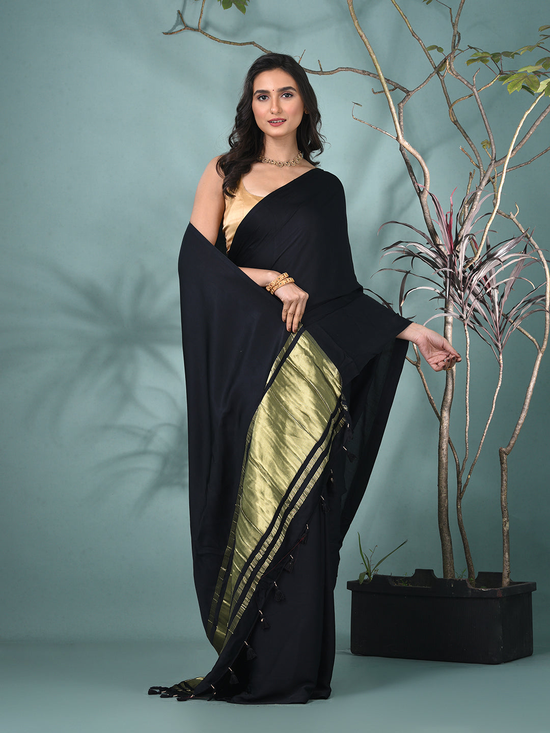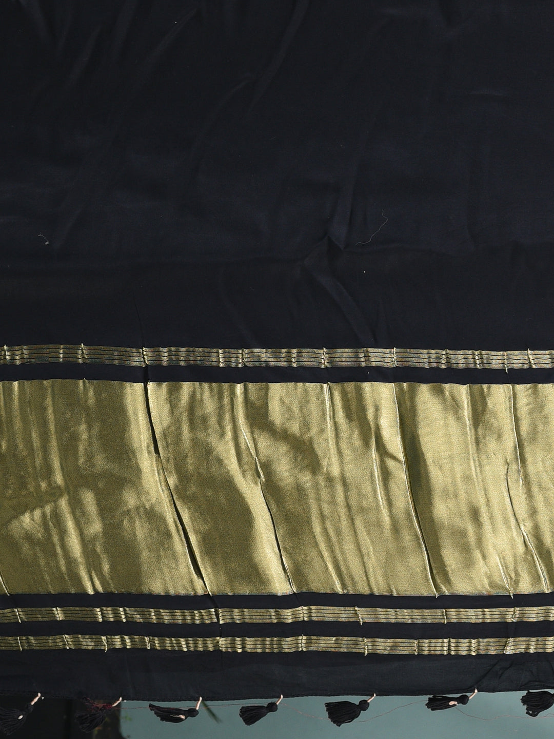 Black Modal Silk Saree with Golden Border and Tassels