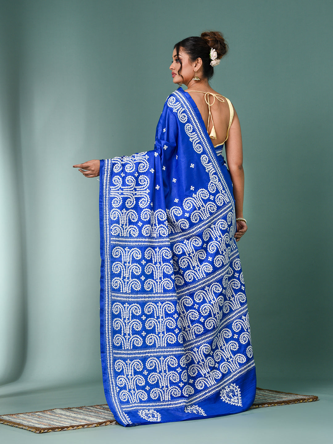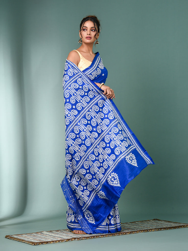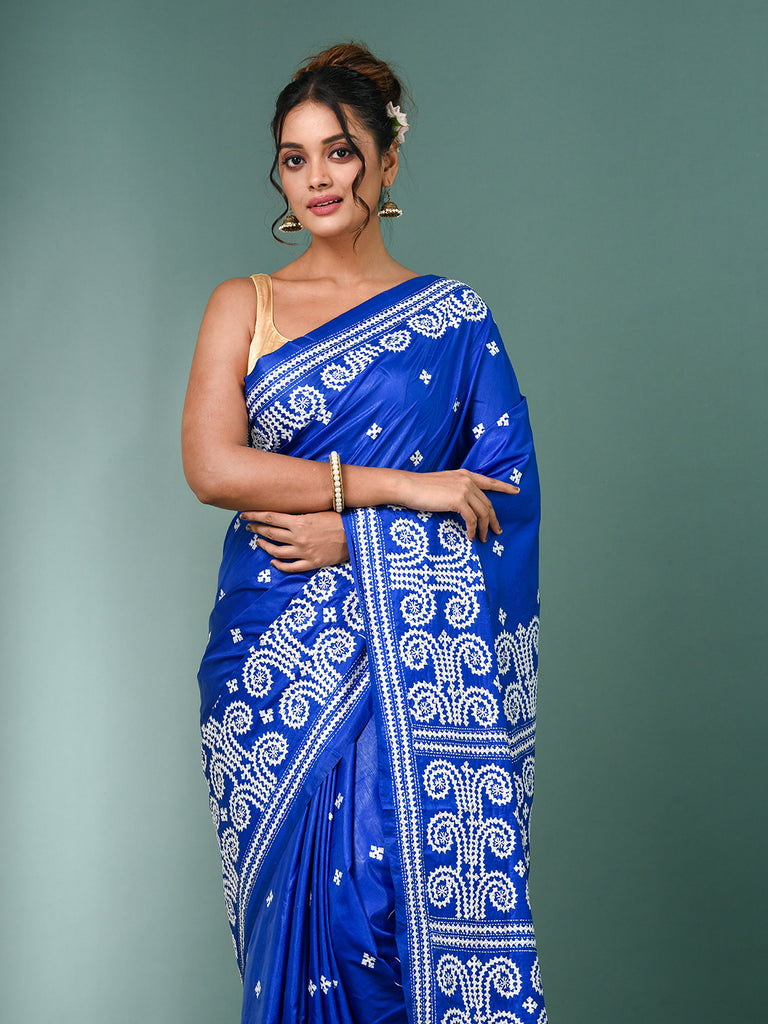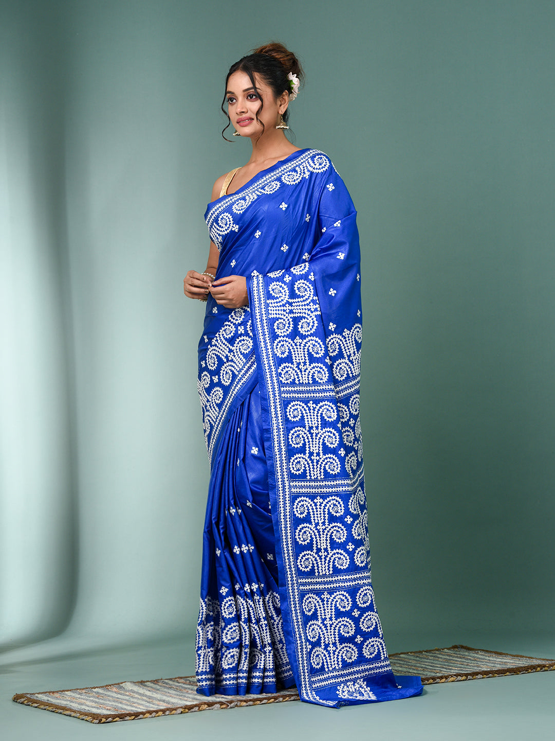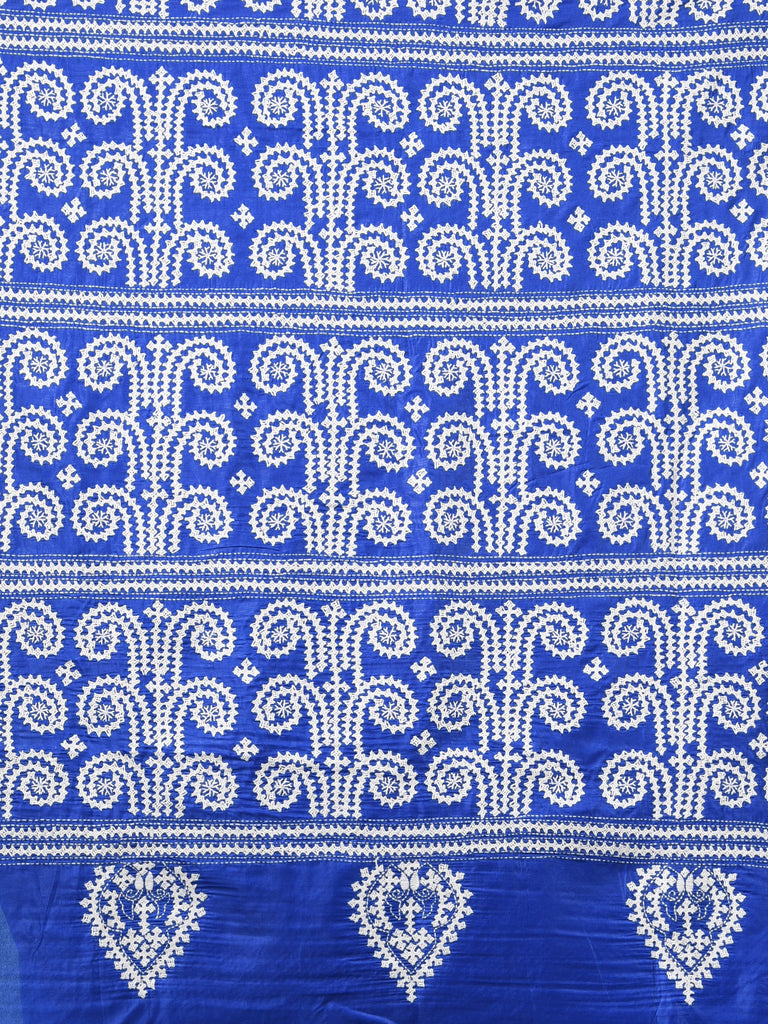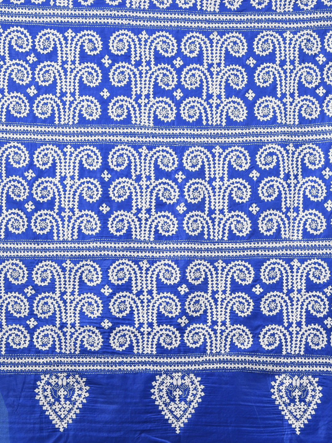 Blue Gujrati Work Kantha Stitch Silk Soft Saree