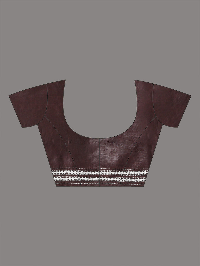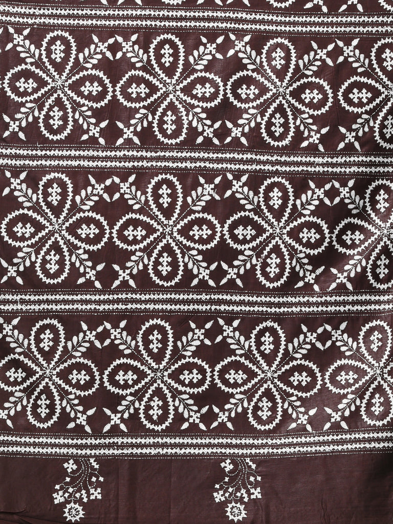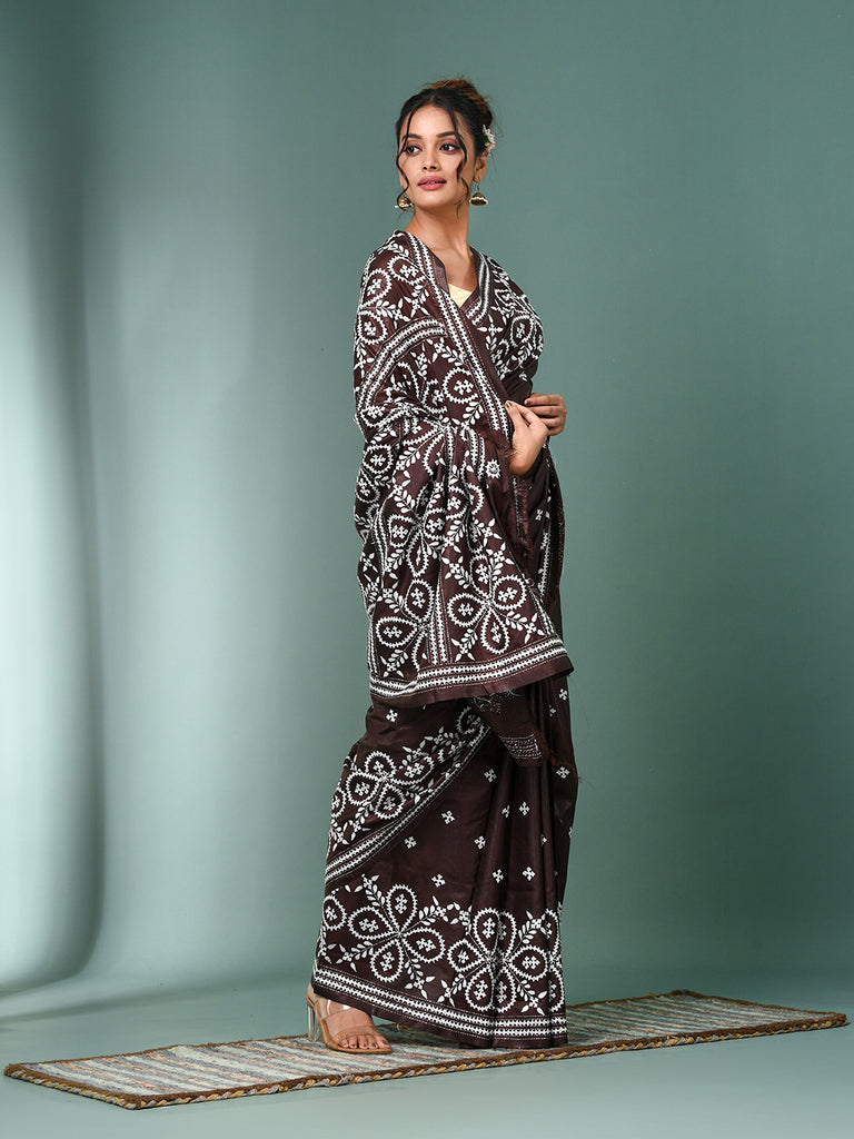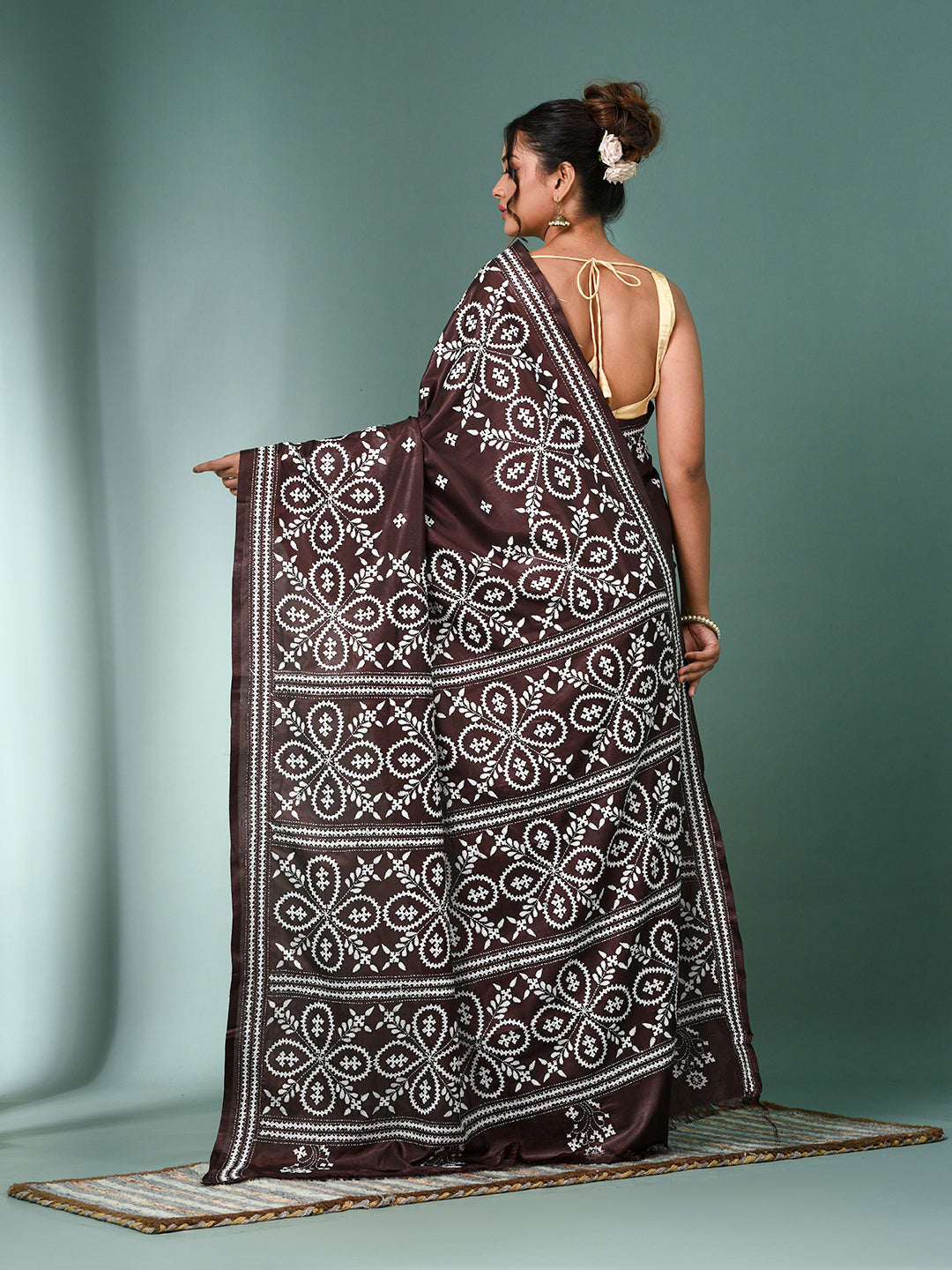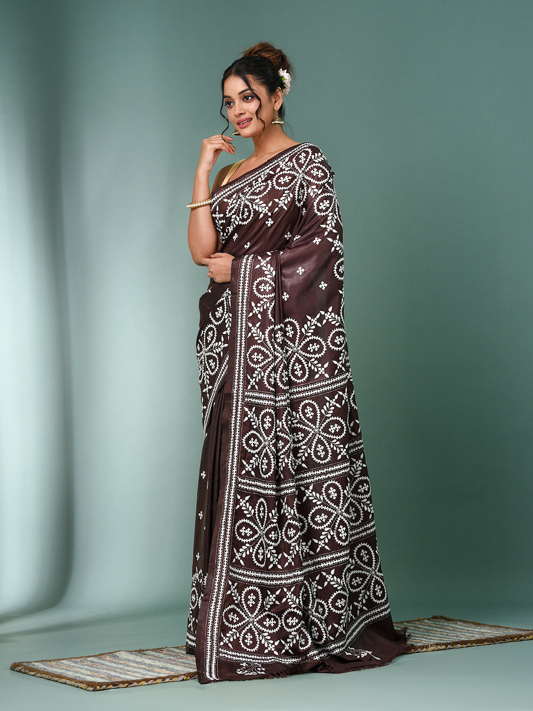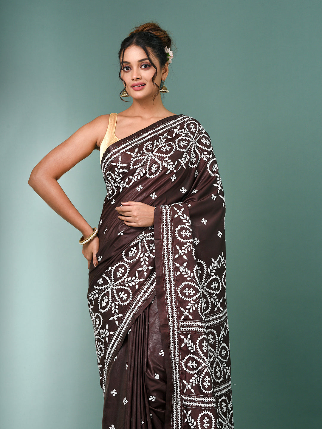 Brown Gujrati Work Kantha Stitch Silk Soft Saree
