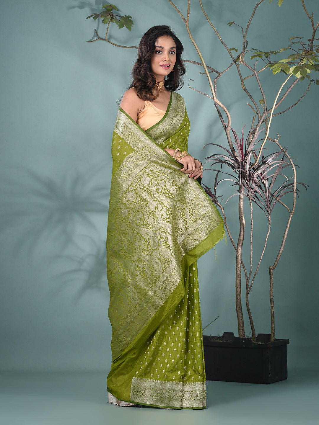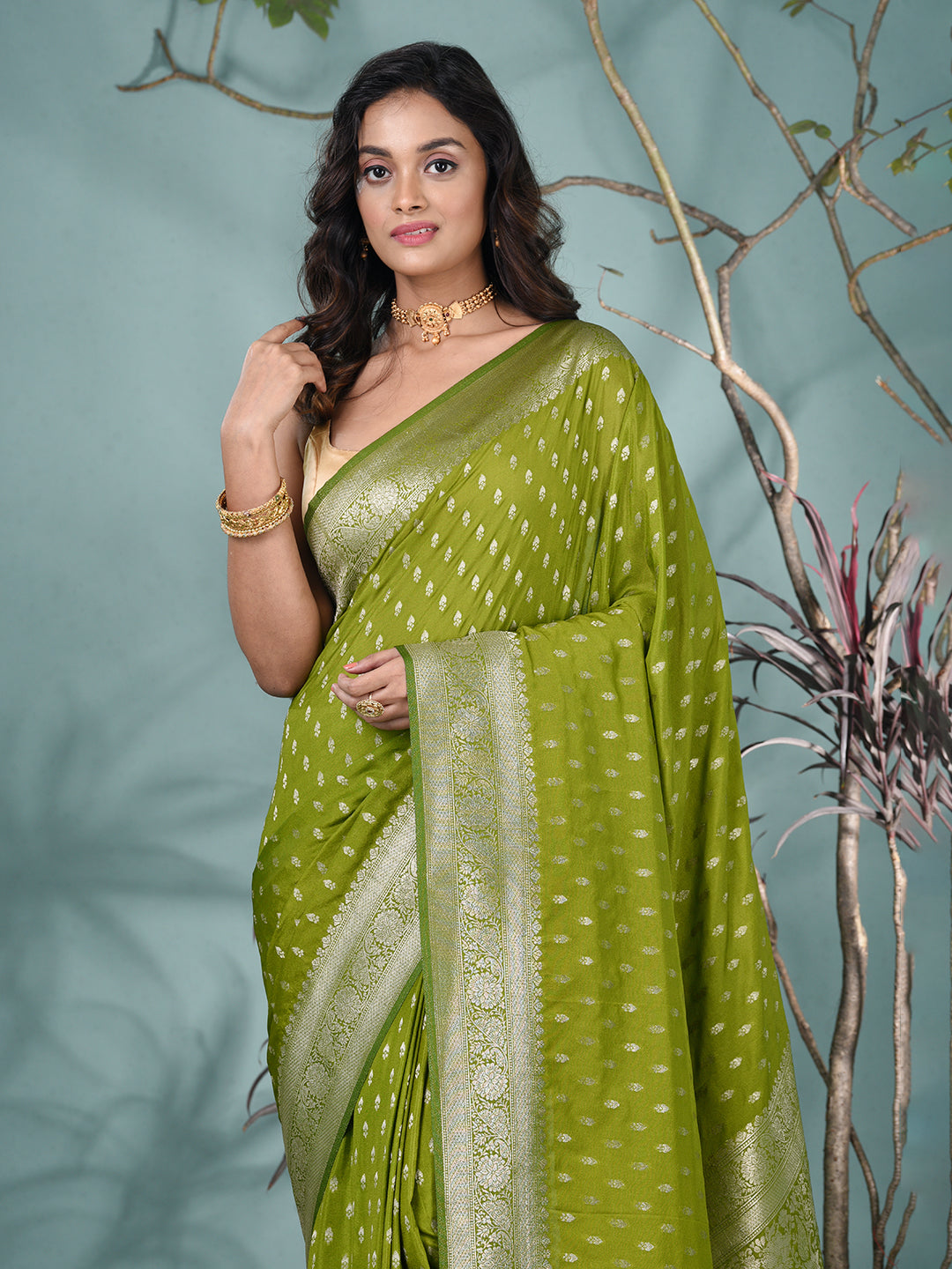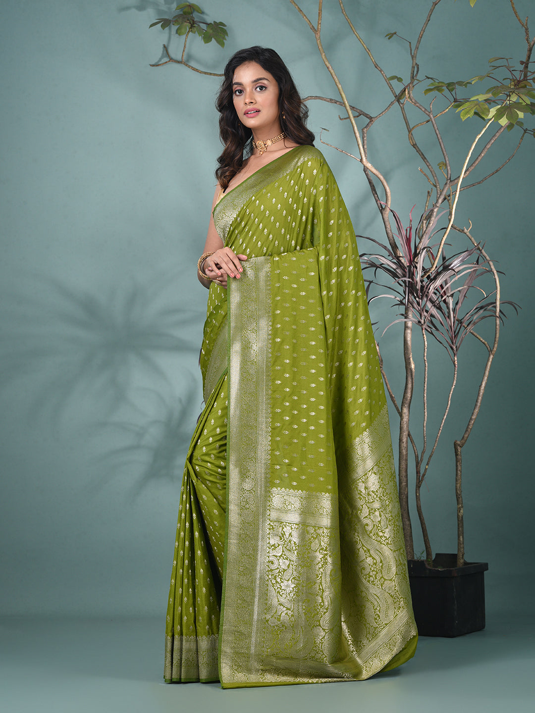 Elevate your elegance with this exquisite Green Georgette Saree, designed for every special occasion. The soft, flowing georgette fabric ensures a comfortable and flattering drape, while the subtle green hue adds a touch of grace. The saree is beautifully enhanced with intricate silver zari work along the borders, creating a stunning contrast that adds sophistication and charm. This saree comes with a matching blouse piece, making it a complete ensemble for your next festive or wedding event. Perfect for traditional celebrations, receptions, or upscale gatherings, this saree exudes timeless beauty and understated luxury.