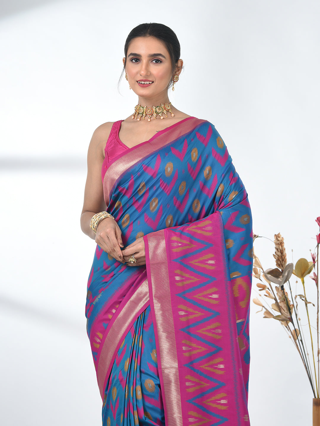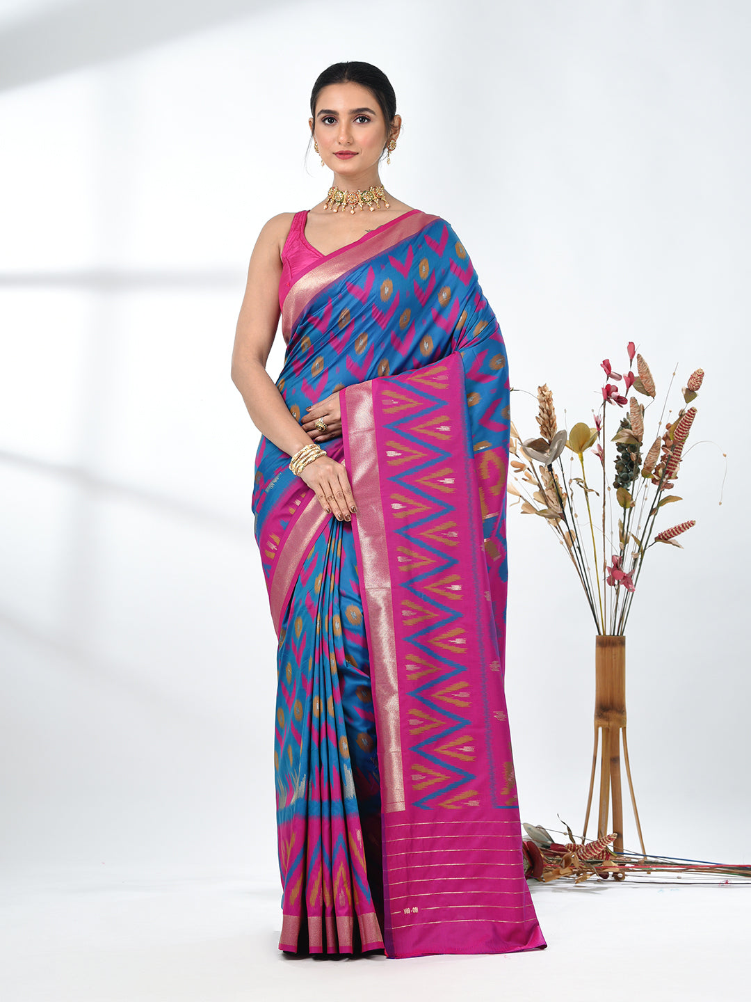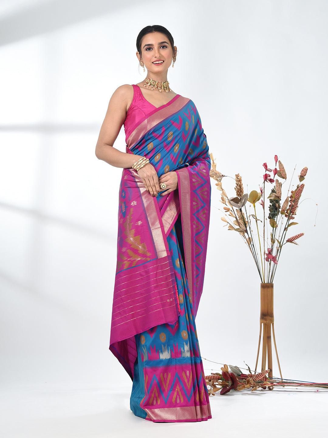 Celebrate tradition with a touch of elegance in this stunning Pochampally Silk Saree. The rich Peacock Blue hue forms a beautiful backdrop for the intricate and colorful Ikat patterns, weaving a tale of craftsmanship and heritage. The saree features bold geometric motifs in different shades of colors, creating a modern yet timeless appeal. Crafted from premium Pochampally silk, this saree offers a luxurious drape, perfect for weddings, festive occasions, or special celebrations. The golden zari border adds a regal touch, enhancing its overall charm. Pair it with matching jewelry and a statement blouse to complete your festive look.