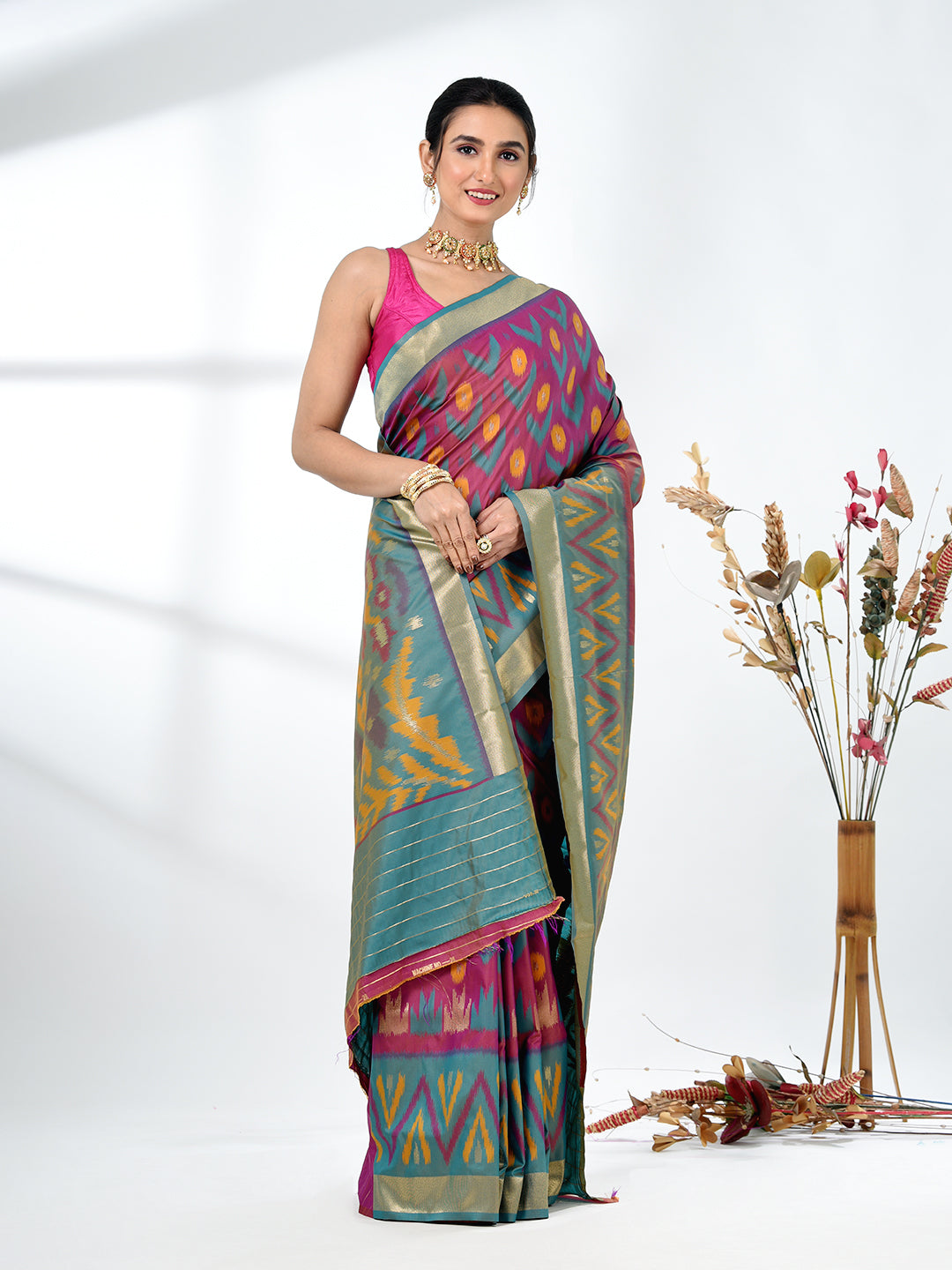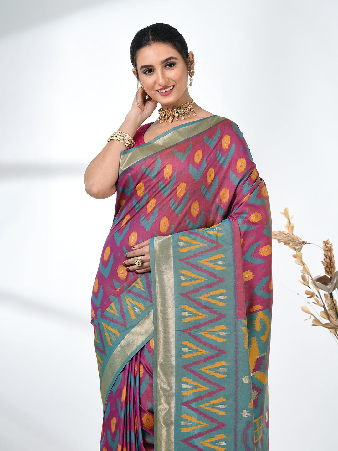 Celebrate tradition with a touch of elegance in this stunning Pochampally Silk Saree. The rich Purple hue forms a beautiful backdrop for the intricate and colorful Ikat patterns, weaving a tale of craftsmanship and heritage. The saree features bold geometric motifs in different shades of colors, creating a modern yet timeless appeal. Crafted from premium Pochampally silk, this saree offers a luxurious drape, perfect for weddings, festive occasions, or special celebrations. The golden zari border adds a regal touch, enhancing its overall charm. Pair it with matching jewelry and a statement blouse to complete your festive look.