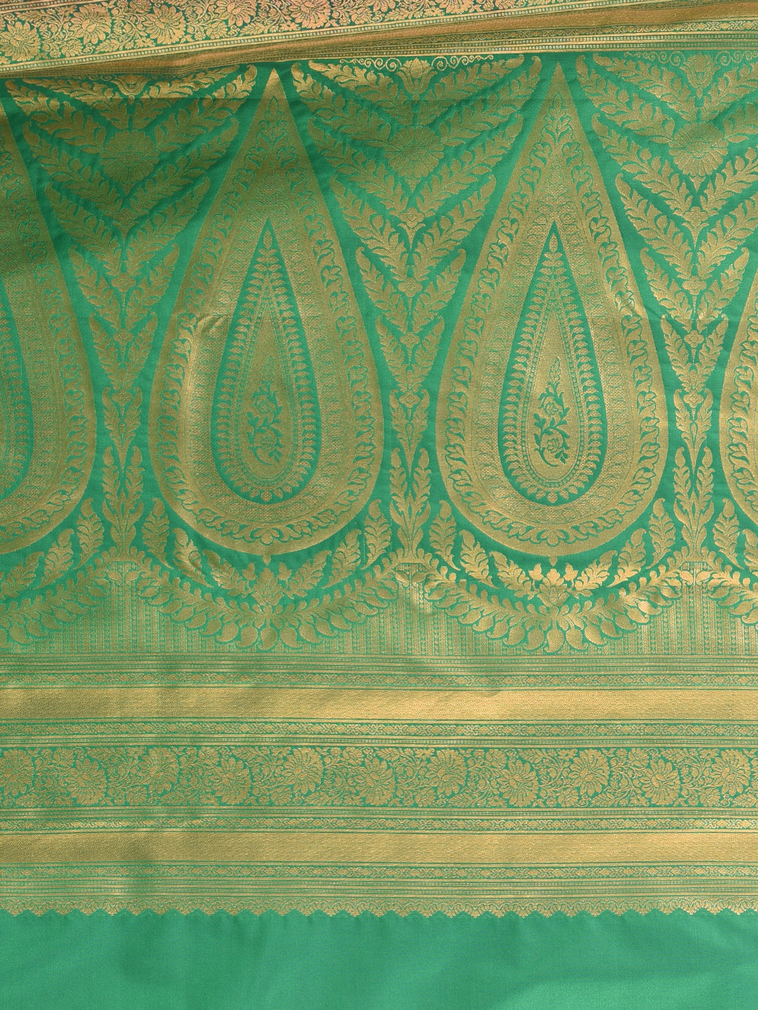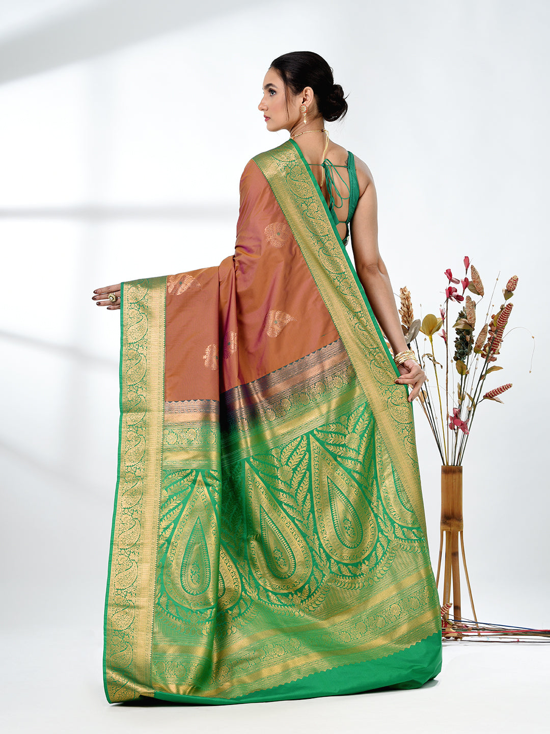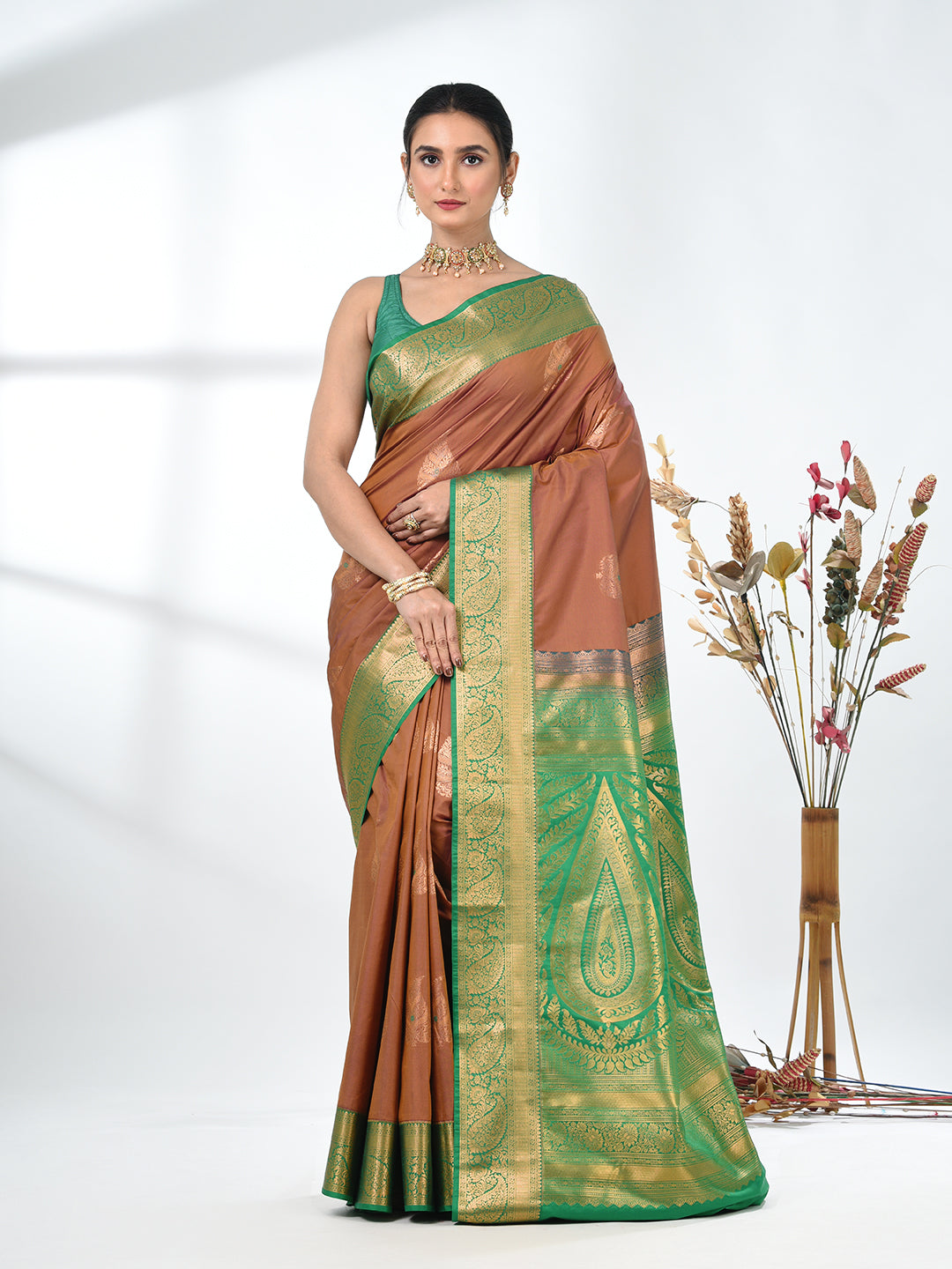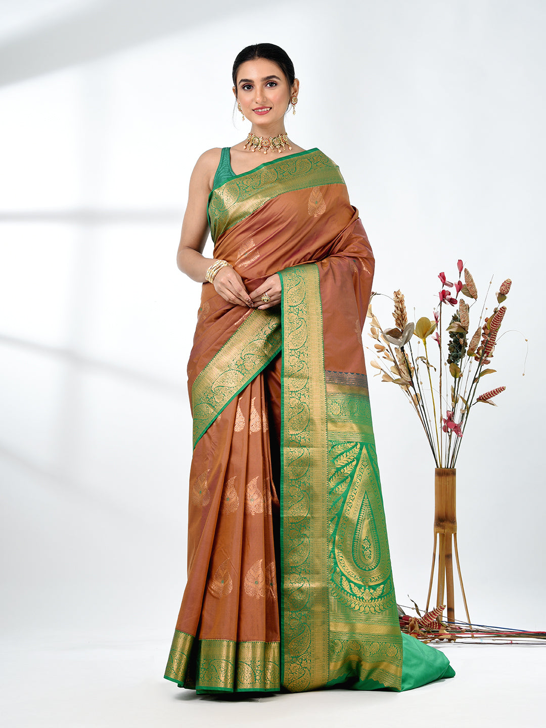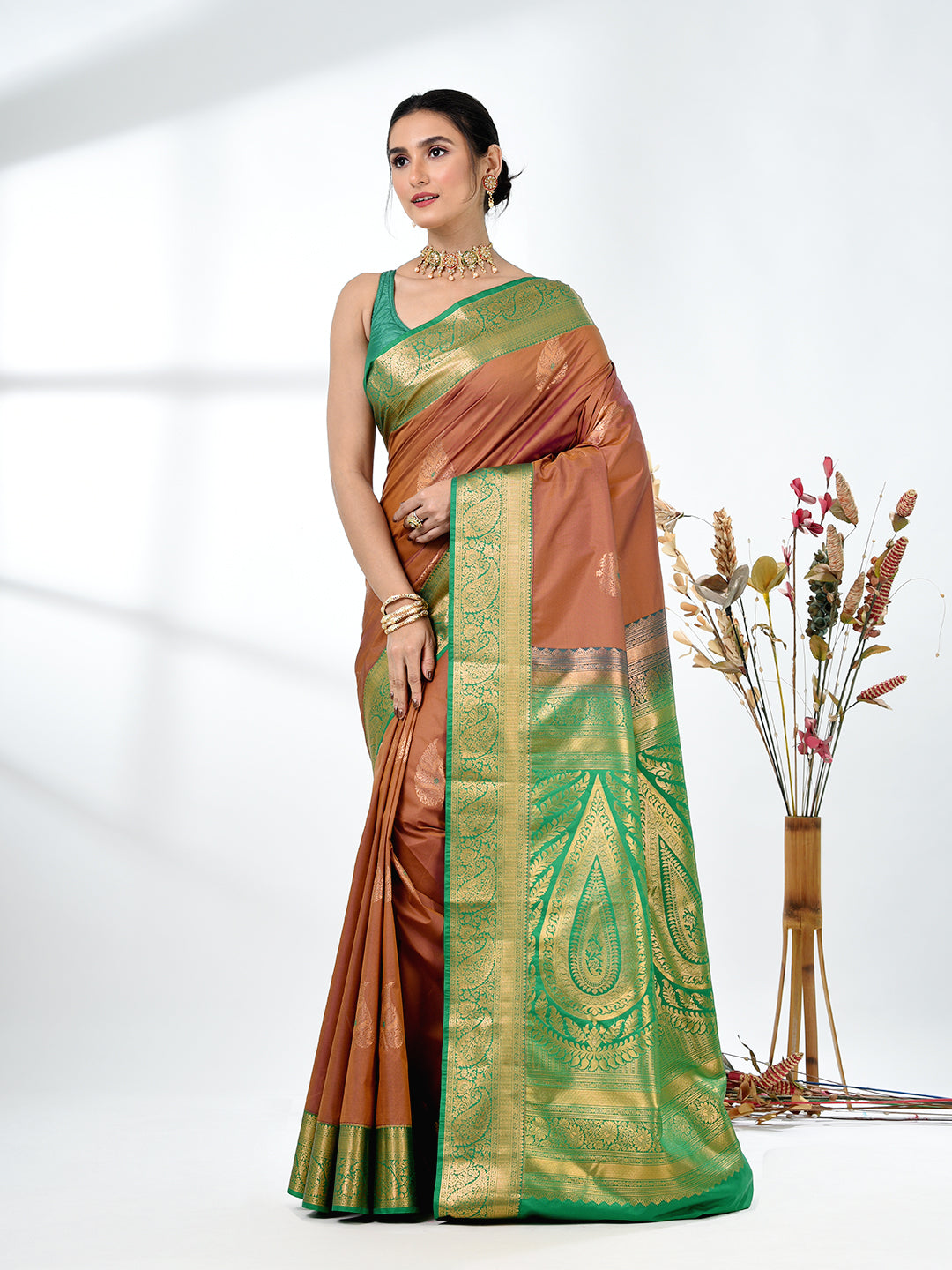Embrace timeless elegance with this exquisite Brown dual tone Pure South Silk Saree. The luxurious fabric offers a soft and radiant drape, enhancing the grace of the wearer. The saree features intricate zari work throughout, with a stunning contrast of green at the border, adding a regal touch. The rich golden zari motifs and detailed floral designs in the border further elevate its beauty, making it the perfect choice for weddings, festivals, and special occasions. The fine quality South Silk fabric ensures comfort and sophistication, while the bold color combination creates a striking and elegant look. Pair it with traditional jewelry and a sleek blouse to complete your festive look.