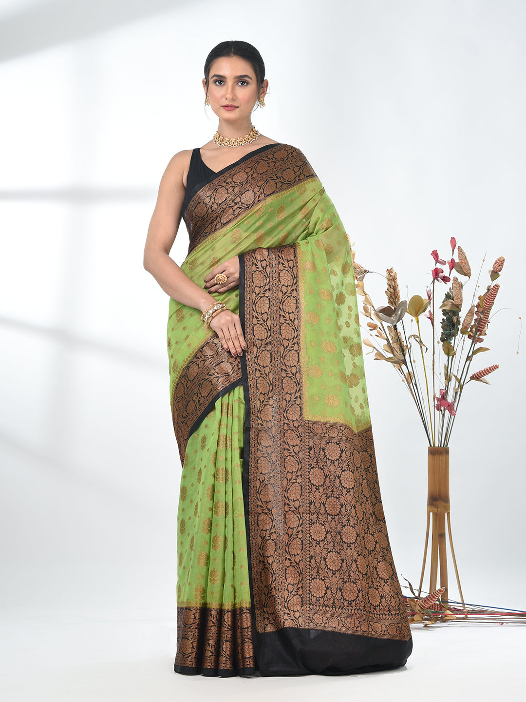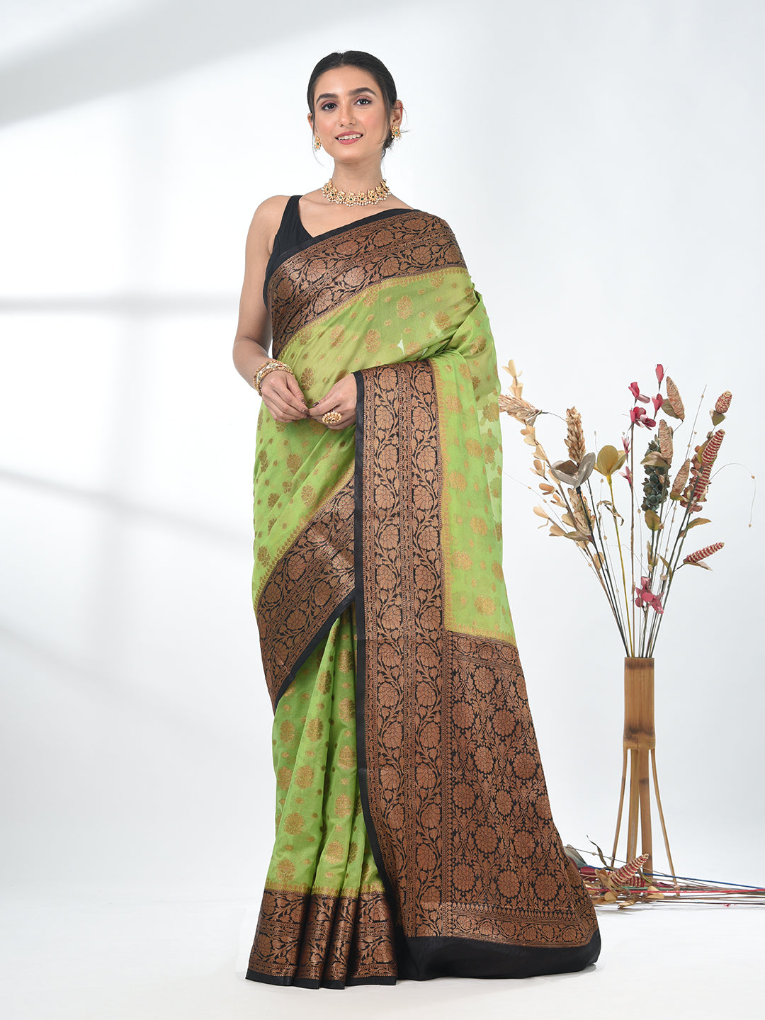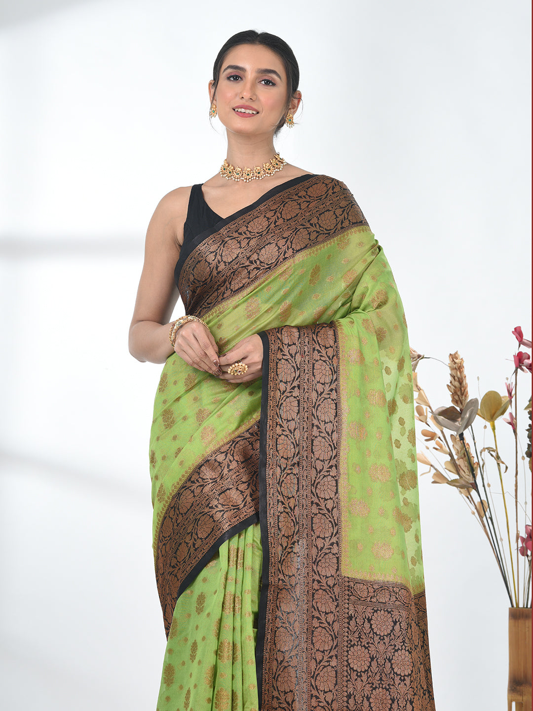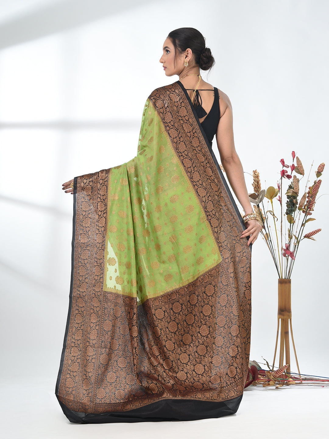 This stunning green georgette saree exudes elegance with its intricate floral motifs and rich black and gold border. The luxurious georgette fabric drapes beautifully, offering both comfort and style. Ideal for weddings, parties, or any festive occasion, this saree blends tradition with modern flair. The combination of bold black with the vibrant red and gold makes it a standout piece for any special event. Pair it with a red blouse and statement jewelry for a complete look.