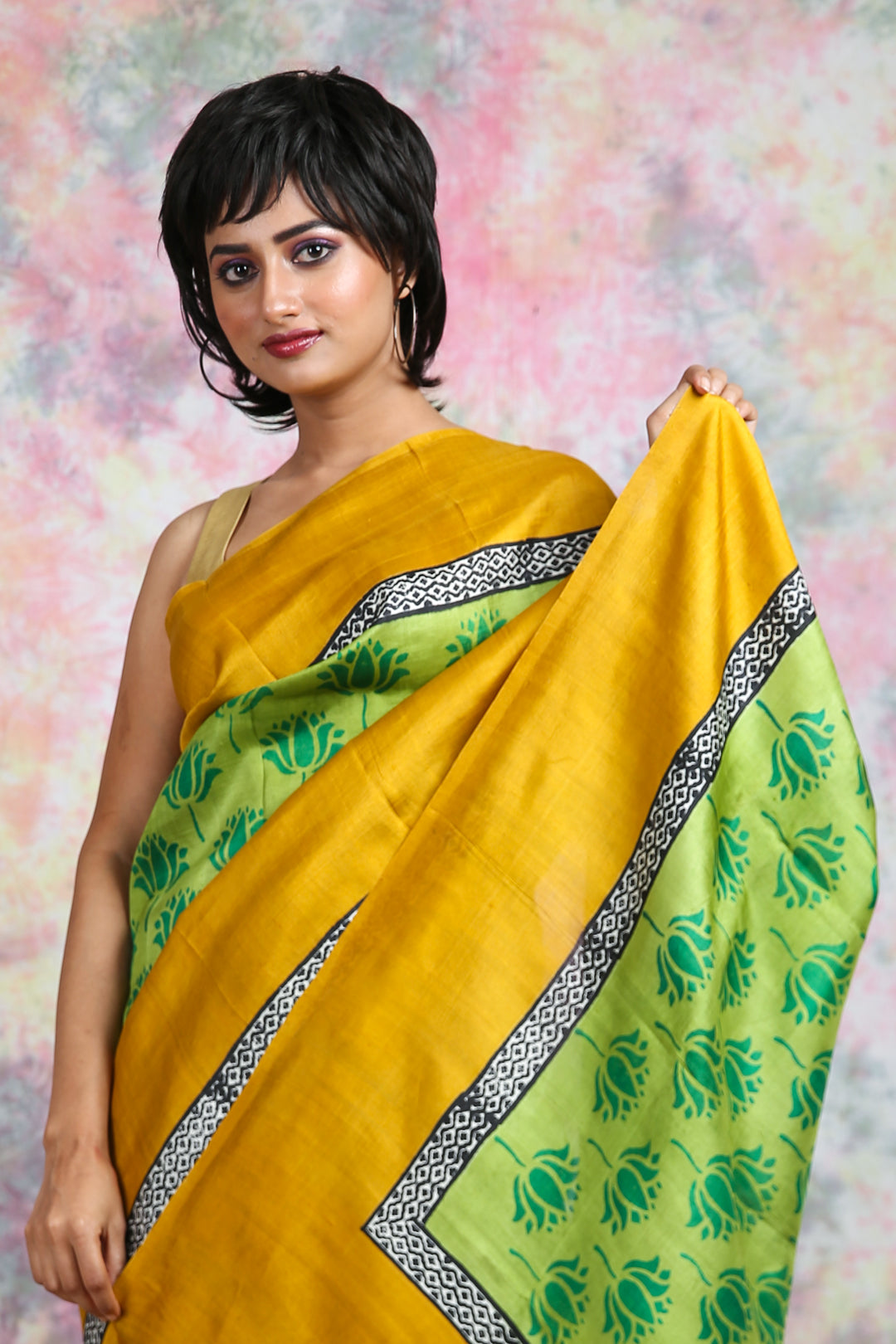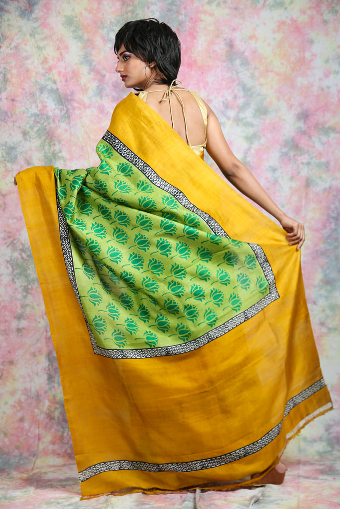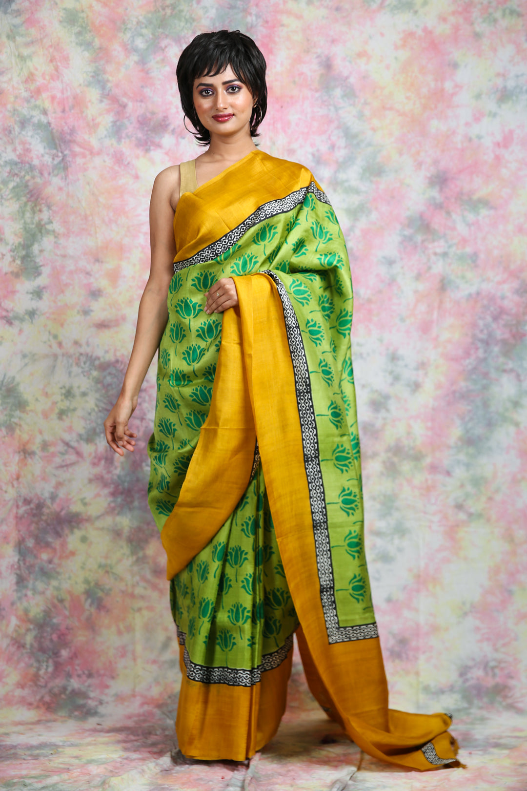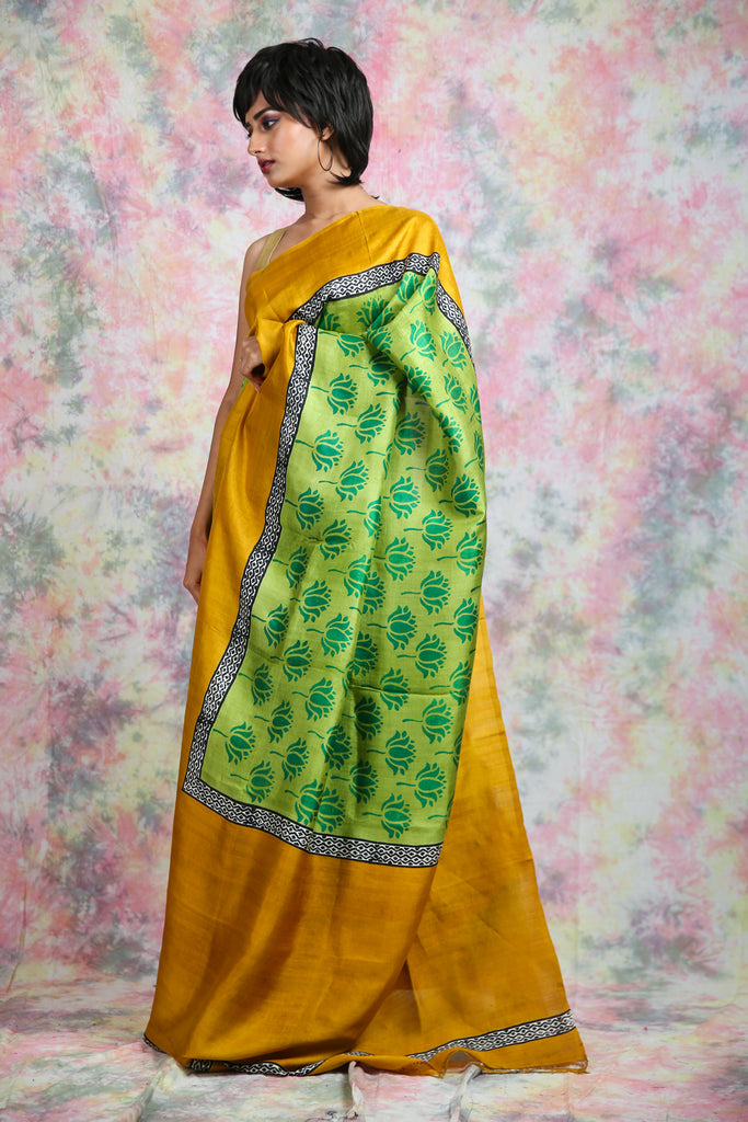 Bring home the charm of traditional elegance with this pure silk saree in a refreshing green and mustard combination. The body features artistic green floral-inspired prints on a soft silk base, while the mustard pallu and pleats add a vibrant contrast. Accentuated with a black printed border, this saree offers a perfect balance of sophistication and cultural artistry. Its lightweight texture and lustrous drape make it ideal for festive gatherings, cultural occasions, and casual celebrations.