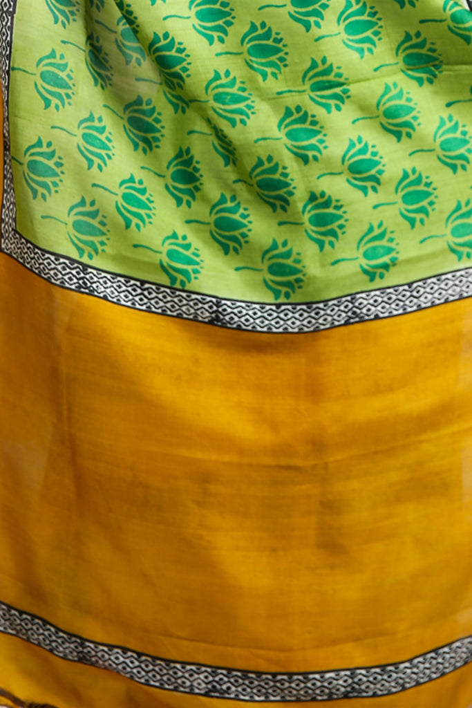 Green & Mustard Pure Silk Saree with Black Printed Border