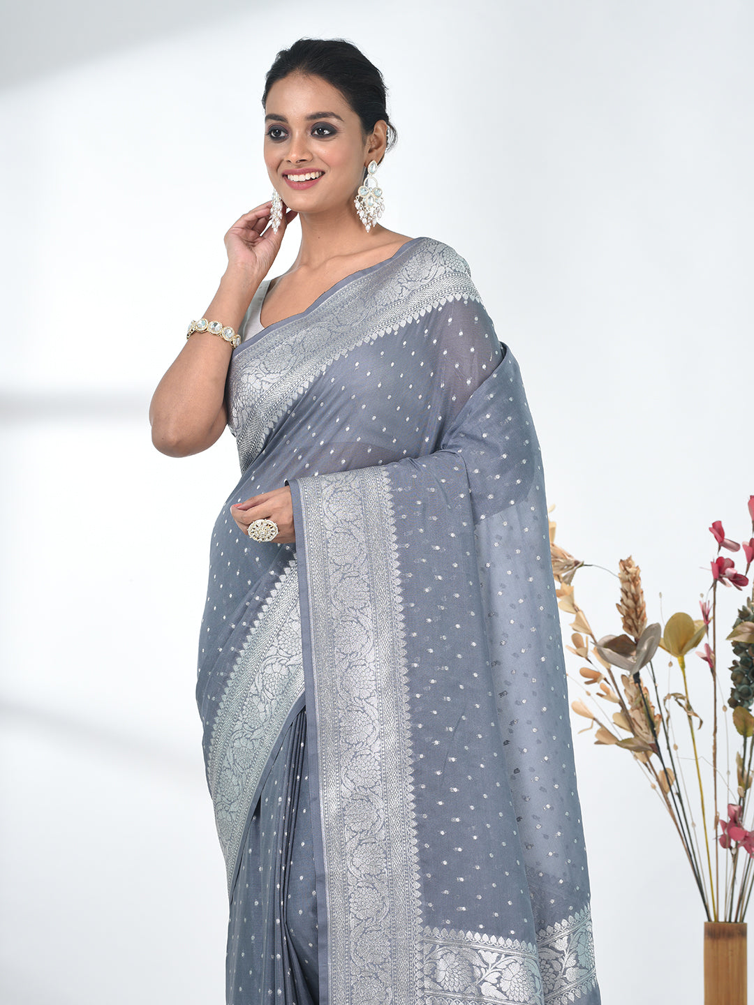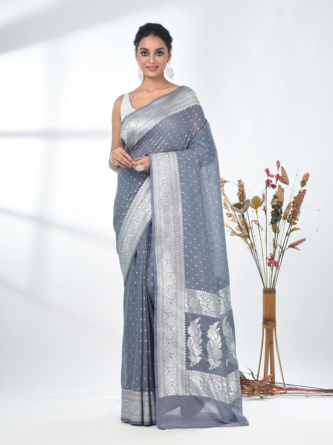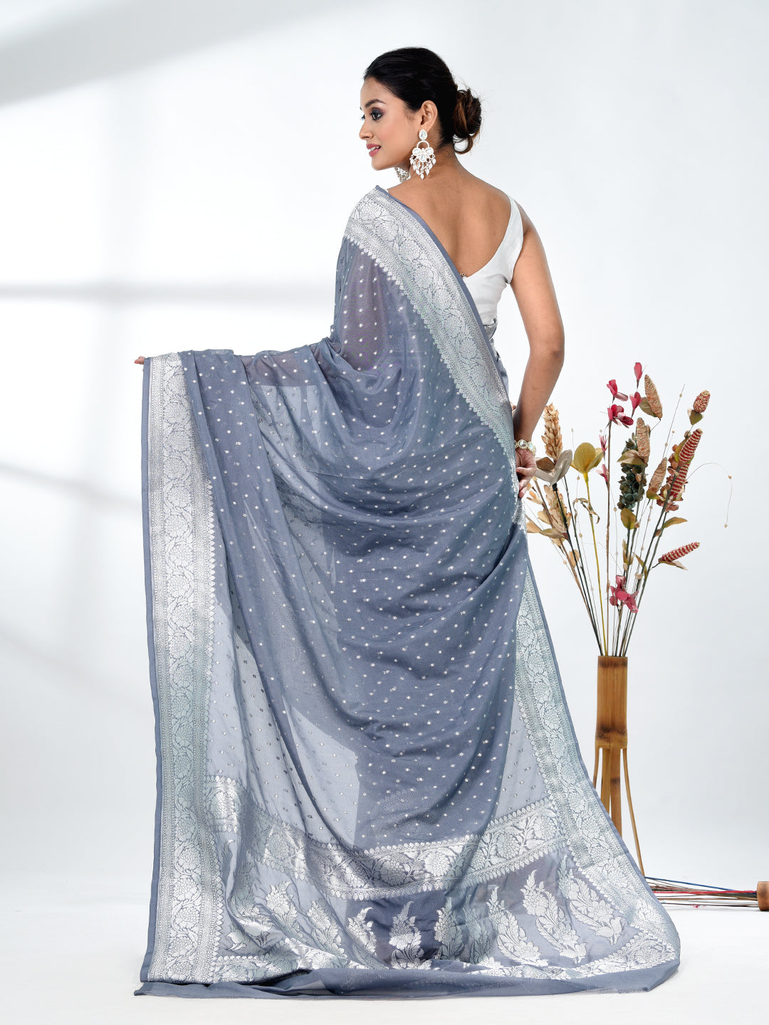 This elegant Grey Georgette Blend Saree is a perfect blend of tradition and modern sophistication. Crafted from high-quality georgette fabric, it drapes beautifully, ensuring both comfort and style. The saree features a rich, vibrant grey color, complemented by intricate silver embroidery along the borders and a delicate pattern throughout, adding a touch of glamour. The shimmering details elevate the overall look, making it ideal for weddings, parties, and festive occasions. Pair it with statement jewelry and heels for a standout ensemble that exudes grace and charm.