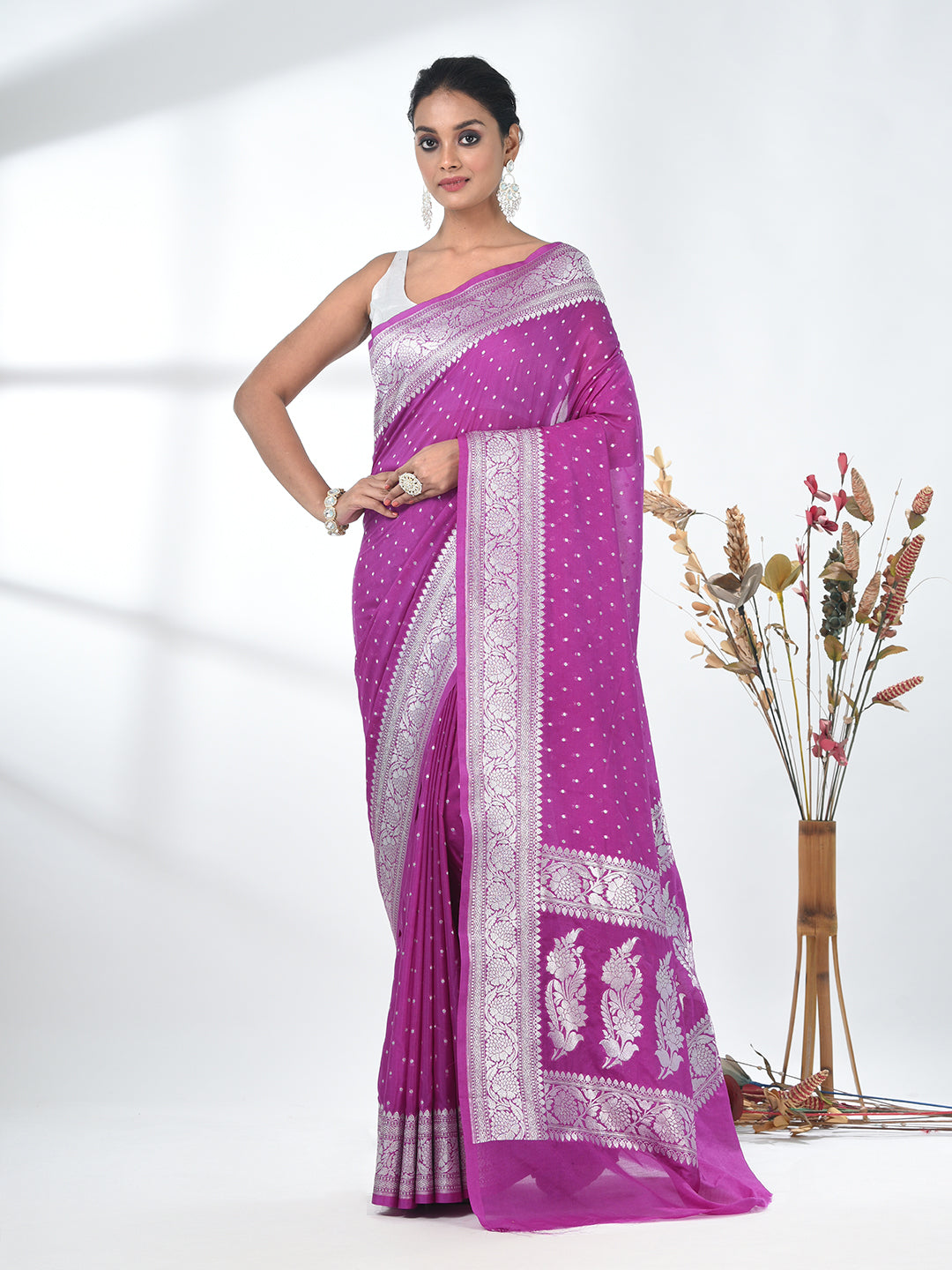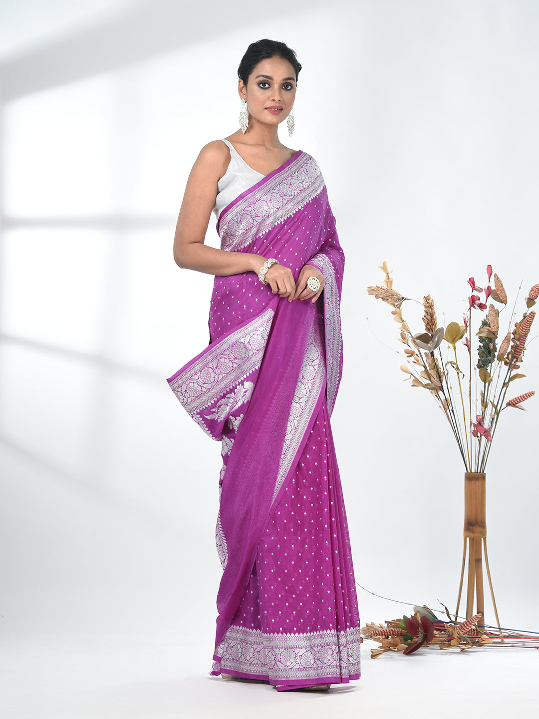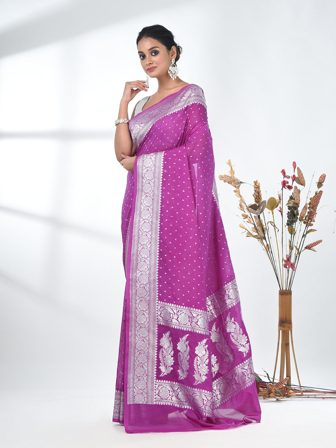 This elegant Purple Georgette Blend Saree is a perfect blend of tradition and modern sophistication. Crafted from high-quality georgette fabric, it drapes beautifully, ensuring both comfort and style. The saree features a rich, vibrant purple color, complemented by intricate silver embroidery along the borders and a delicate pattern throughout, adding a touch of glamour. The shimmering details elevate the overall look, making it ideal for weddings, parties, and festive occasions. Pair it with statement jewelry and heels for a standout ensemble that exudes grace and charm.