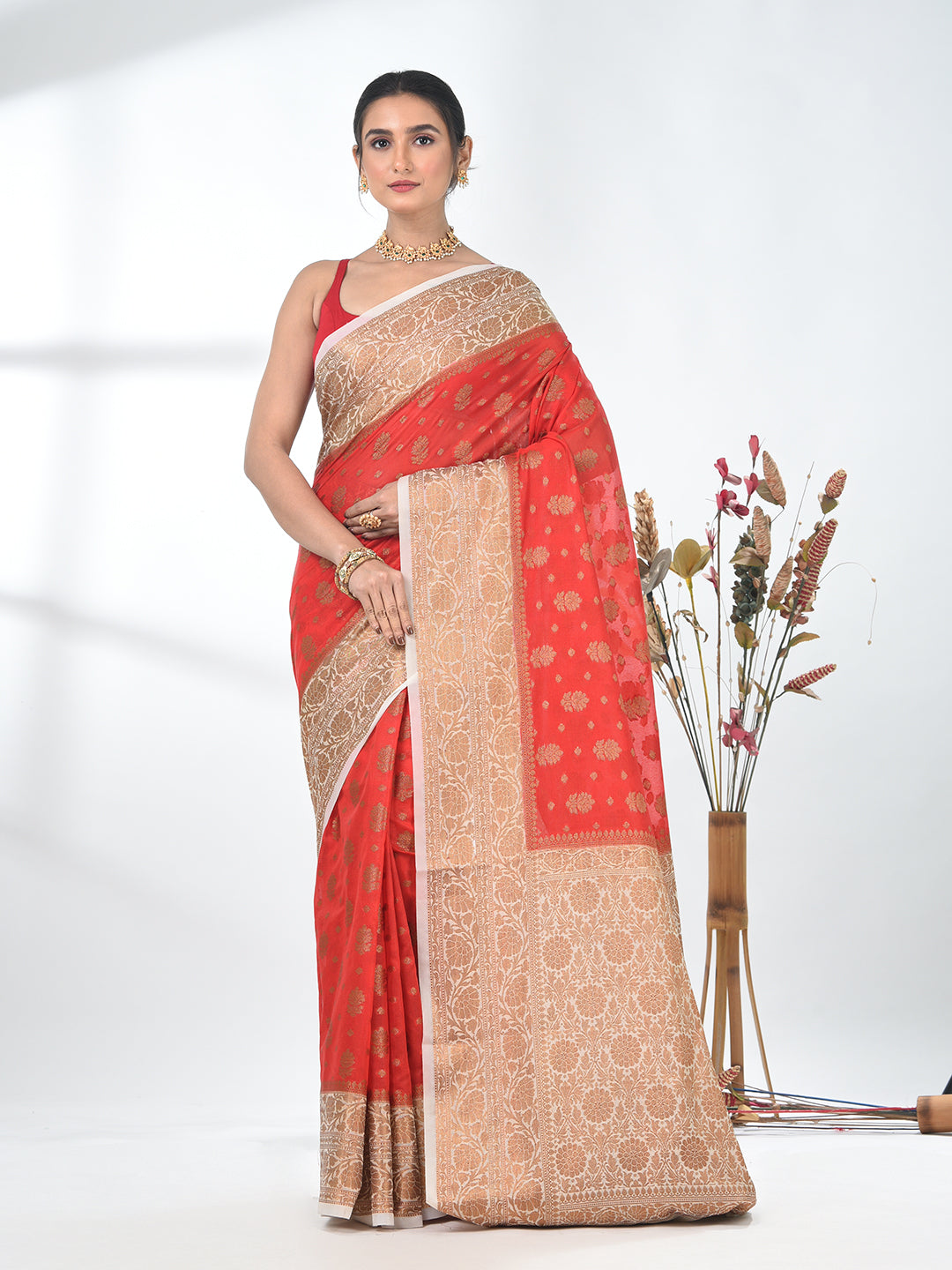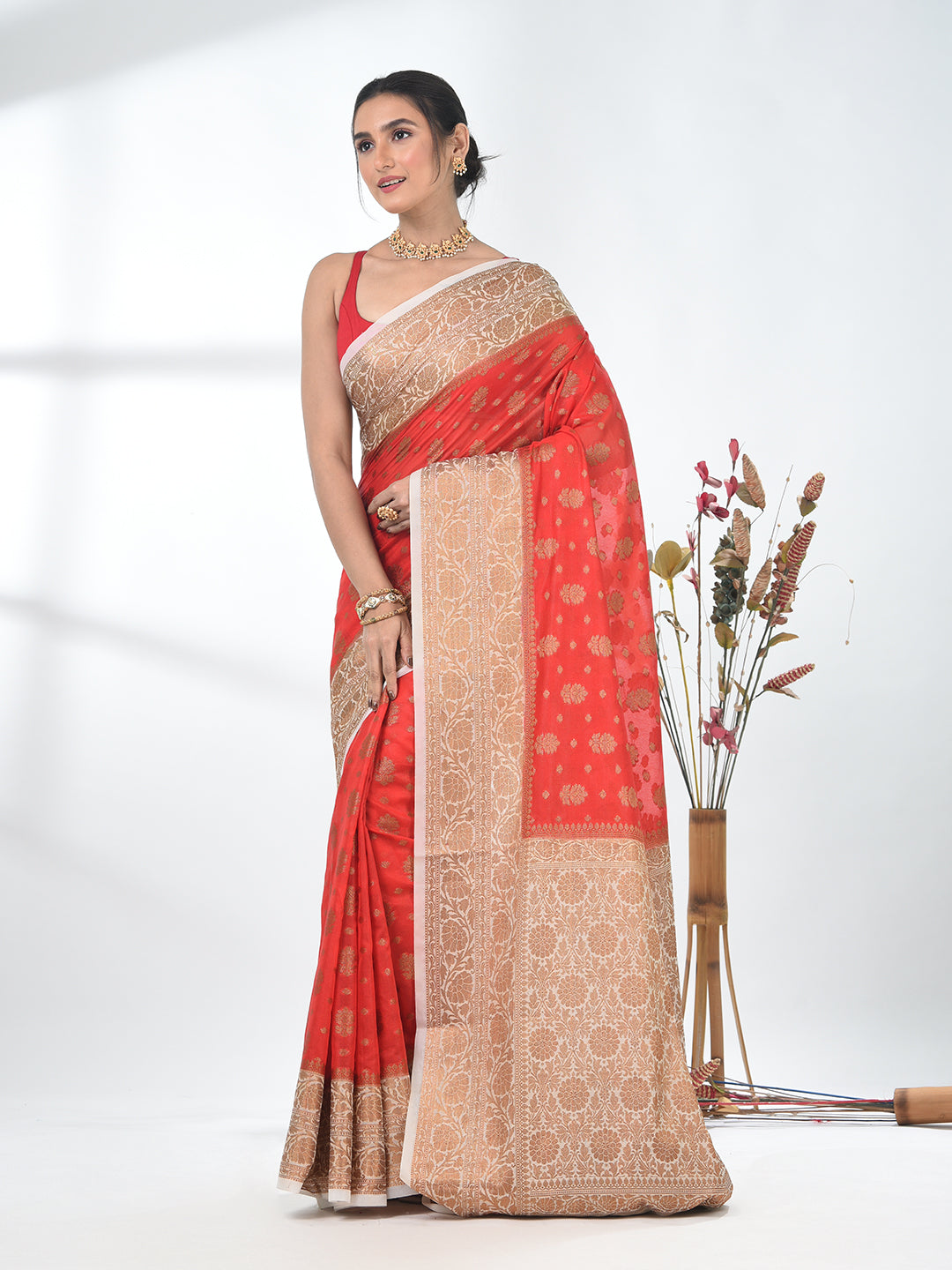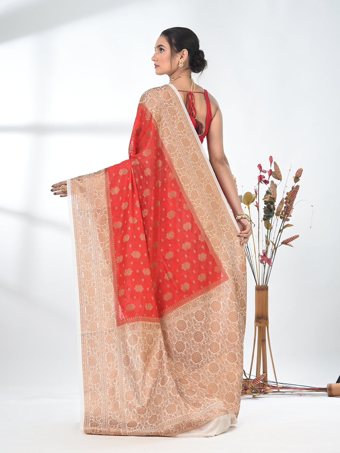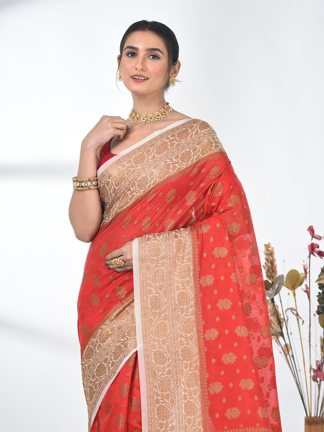 This stunning red georgette saree exudes elegance with its intricate floral motifs and rich white and gold border. The luxurious georgette fabric drapes beautifully, offering both comfort and style. Ideal for weddings, parties, or any festive occasion, this saree blends tradition with modern flair. The combination of bold black with the vibrant red and gold makes it a standout piece for any special event. Pair it with a red blouse and statement jewelry for a complete look.
