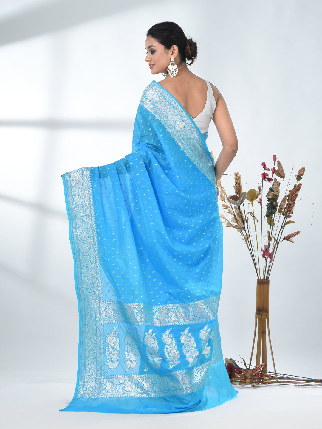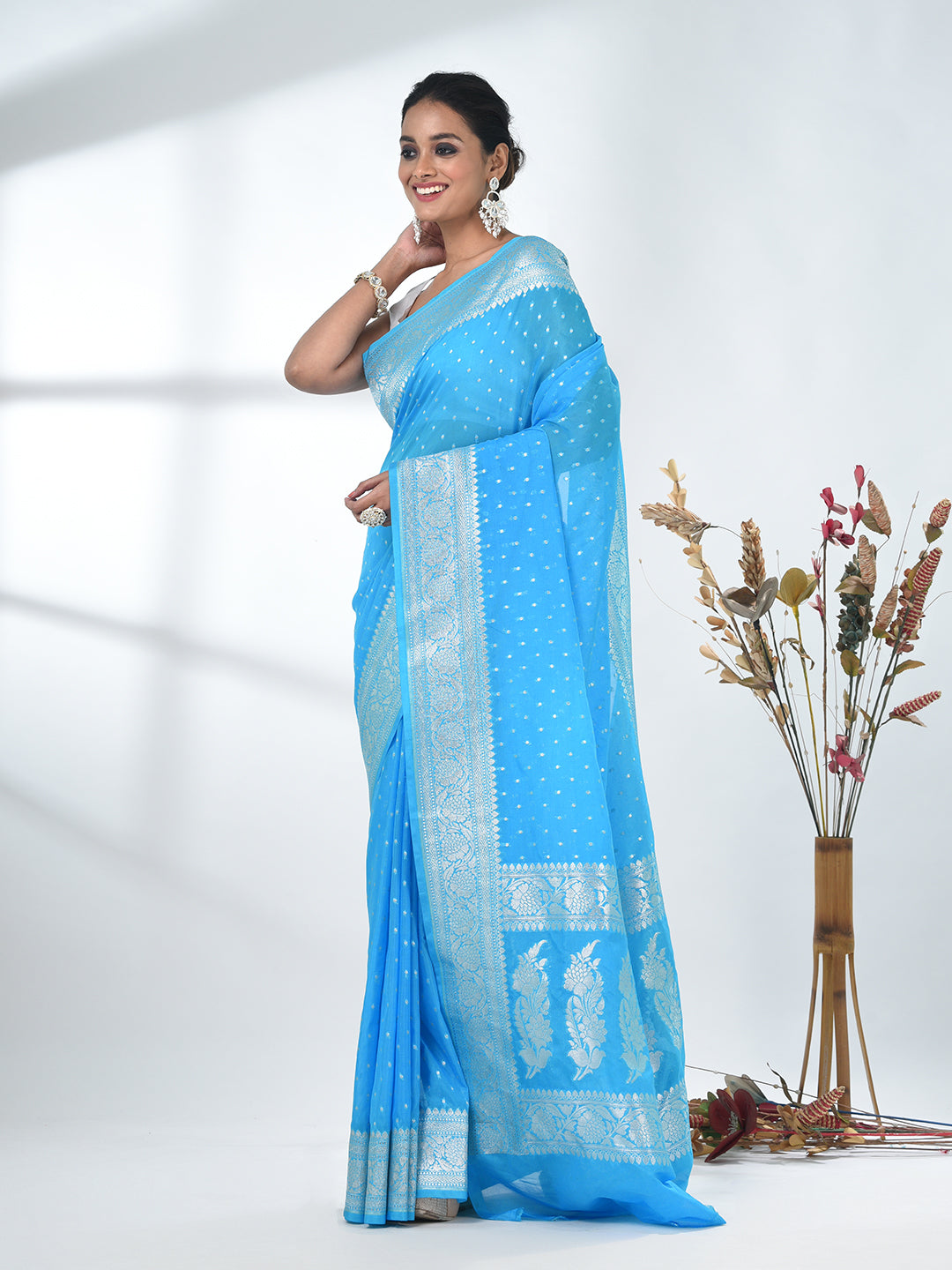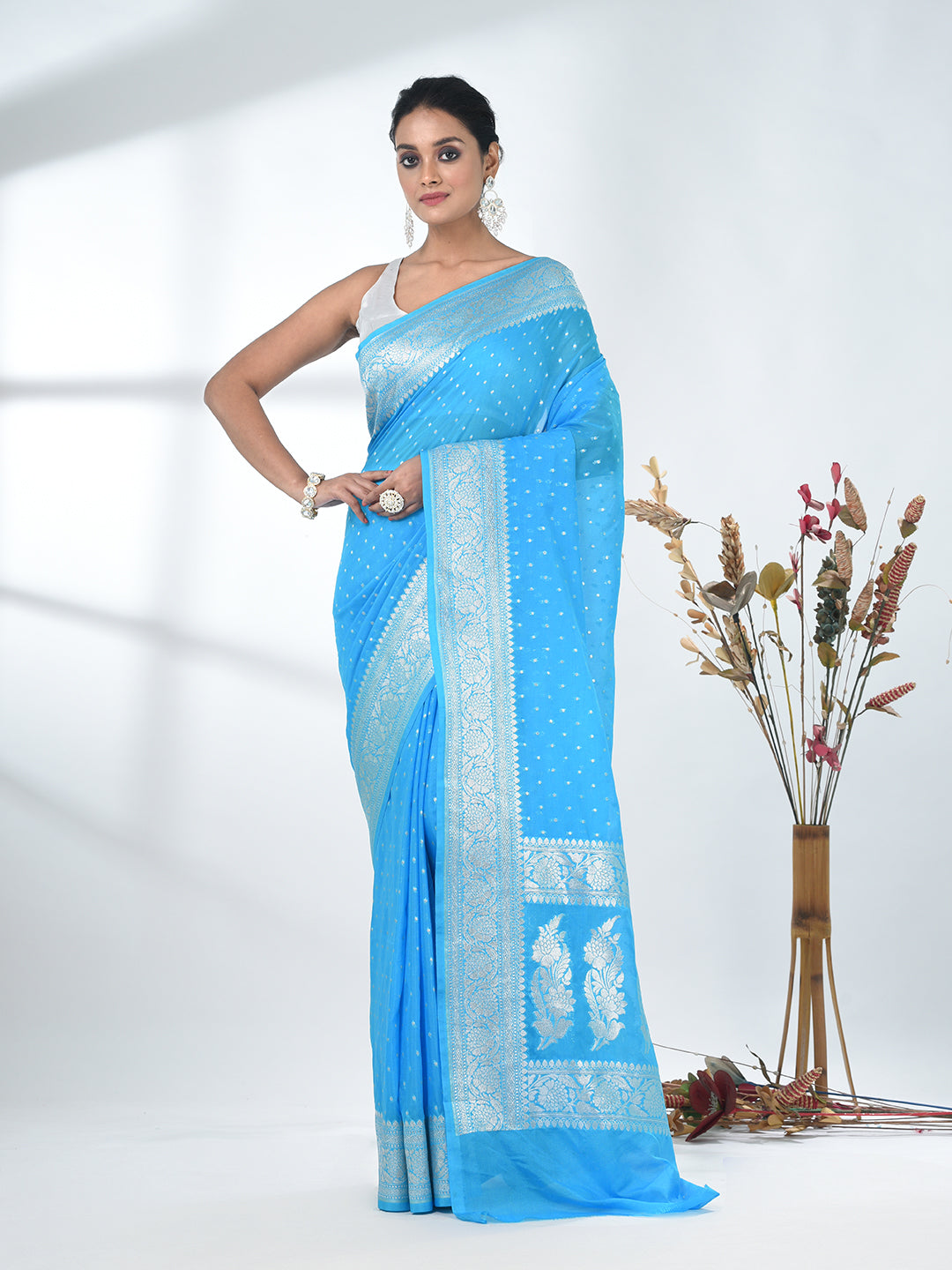 Sky Blue Georgette Saree with Silver Border and Detailing