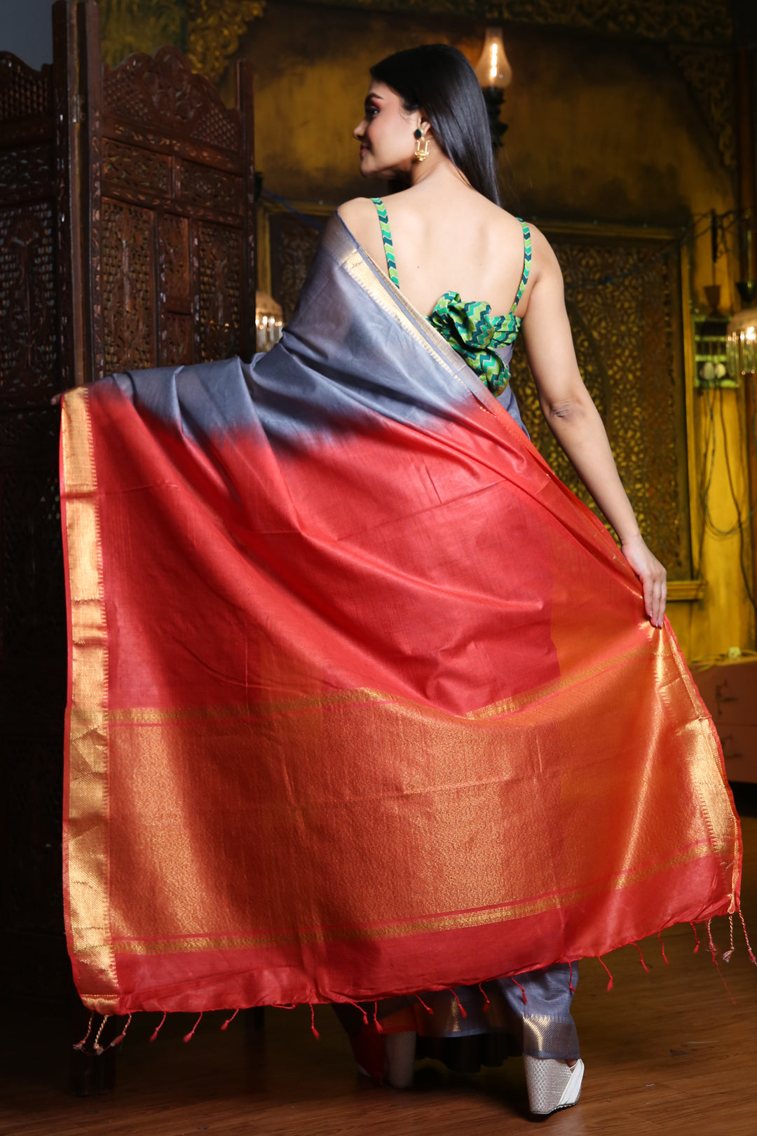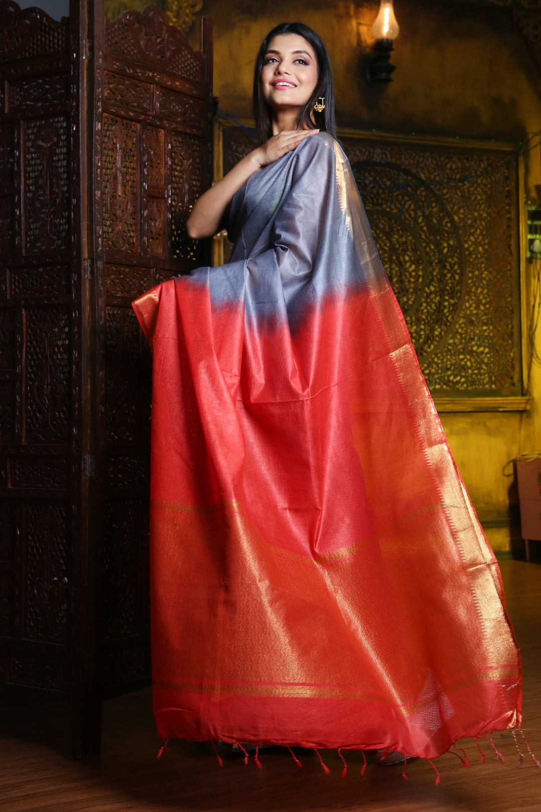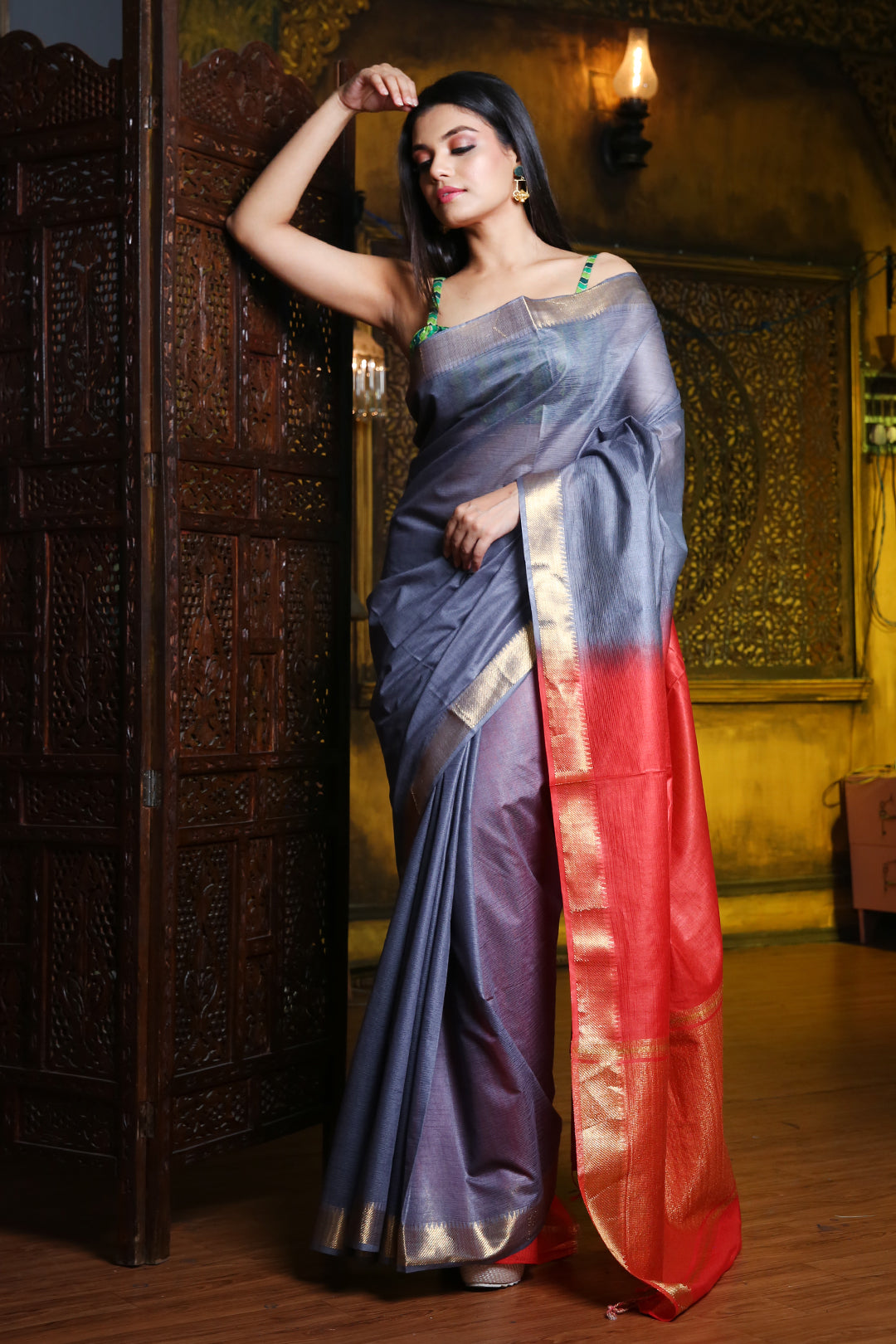 Gracefully charming is what you will look in this bluish grey silk blend saree. It has zari borders with small temple patterns. The red pallu has bold zari stripes to bring the whole look together.