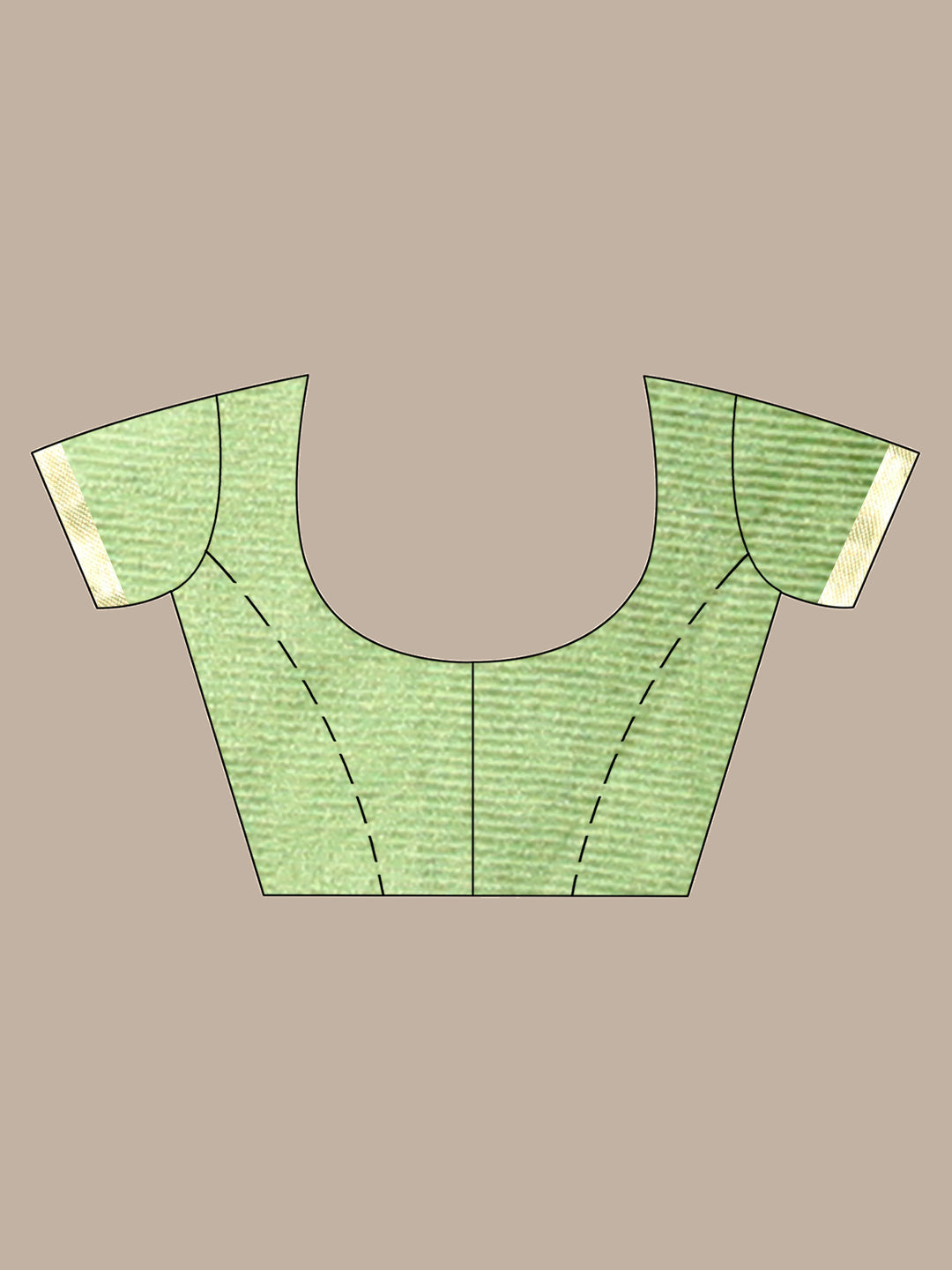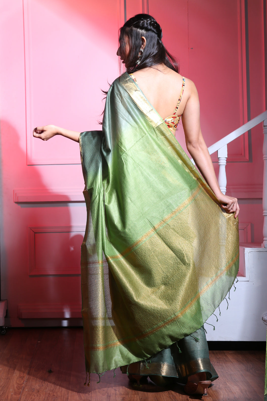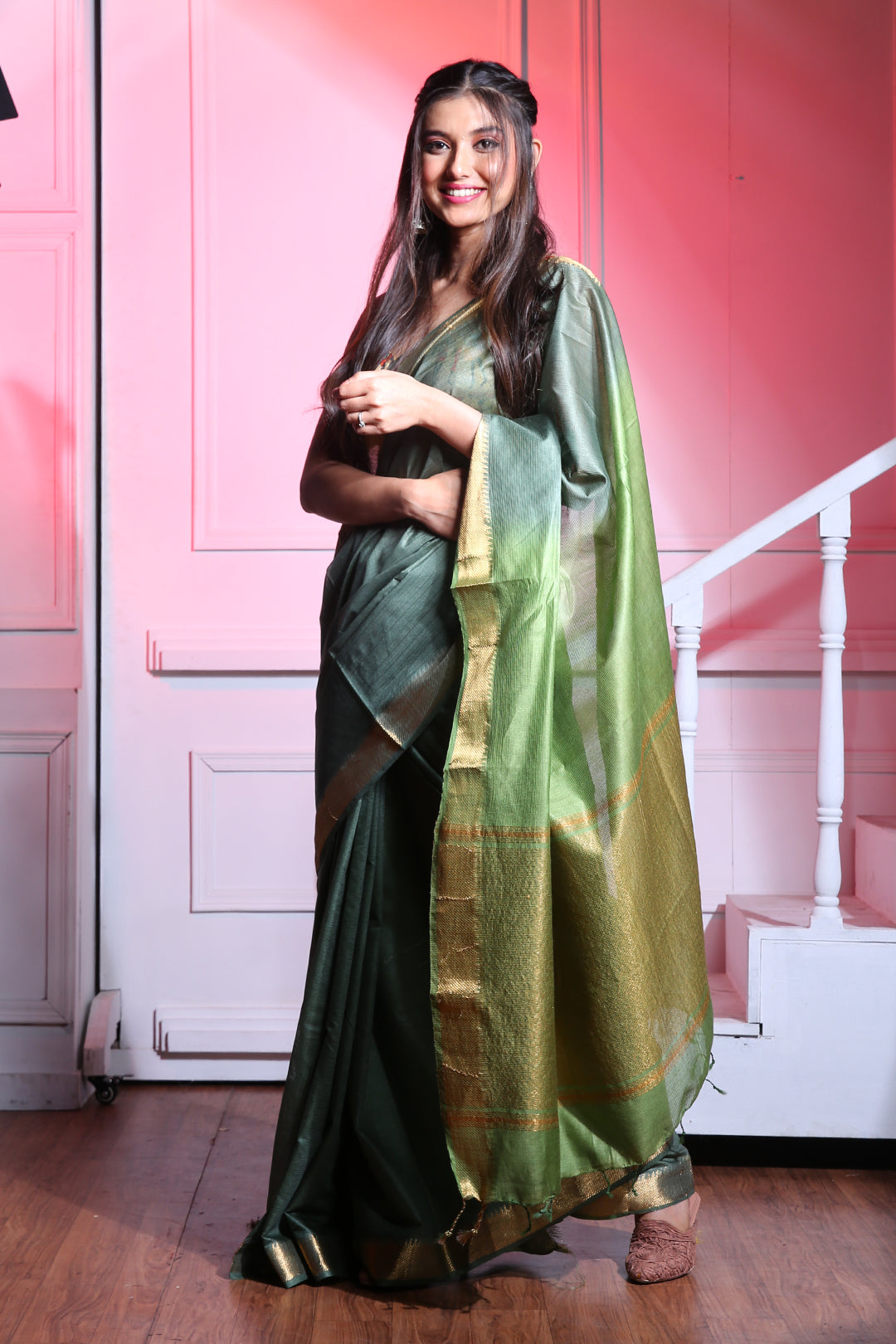 Look graceful in this green silk blend saree. It has zari borders with temple patterns. The green pallu has woven zari stripes to complete the look.