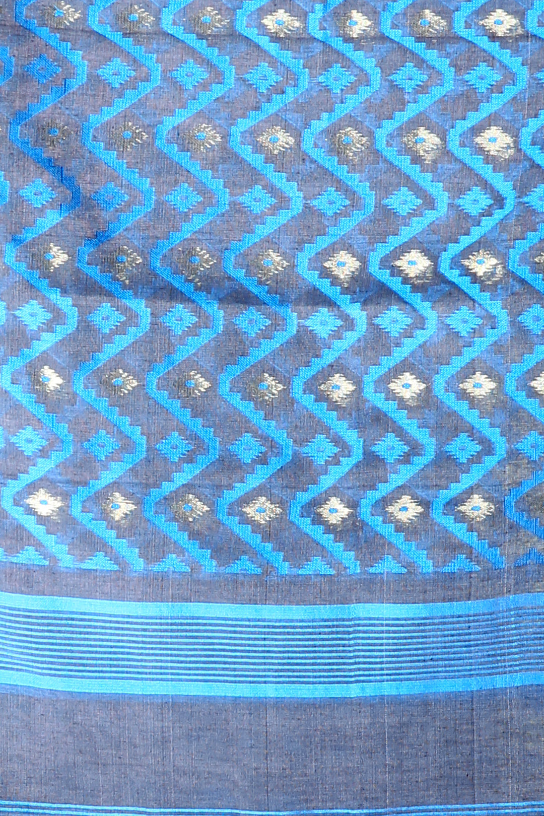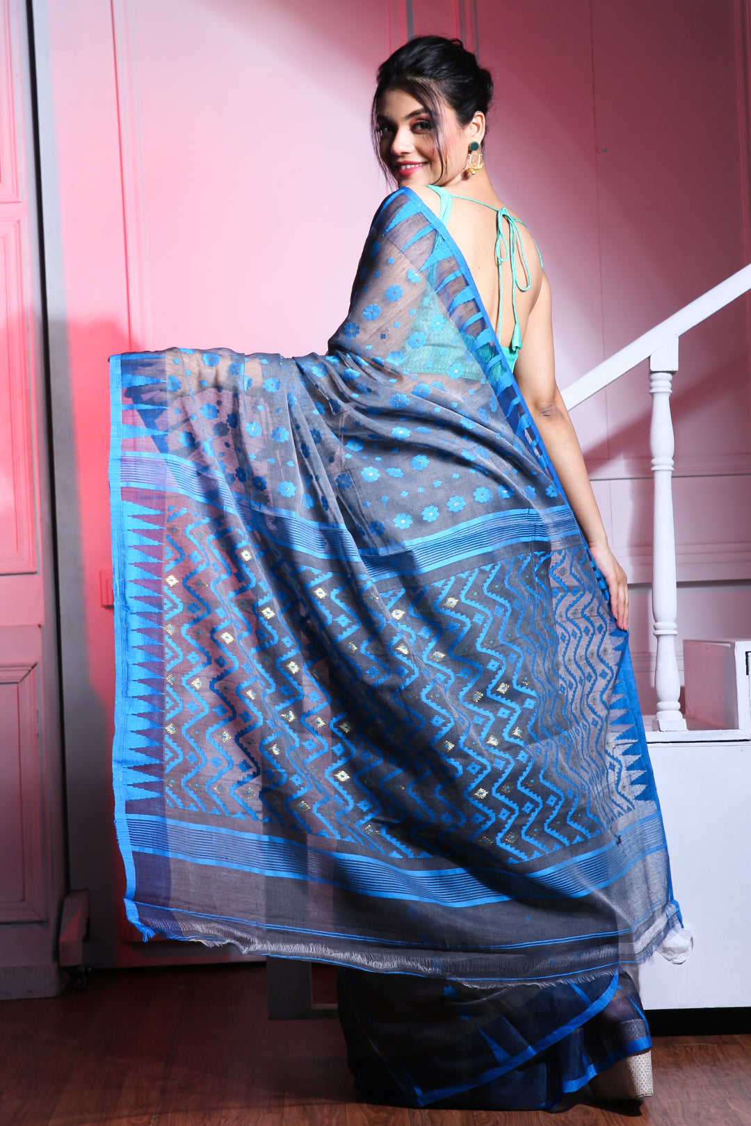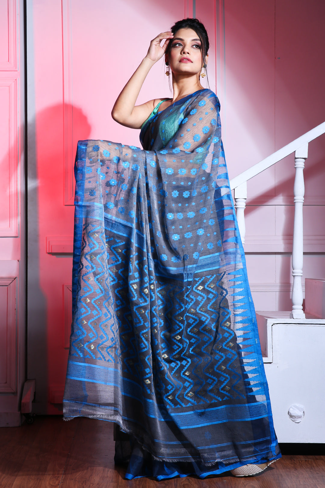 Charcoal Grey & Blue Cotton Silk Jamdani Saree