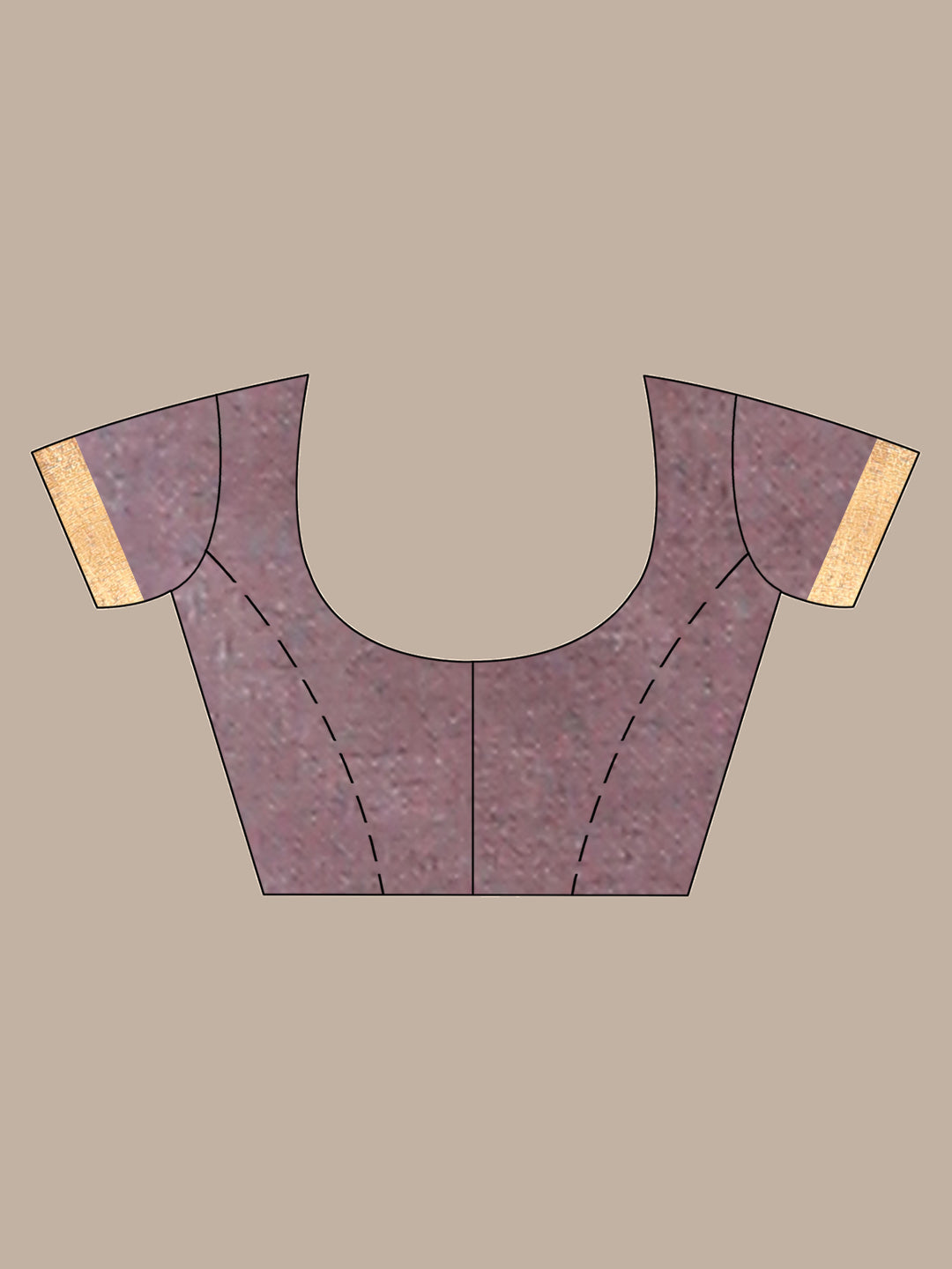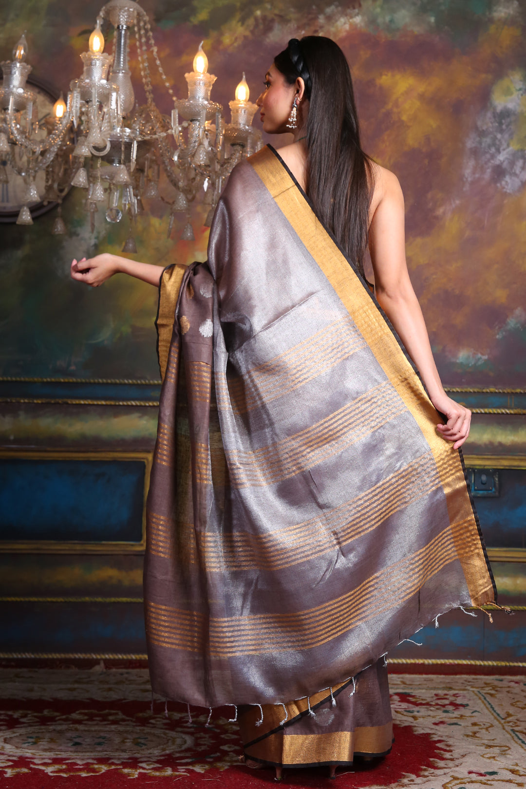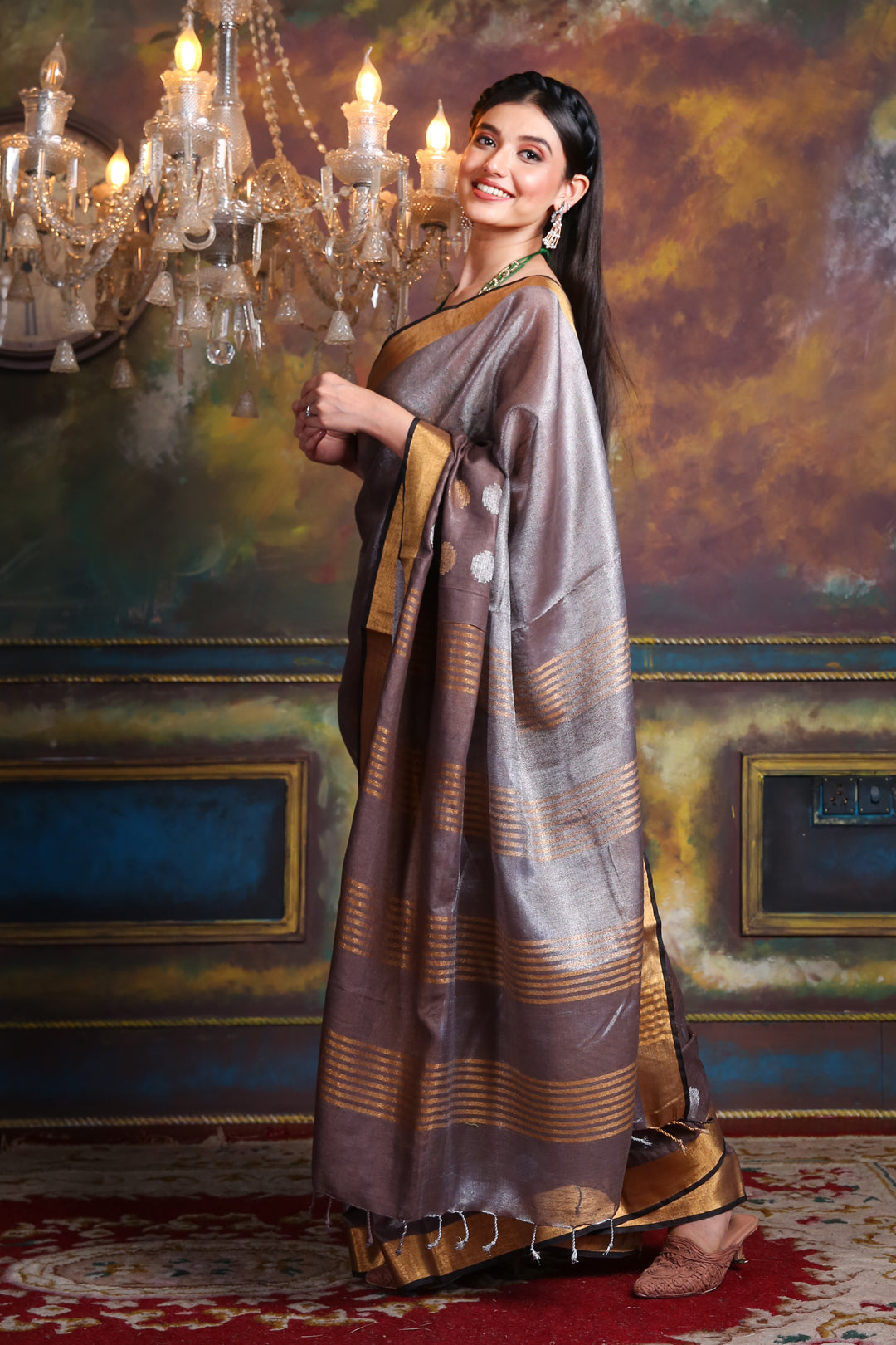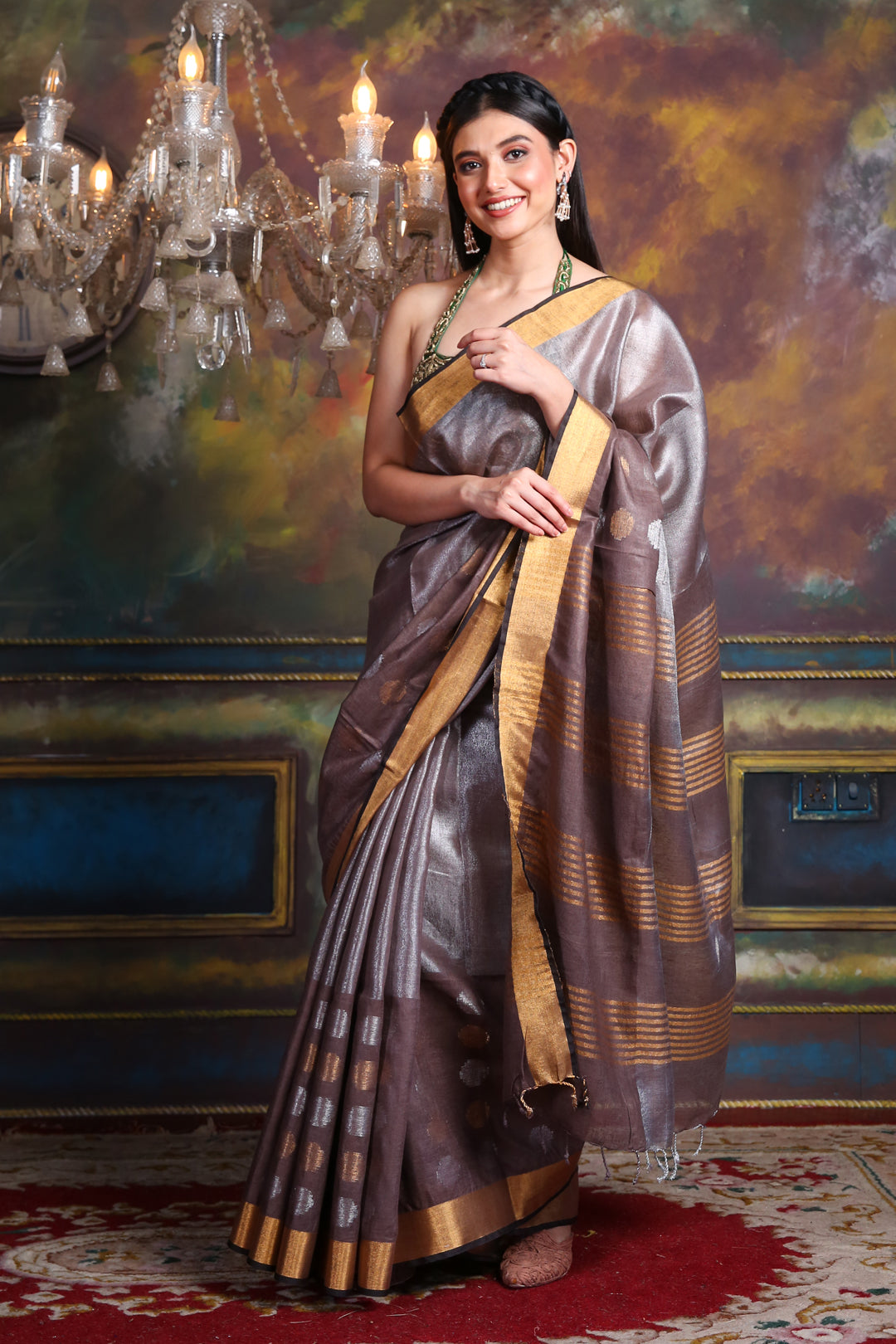 Get an urban and polished look in this grey tissue saree. It has brown and zari woven borders with thin black stripes. The lower portion has round motifs woven. The brown pallu has woven stripes to complete the look.