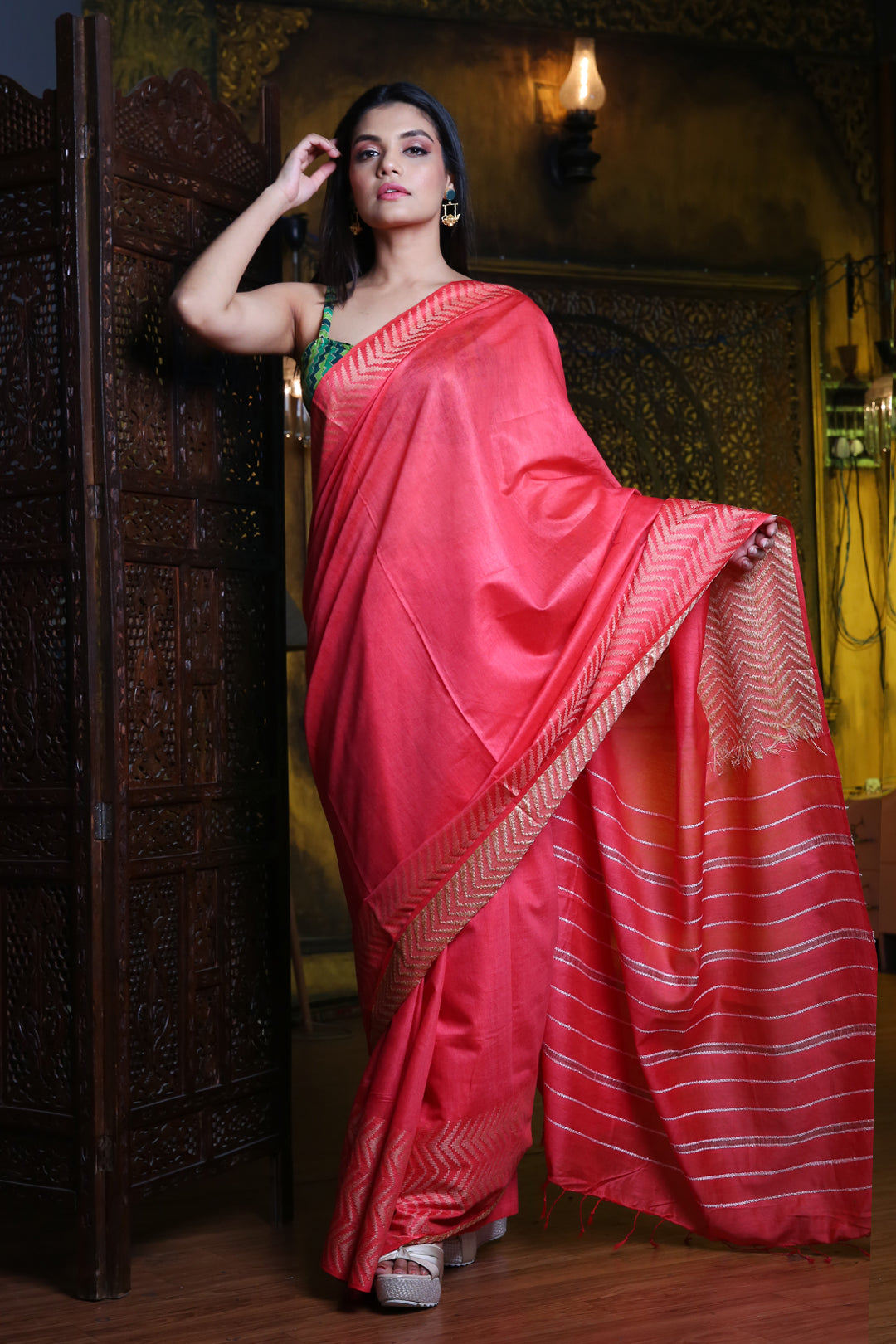 Get a youthful and charming look in this punch pink silk blend saree. The borders have woven geometric patterns. The pallu has woven stripes to complete the look.