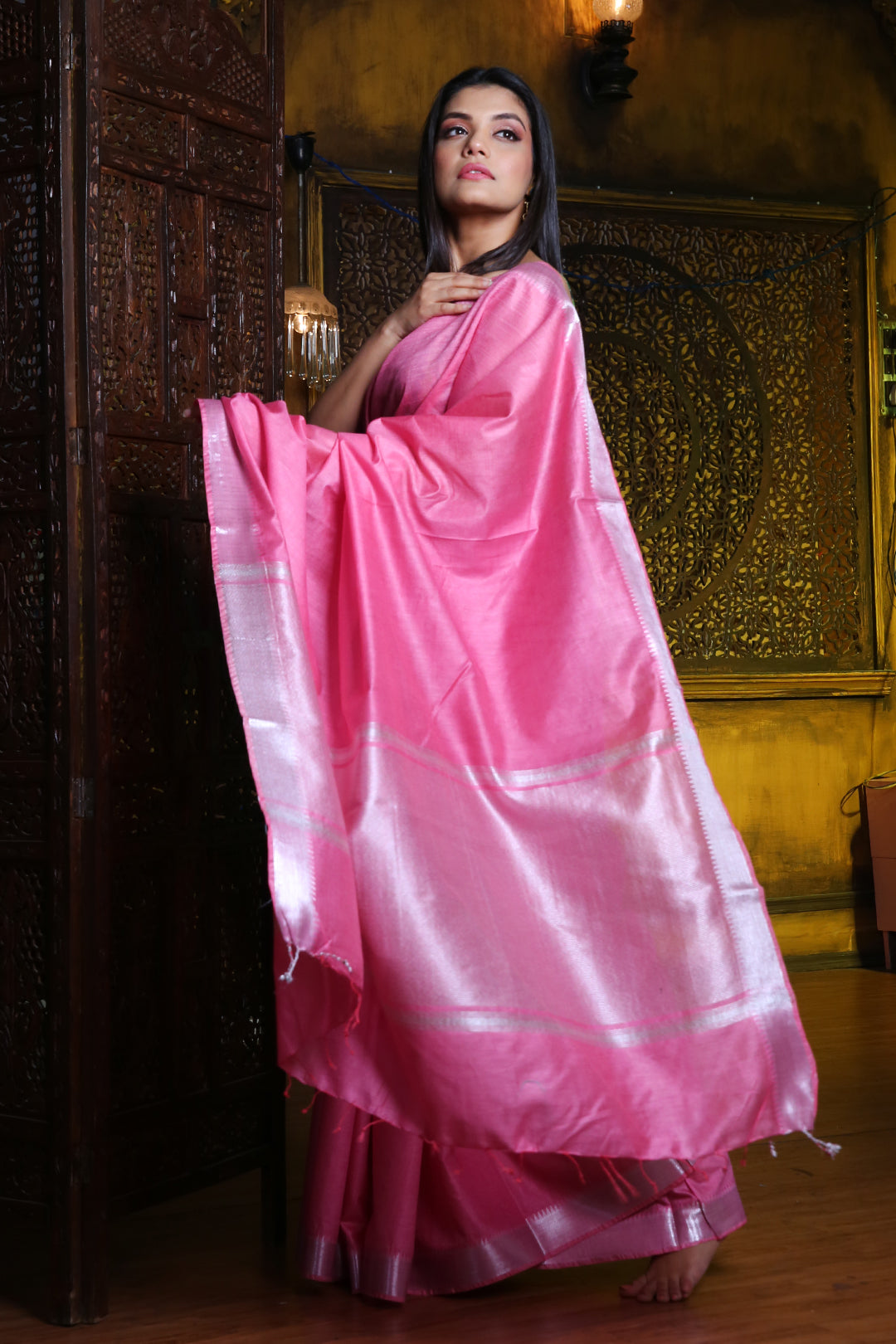 Silver Zari Weaving Pink Silk Saree
