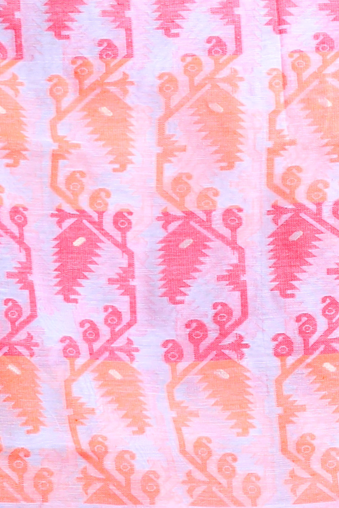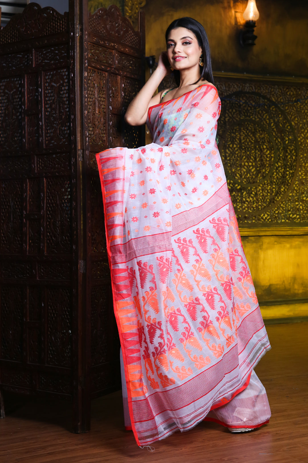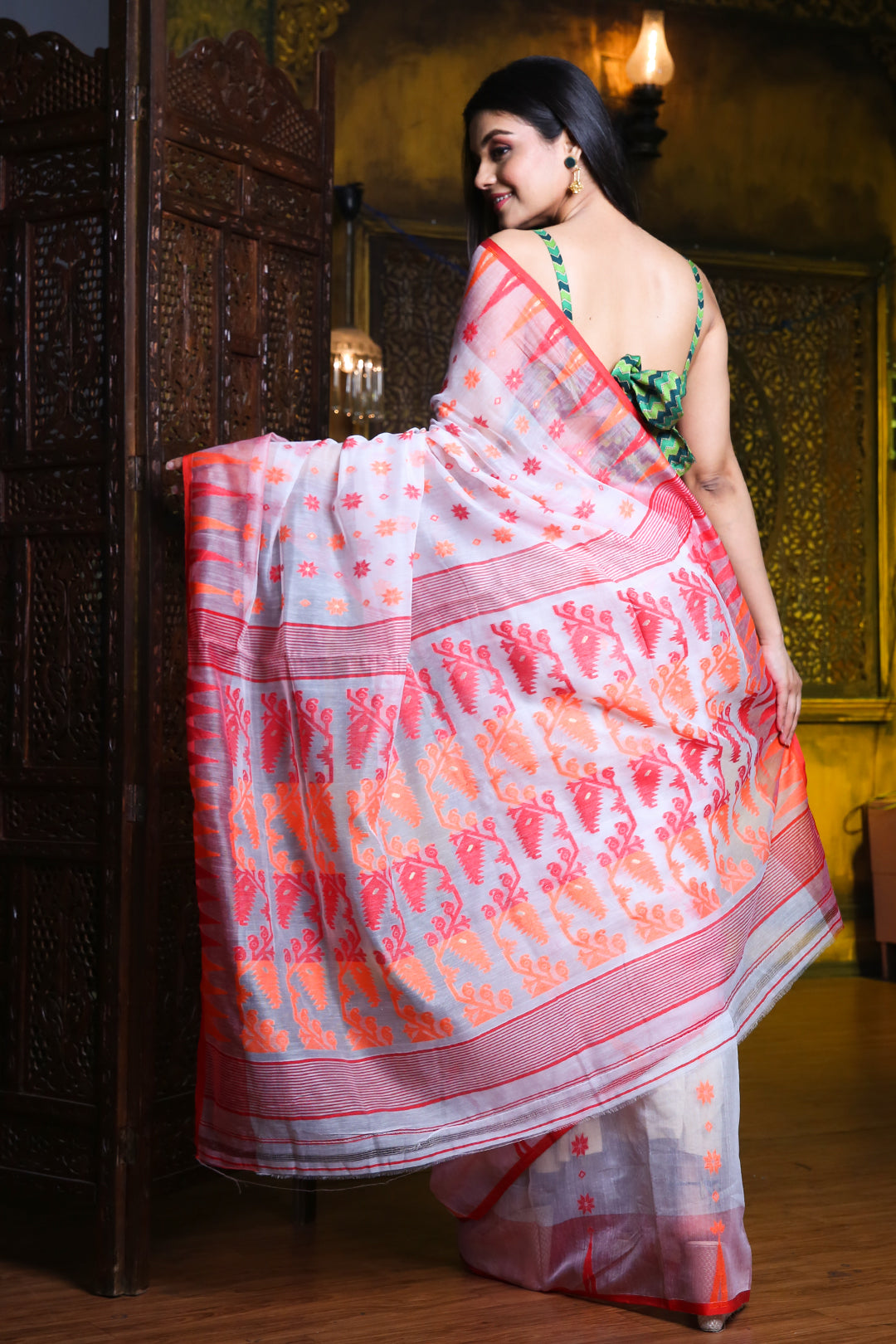 Classy and beautiful is what you will look in this white silk cotton jamdani saree. It has temple motifs woven along the borders in red and orange. The whole body has small motifs. The pallu has jamdani and paisley patterns to complete its charm.