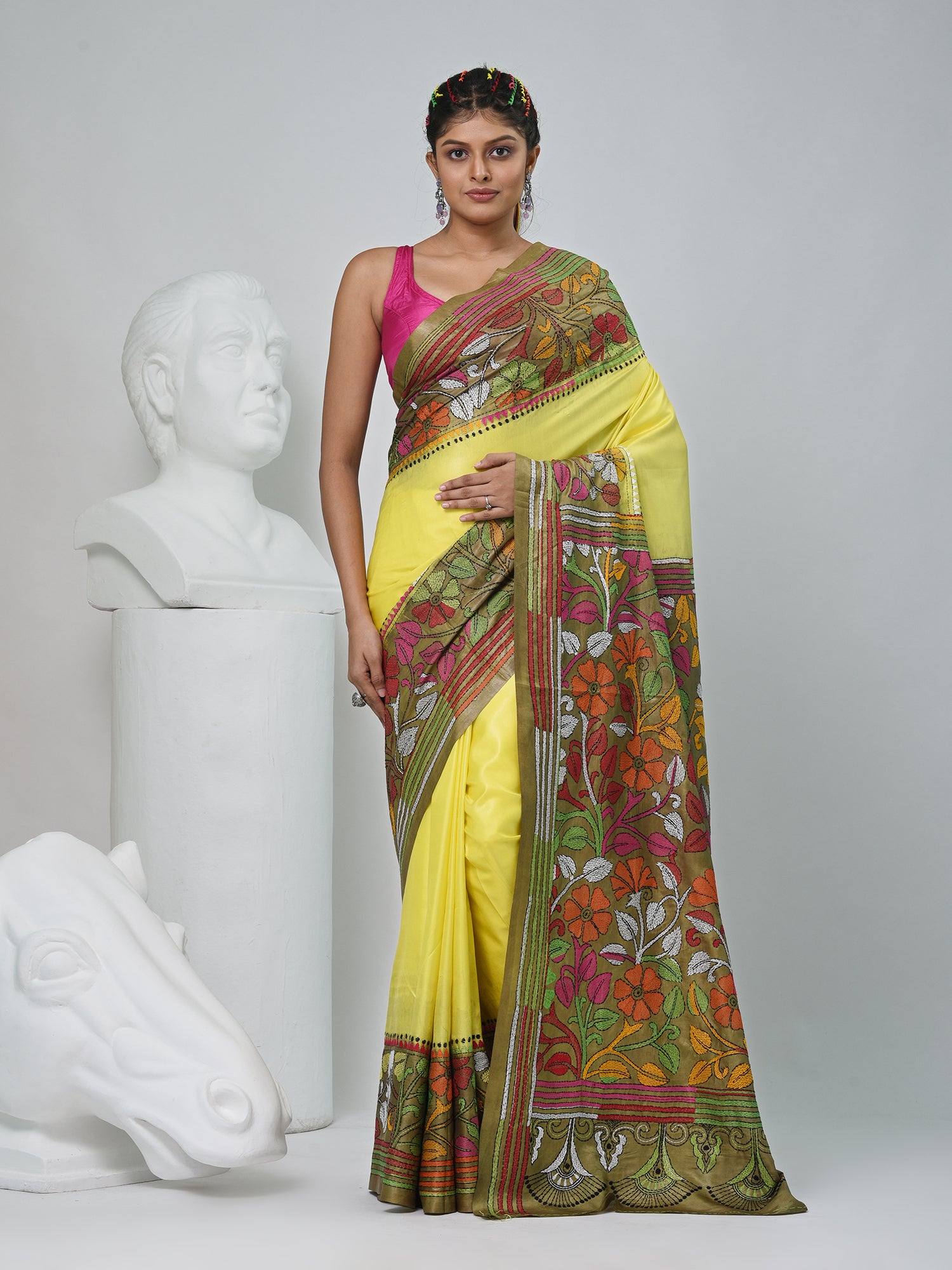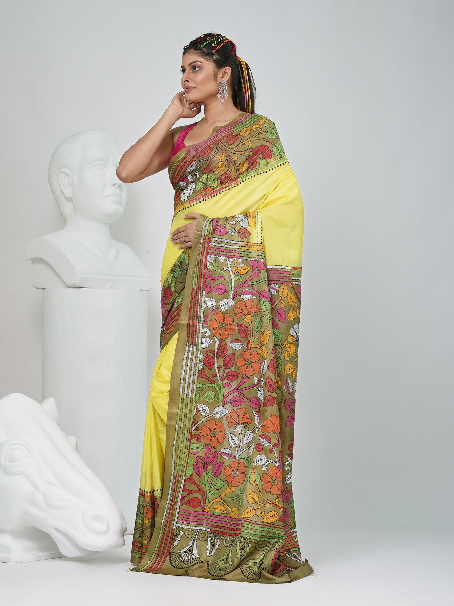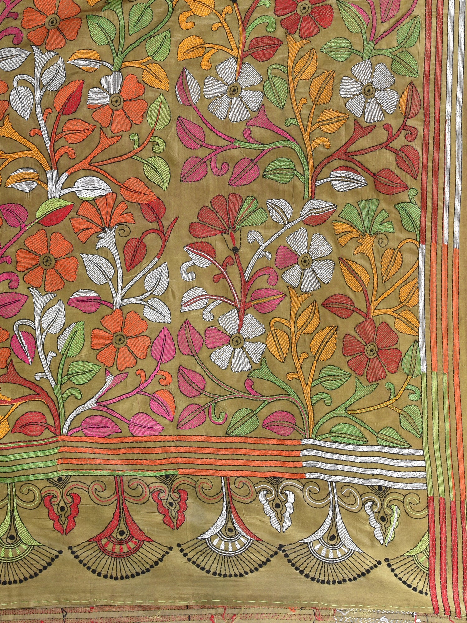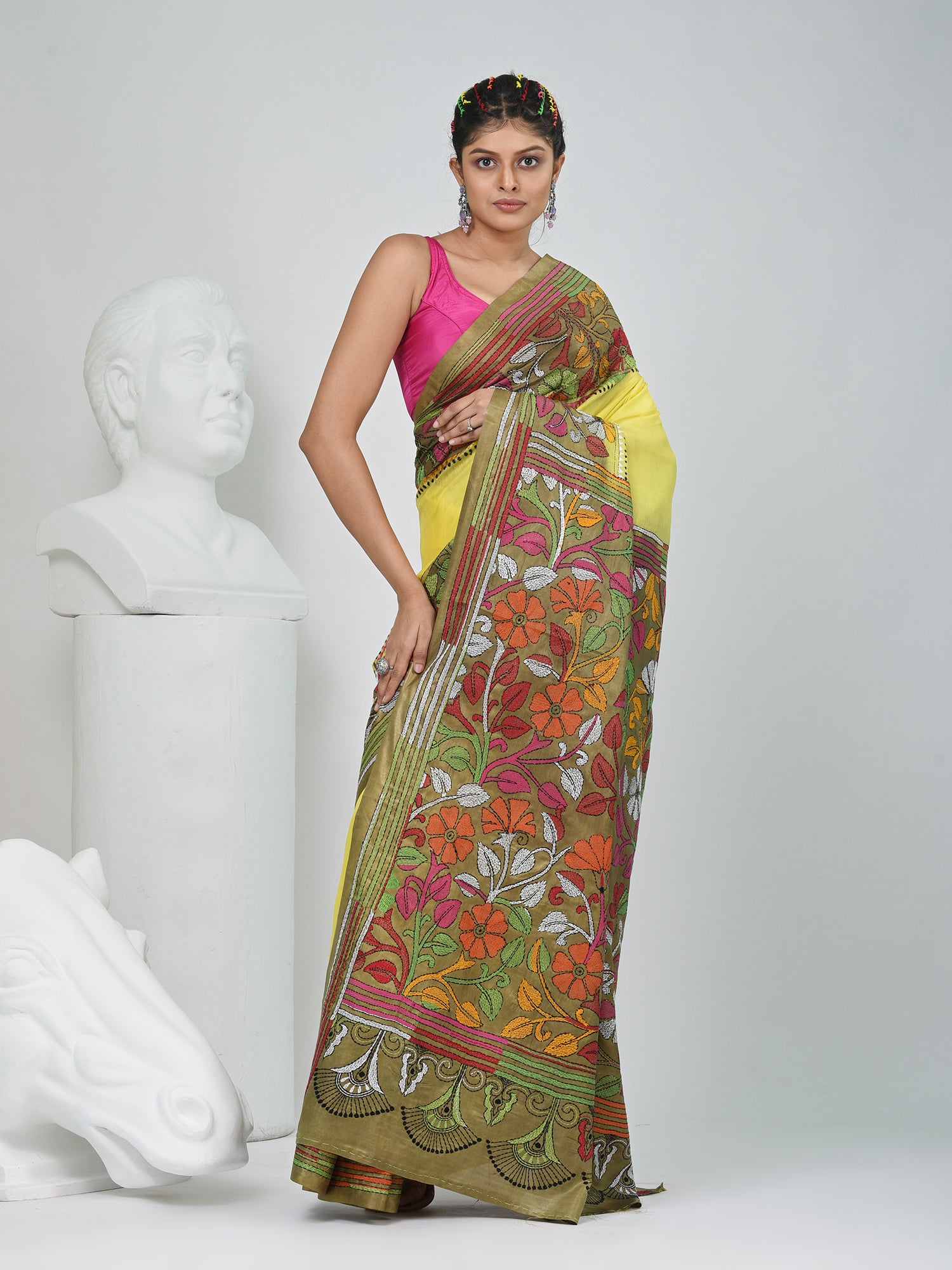 Elegant Yellow And Green Silk Kantha Stitch Saree with Floral Motif