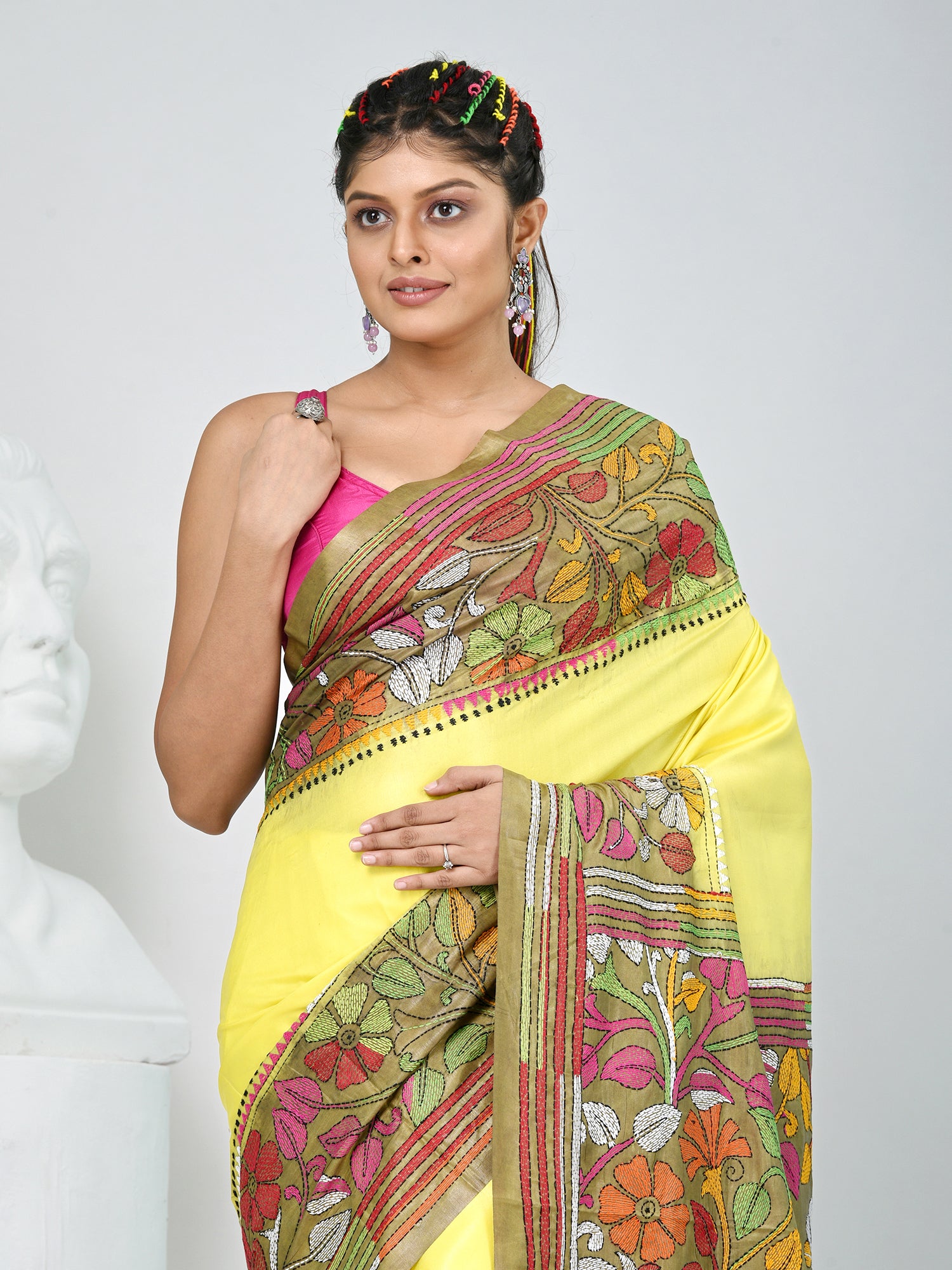Add a touch of tradition to your wardrobe with this stunning silk blend Kantha stitch saree. The saree features a rich yellow base that exudes vibrancy, adorned with intricate Kantha thread work in colorful floral motifs along the border and pallu. The second color of this saree is a rich green, which is visible in the floral thread work along the border and pallu, complementing the vibrant yellow base. The combination of soft, lustrous silk and the timeless Kantha stitch technique gives this piece an elegant and artistic appeal. Perfect for festive occasions, weddings, or cultural events, this saree will make a statement wherever you go. Pair it with a contrasting blouse to complete your look.