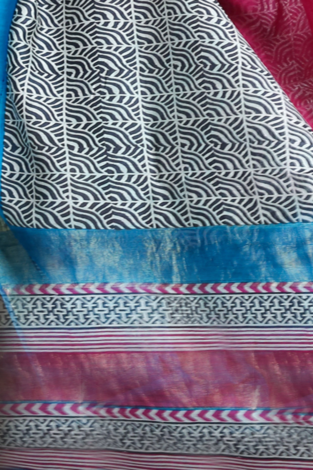 Elevate your ethnic wardrobe with this stunning tussar Silk Saree, perfect for festive occasions and special events. The saree features a vibrant combination of a rich pink upper body paired with an exquisite black and white geometric patterned body, enhanced by a striking blue silk border with subtle golden zari work. The luxurious texture and glossy finish of pure silk lend an elegant drape and shine, making it ideal for weddings, parties, or traditional gatherings. The saree comes with a matching pink silk blouse piece to complete your graceful look.