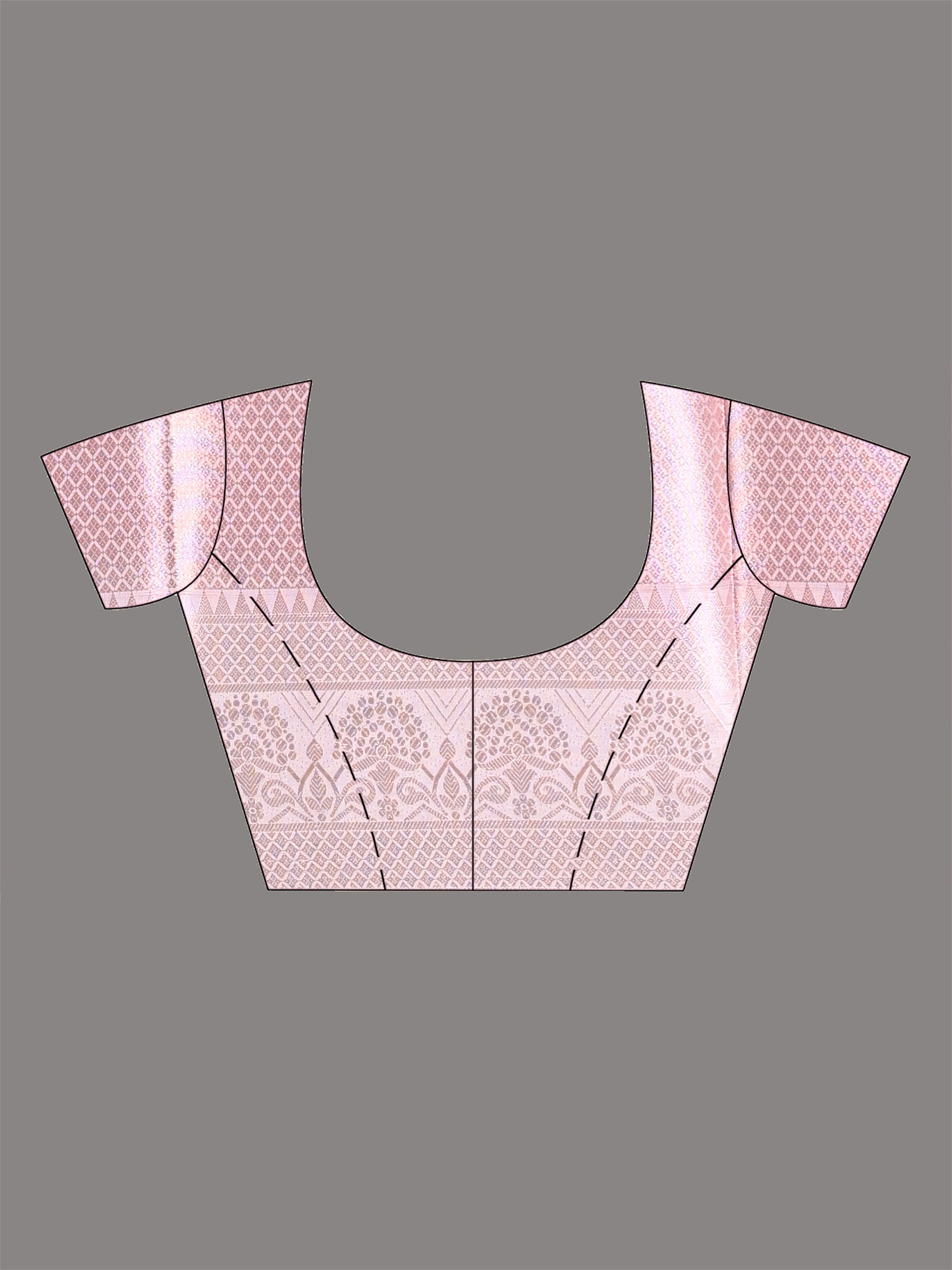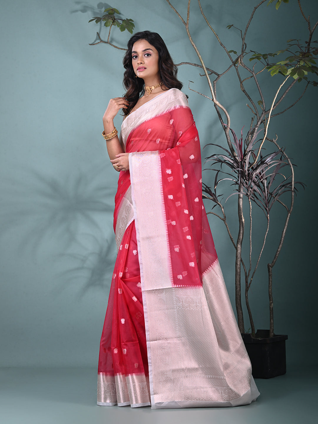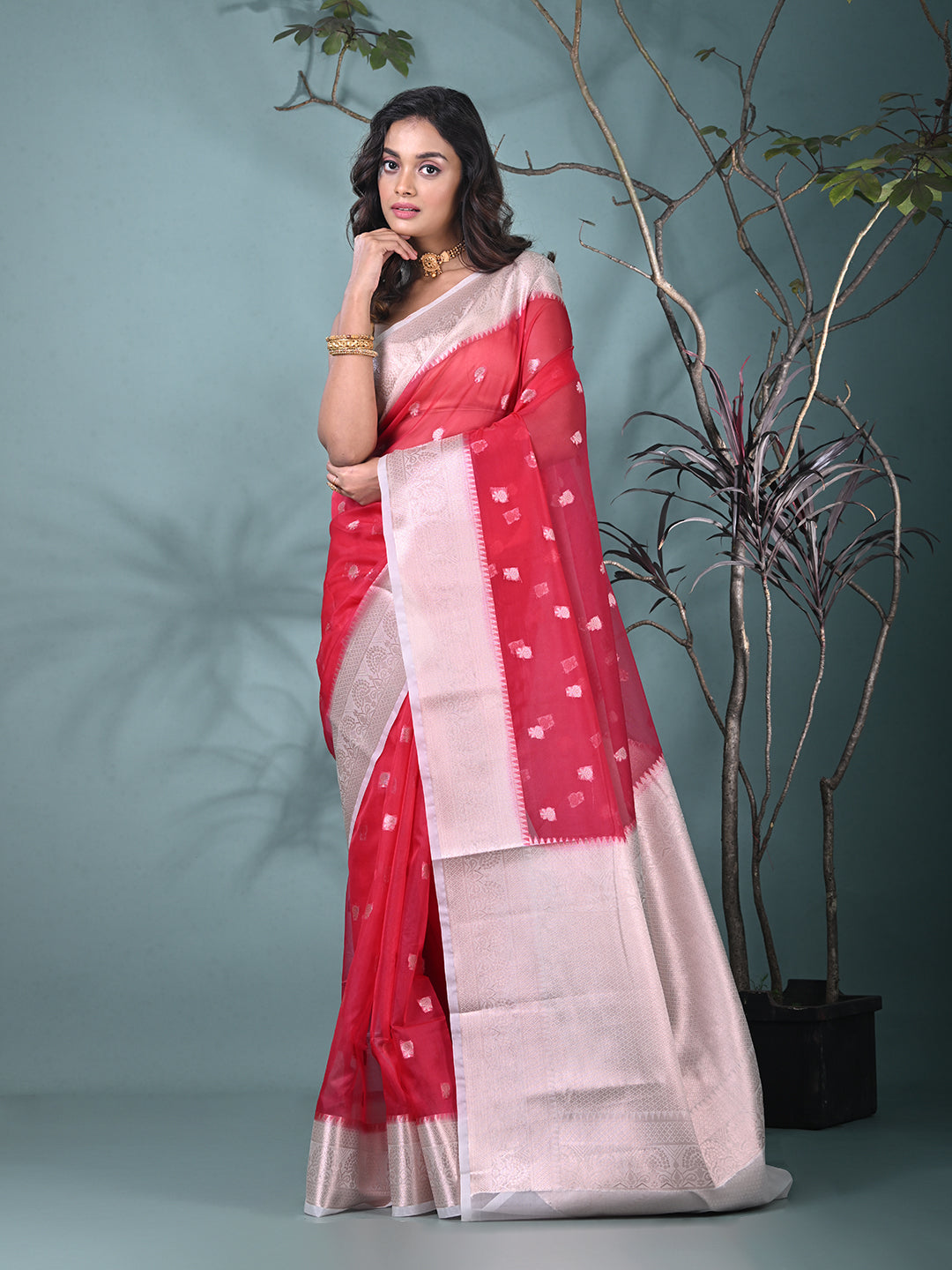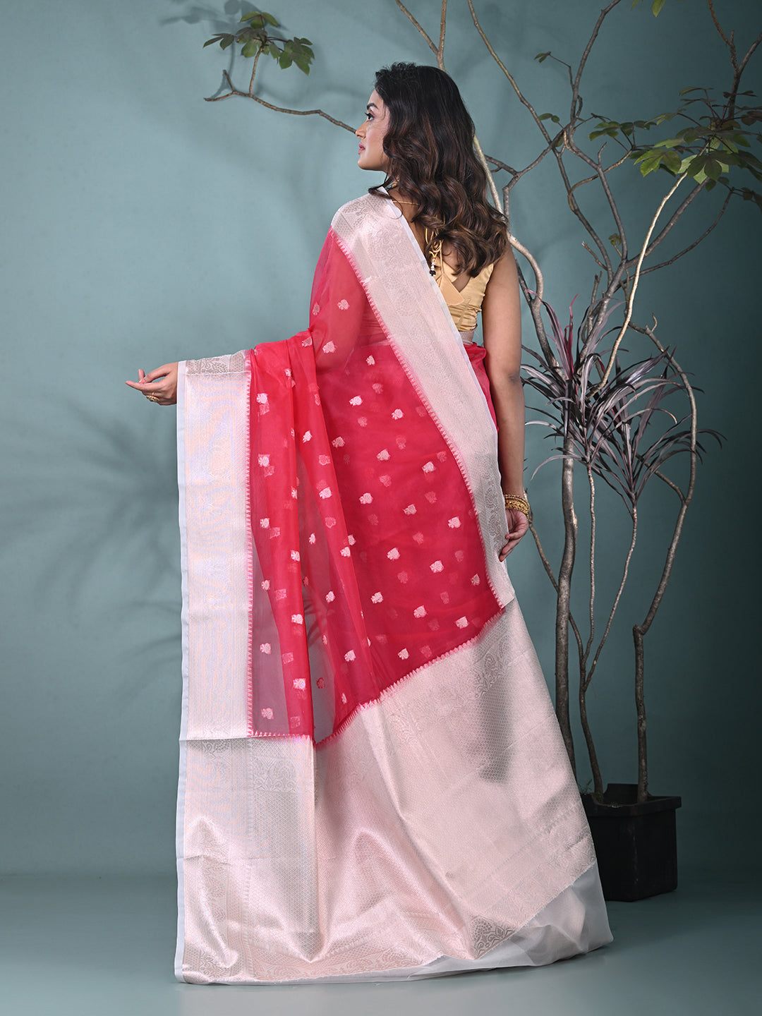 This exquisite saree is crafted from premium organza fabric, offering an elegant and lightweight feel. The rich fuchsia color serves as a stunning backdrop for delicate floral motifs, intricately woven into the fabric, adding a touch of sophistication. The saree is bordered with a contrasting white shade, beautifully accentuating its refined design. Its soft sheen creates a mesmerizing visual appeal, making it perfect for special occasions such as weddings, festive celebrations, or evening events.