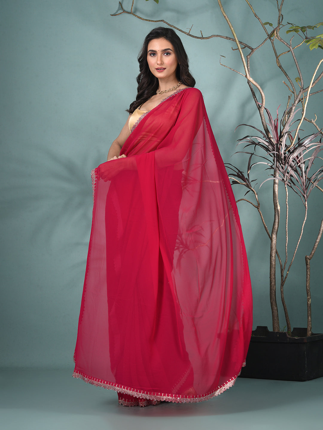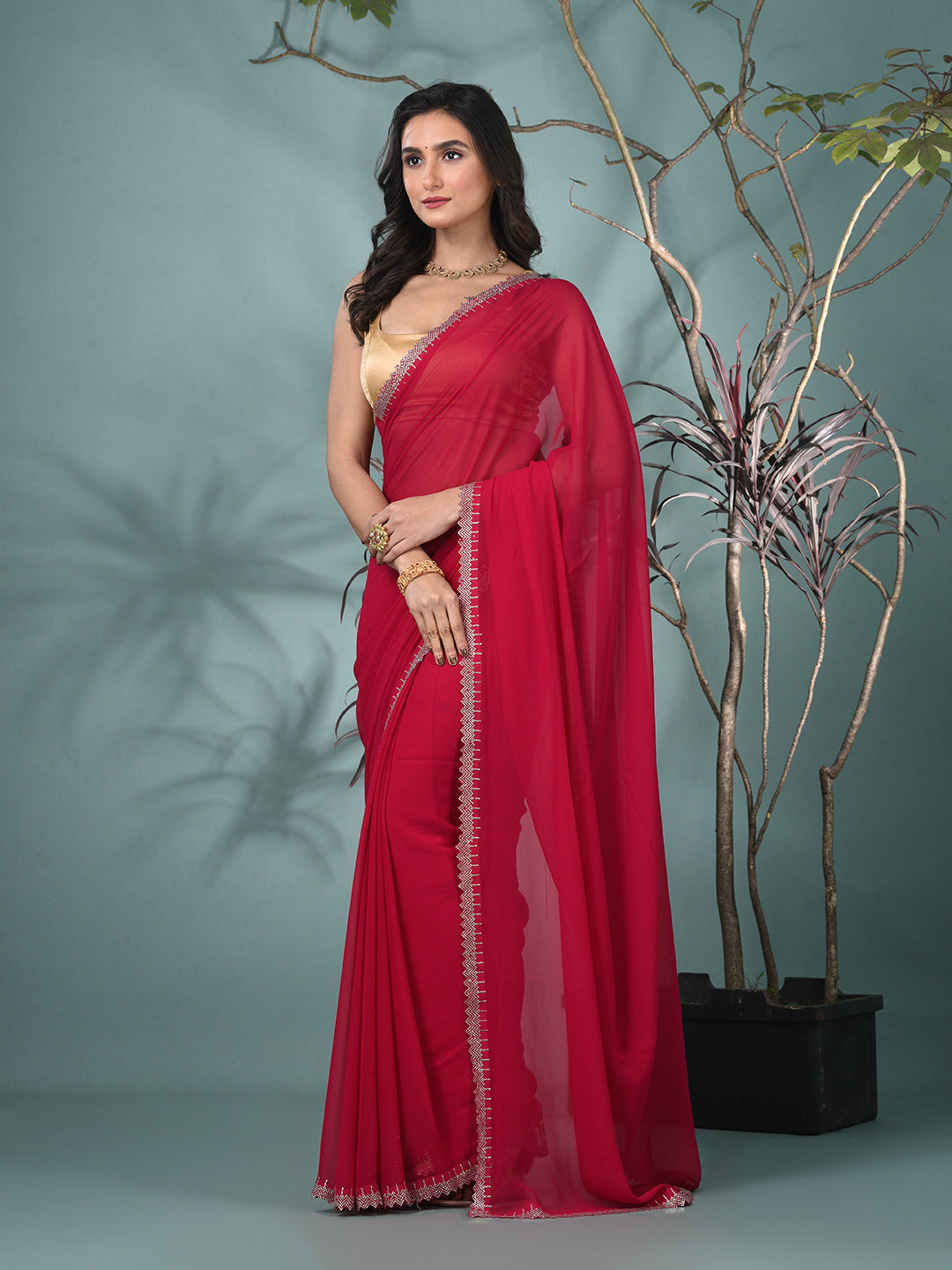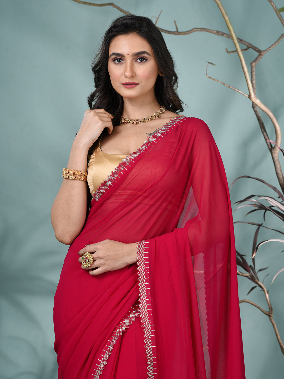Stylish Fuchsia Chiffon Saree with Stone Work Border