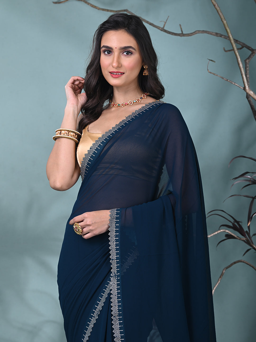 Add a dash of elegance to your wardrobe with this stunning Teal Chiffon Saree. The soft and flowy chiffon fabric drapes beautifully, ensuring comfort and style at every occasion. The rich teal color is complemented by a delicate stone work border, which enhances the overall grace of the saree, making it perfect for weddings, parties, and other special events. This saree features intricate stone work along the borders, giving it a luxurious and festive appeal. The lightweight chiffon fabric ensures ease of wear while offering an elegant and sophisticated look. A matching blouse piece is included to complete the ensemble, allowing you to create a personalized outfit.