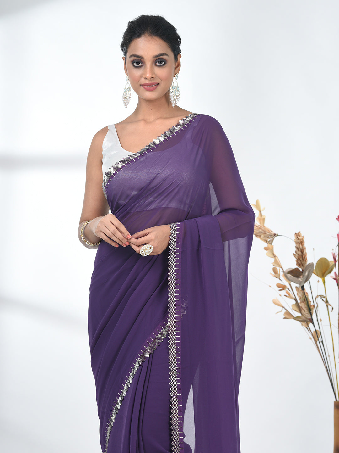 Stylish Violet Chiffon Saree with Stone Work Border