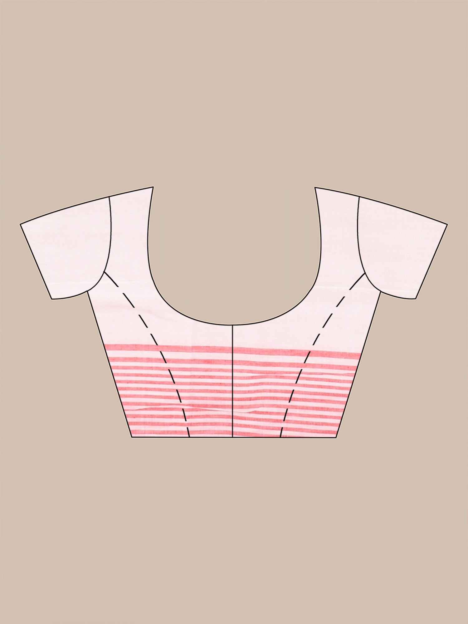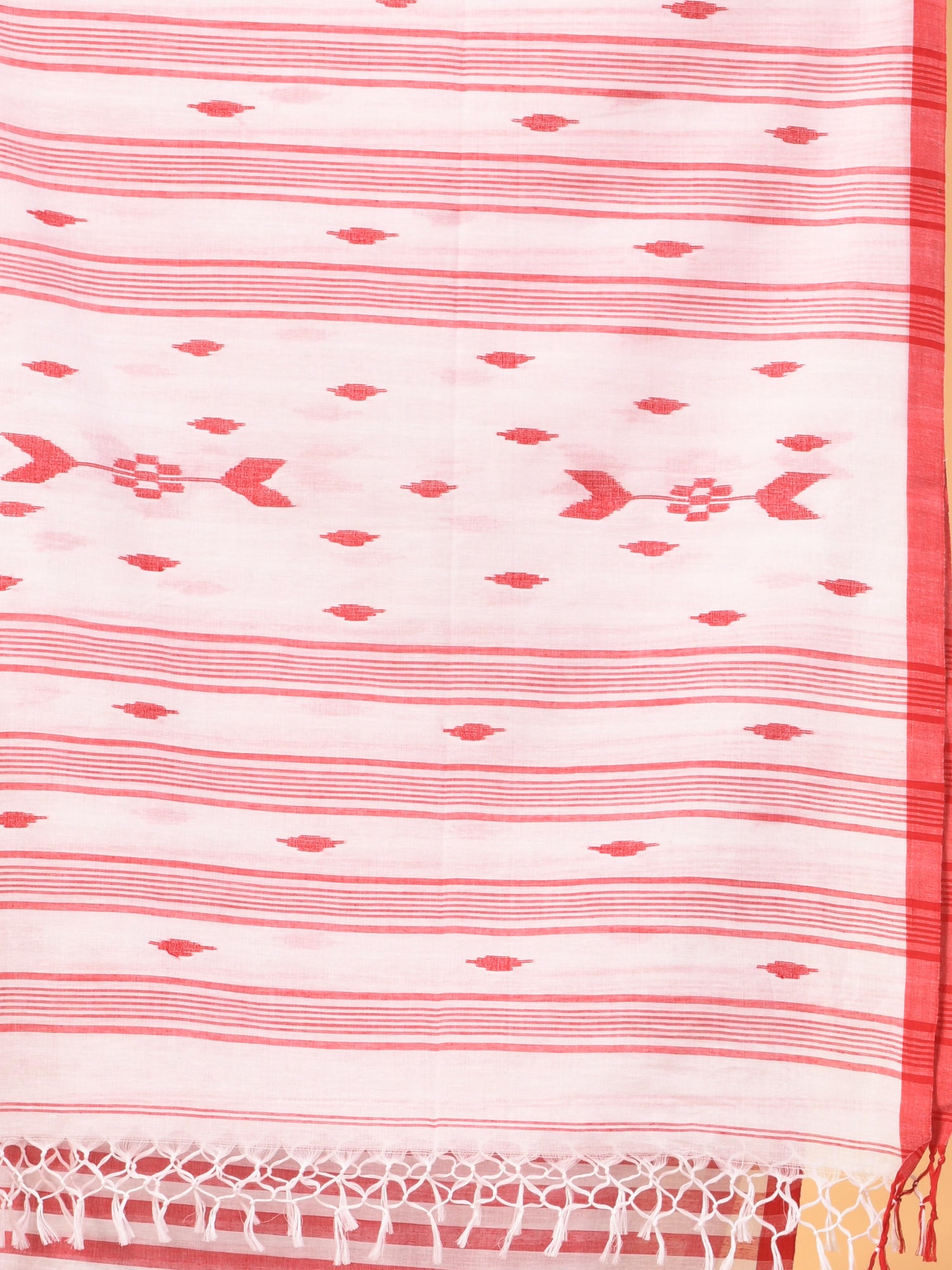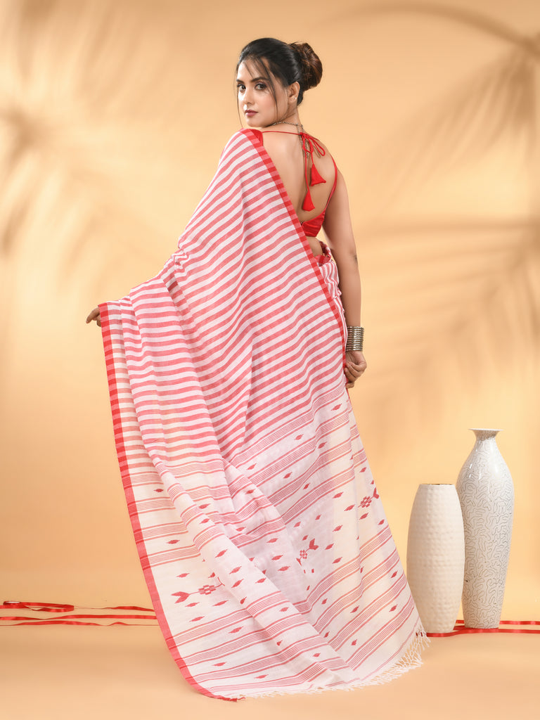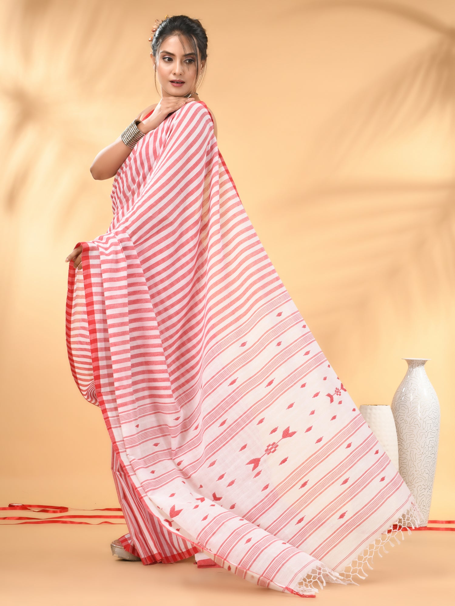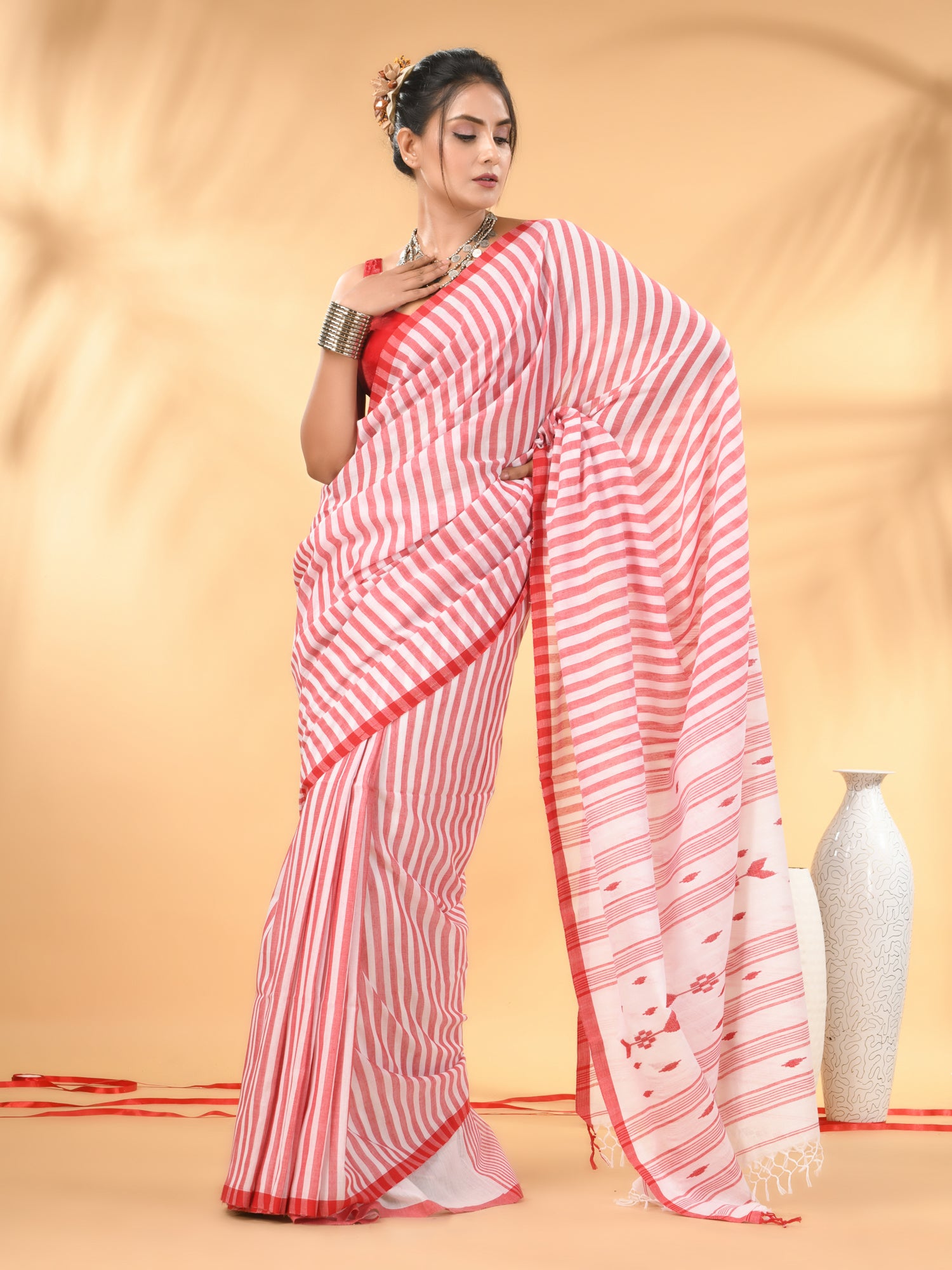 White And Red Handwoven Cotton Saree with All-Over Stripes and Textured Pallu
