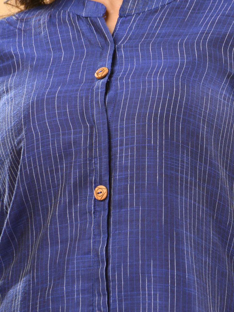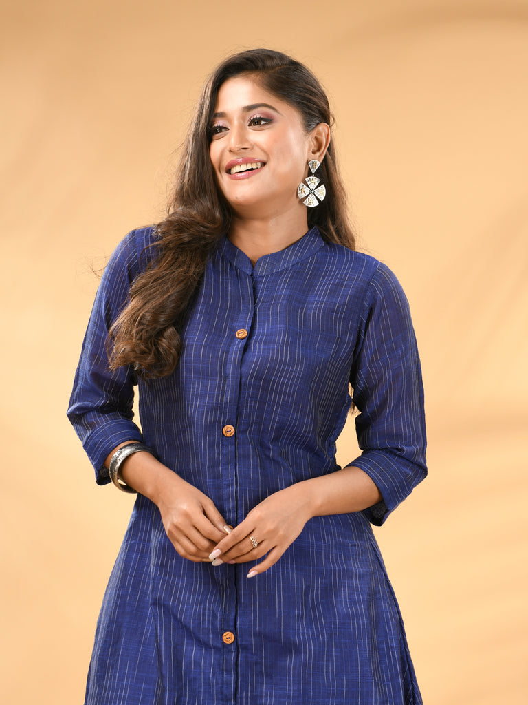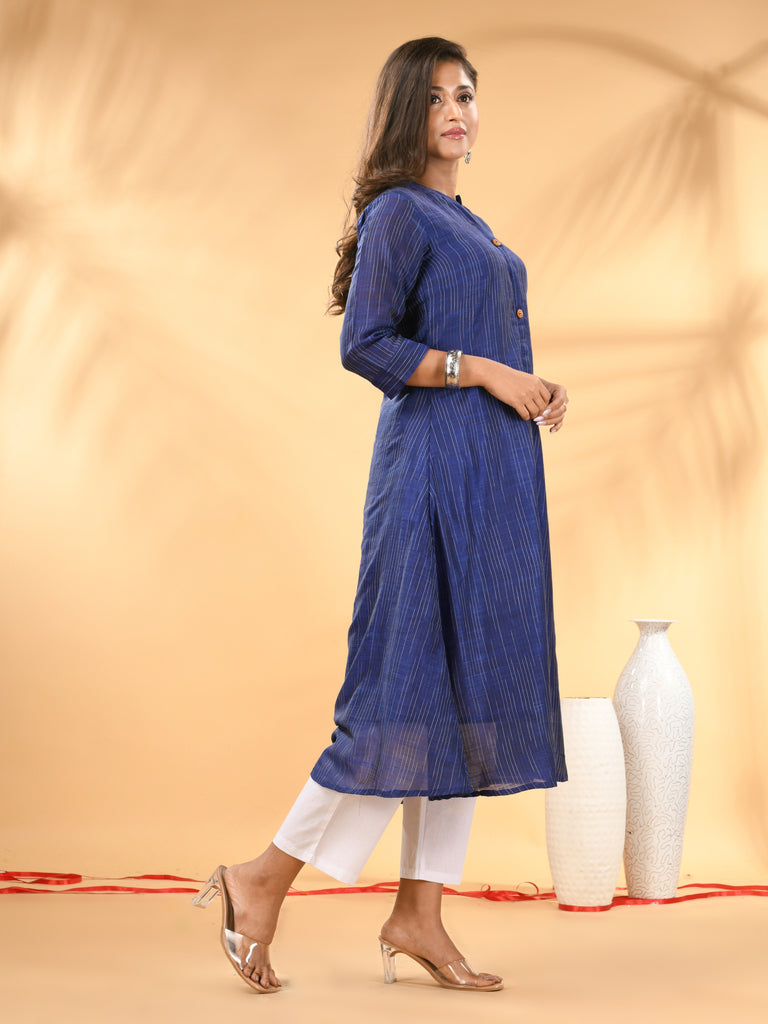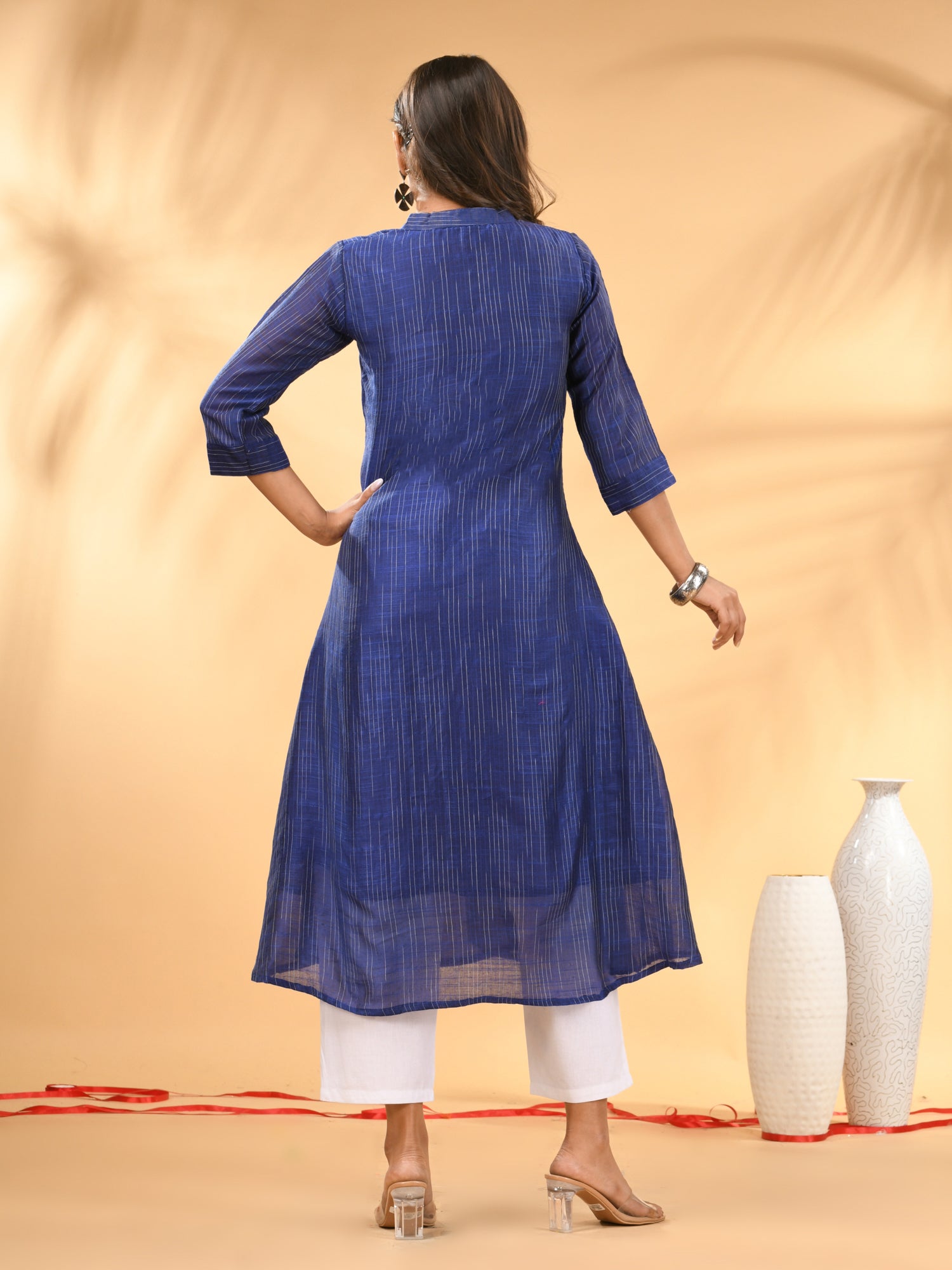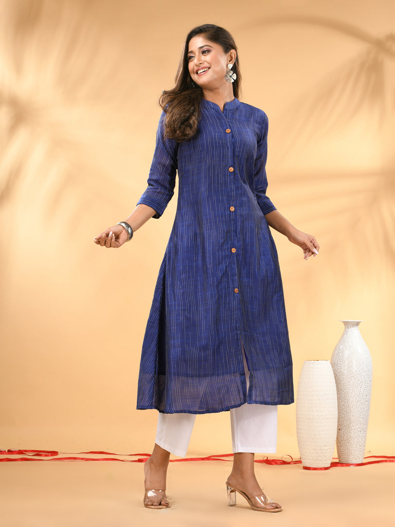 Introducing the sophisticated blue A-line kurta set, a meticulously crafted set ideal for both formal and festive occasions. This set's kurta features a mandarin neckline and three quarter sleeves for a polished look, with an A-line silhouette adding a touch of elegance. The button placket enhances the overall sleek design, while the trouser pant ensures a comfortable and tailored fit. Designed from a luxurious cotton, this set featured solid pattern that offers refinement and style.