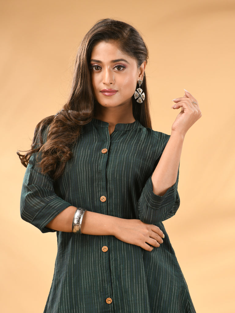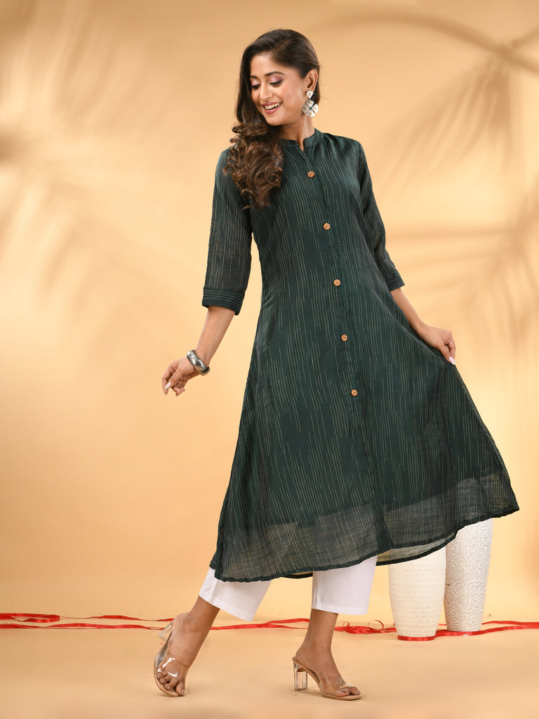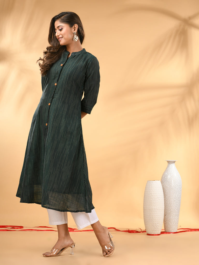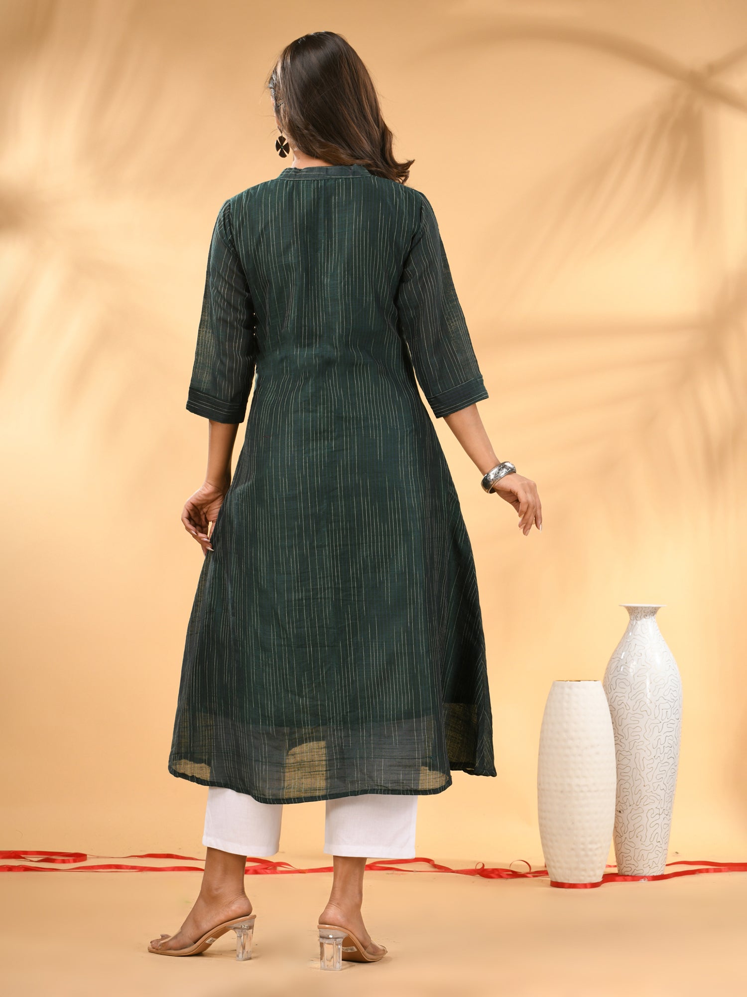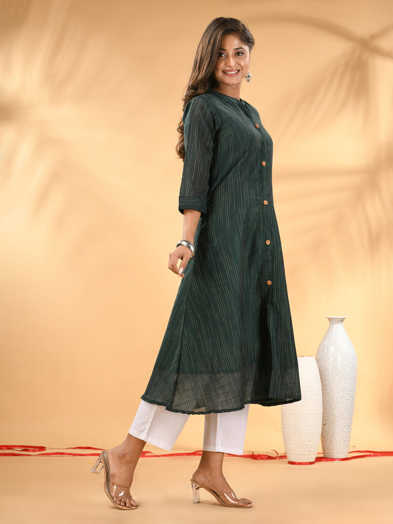 Bottle Green Textured Cotton Handloom A-line Kurta Set
