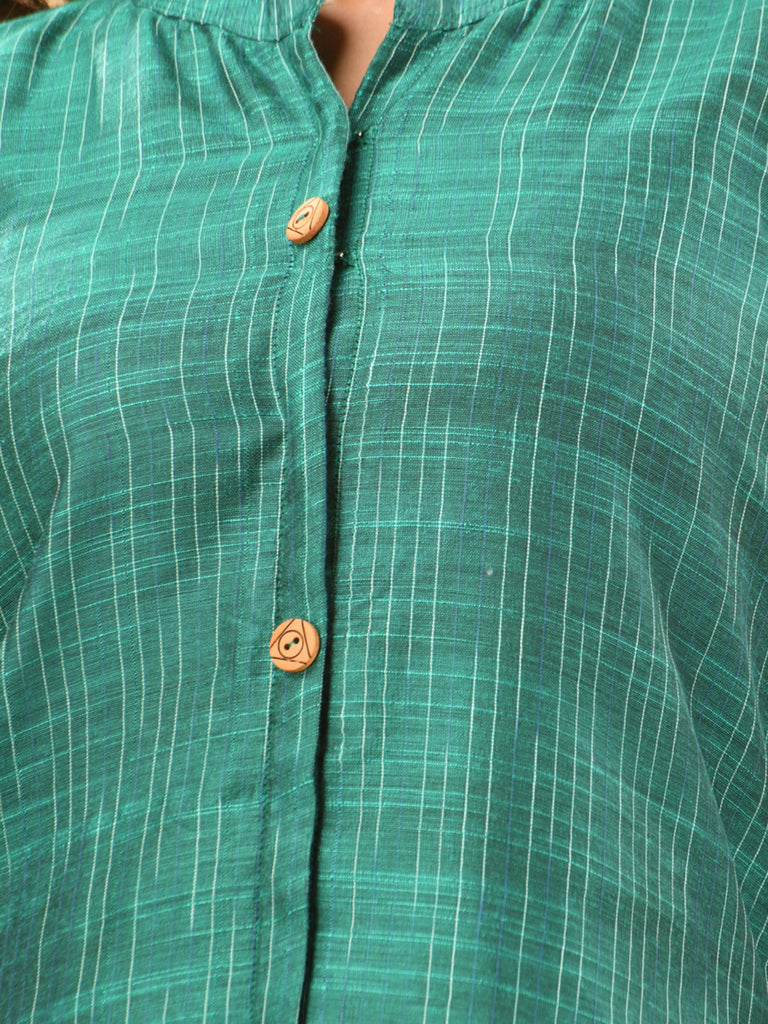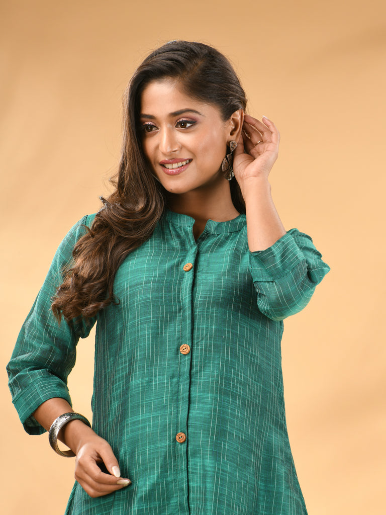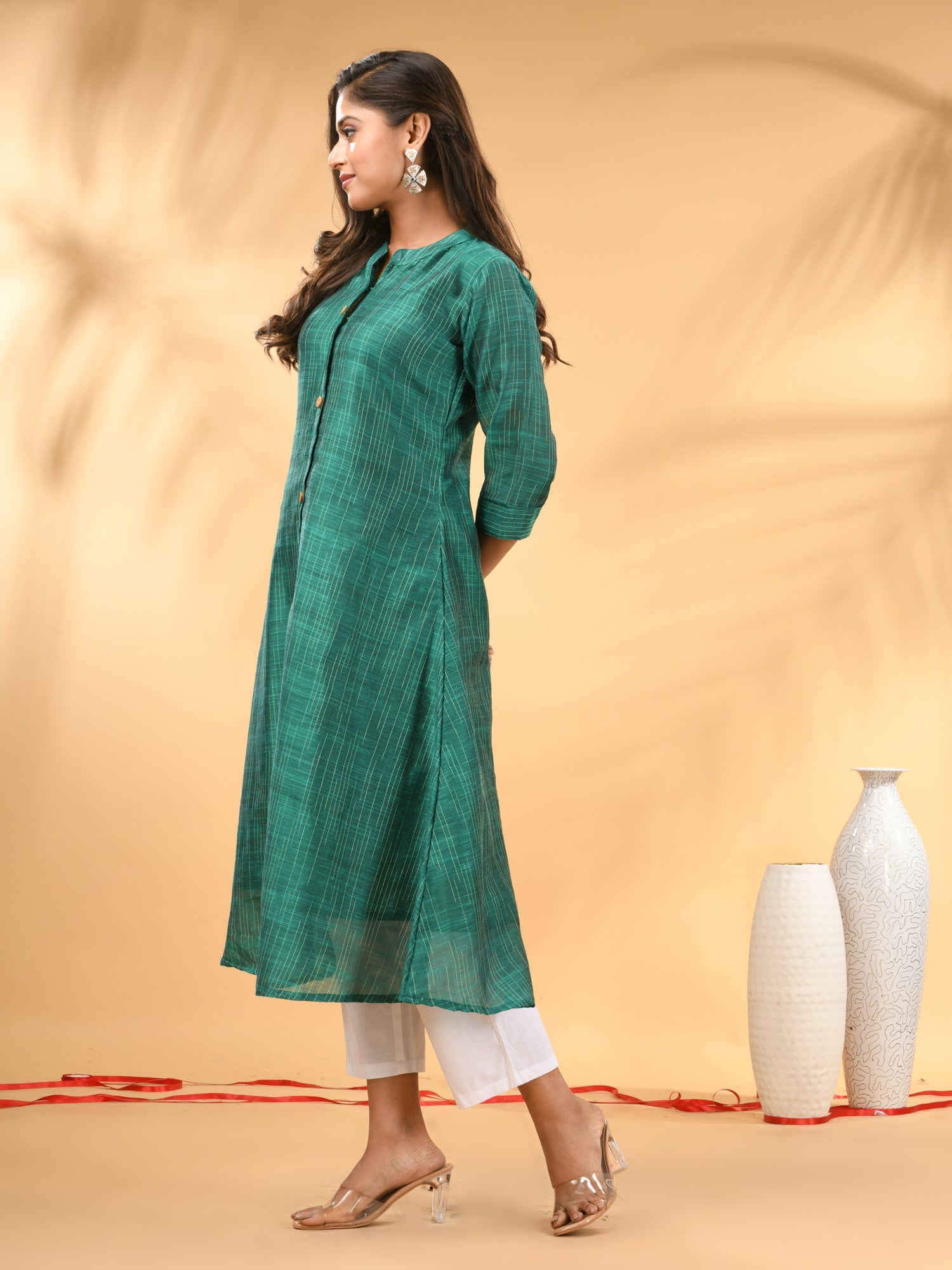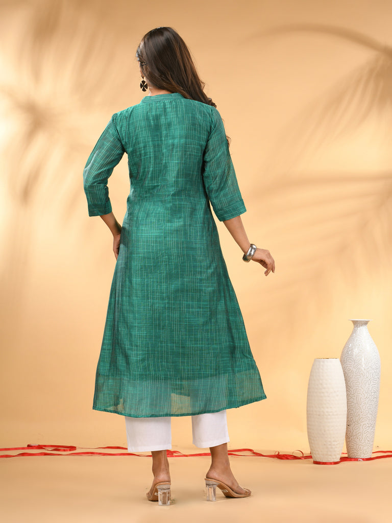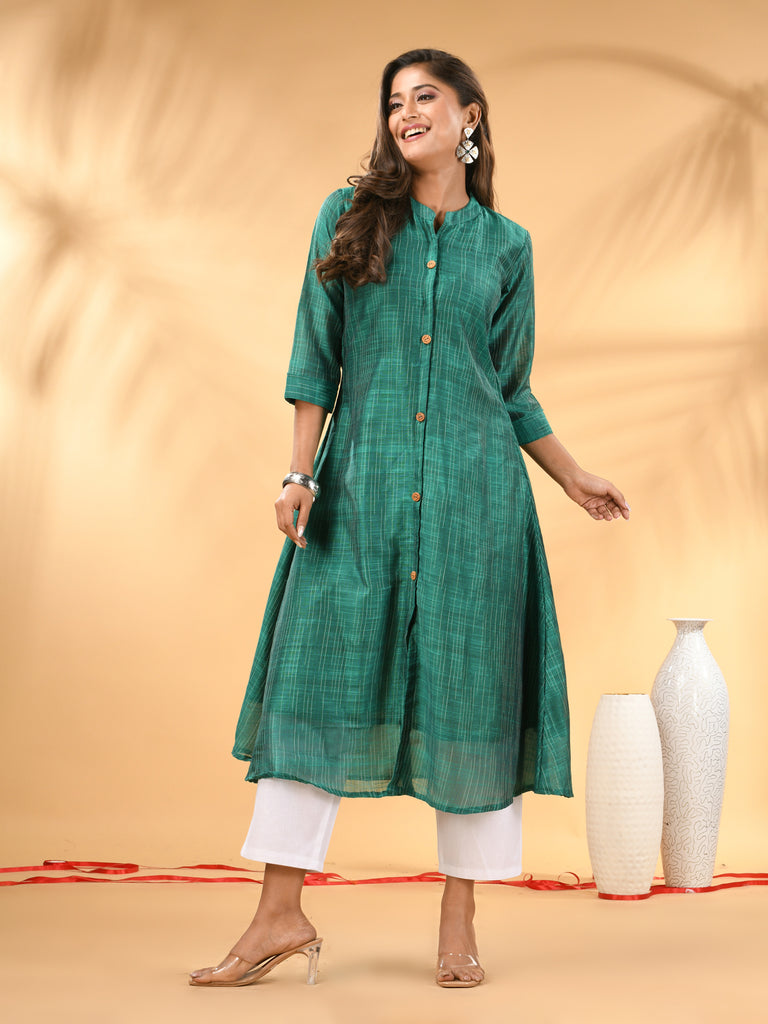 Introducing the sophisticated green A-line kurta set, a meticulously crafted set ideal for both formal and festive occasions. This set's kurta features a mandarin neckline and three quarter sleeves for a polished look, with an A-line silhouette adding a touch of elegance. The button placket enhances the overall sleek design, while the trouser pant ensures a comfortable and tailored fit. Designed from a luxurious cotton, this set featured solid pattern that offers refinement and style.