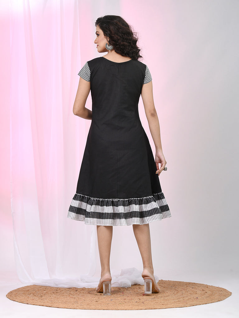 Women's Black Cotton A-Line Ethnic Dress with Monochrome Checked Sleeves & Striped Ruffle Hem