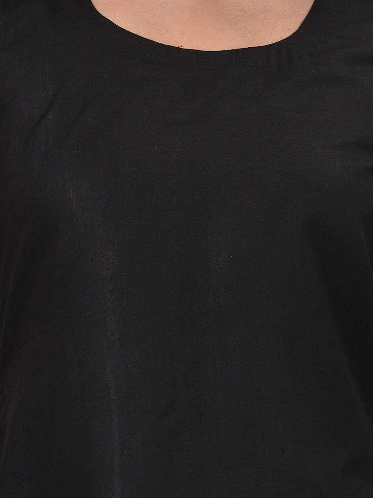 Step into effortless style with this elegant black A-line ethnic dress, featuring a contemporary blend of monochrome patterns. Made from premium quality cotton, this knee-length dress is designed for comfort and sophistication. The black base is beautifully contrasted with black-and-white checked short sleeves and a matching striped ruffle hem, adding a touch of modern flair to a traditional silhouette. Perfect for casual outings, festive occasions, or office wear, this dress also includes a convenient side pocket and a round neckline for a balanced mix of functionality and fashion.