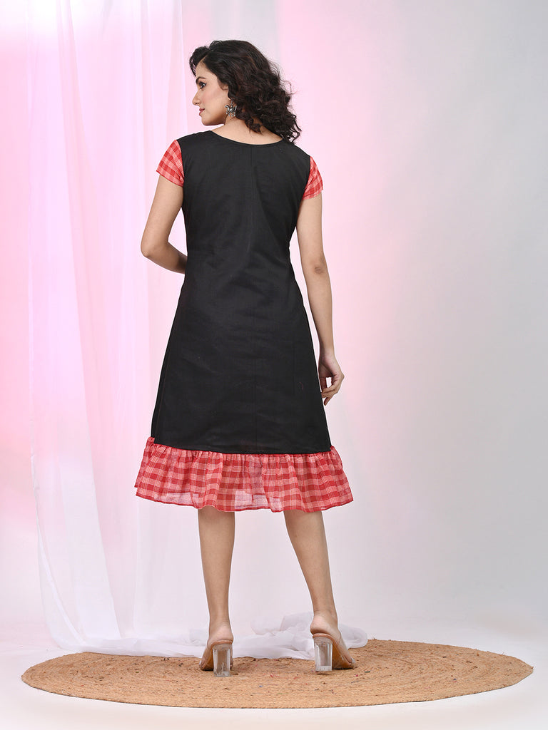 Women's Black Cotton A-Line Ethnic Dress with Red Checkered Sleeves & Ruffle Hem