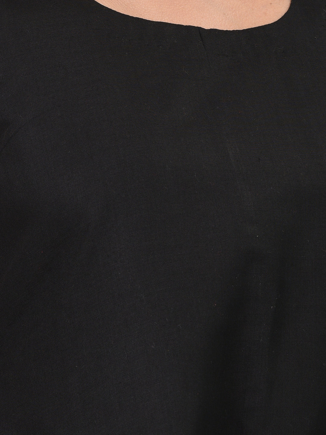 Add a modern twist to your ethnic wardrobe with this chic black A-line dress featuring eye-catching red checkered accents. Tailored from soft, breathable cotton, this knee-length dress offers a flattering silhouette with a round neckline and short sleeves. The contrasting red checkered ruffle hem and sleeves add a vibrant, youthful touch, making it perfect for casual outings, festive gatherings, or a stylish day at work. With a side pocket for added convenience and a slip-on design, this ethnic dress seamlessly blends tradition with contemporary flair.