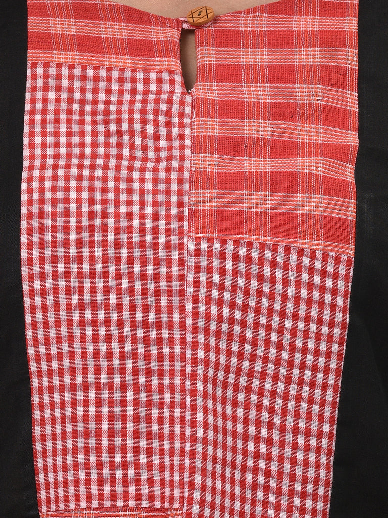 Step out in style with this striking black and red cotton kurta set, designed to make a statement while keeping comfort in mind. The straight-cut kurta features bold red checkered and gingham patchwork detailing on the front panel and sleeves, creating a vibrant contrast against the solid black base. A round neckline with a keyhole notch and 3/4th sleeves add to the modern ethnic appeal. Paired with flowy, wide-leg palazzos in red and white plaid, this set is a perfect blend of tradition and trend. Ideal for casual wear, office, or festive occasions, this ensemble offers effortless elegance and all-day comfort.