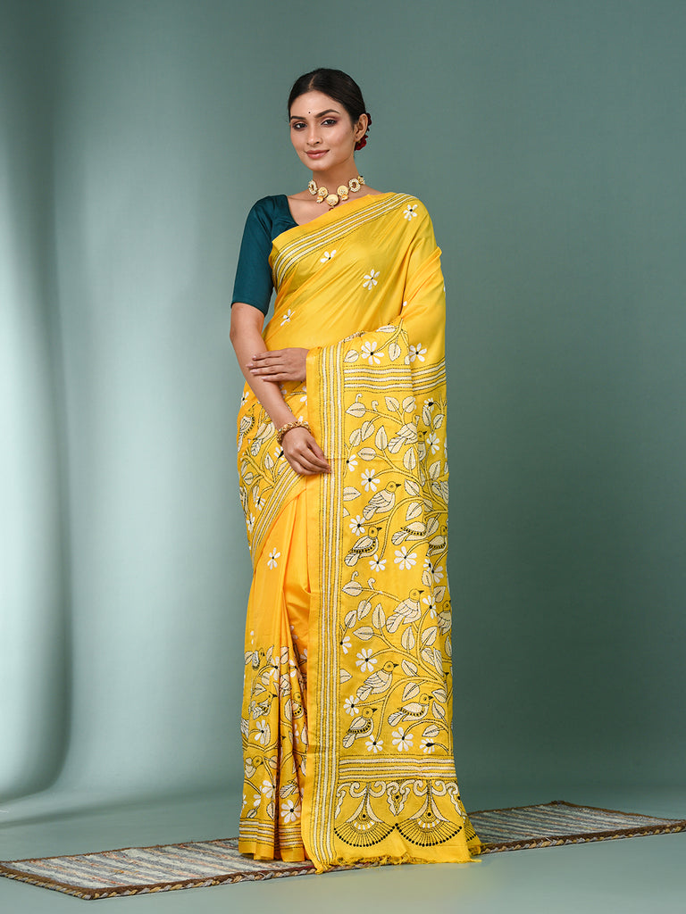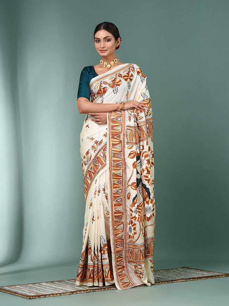 Off White Gujrati Work Kantha Stitch Tussar Silk Soft Saree