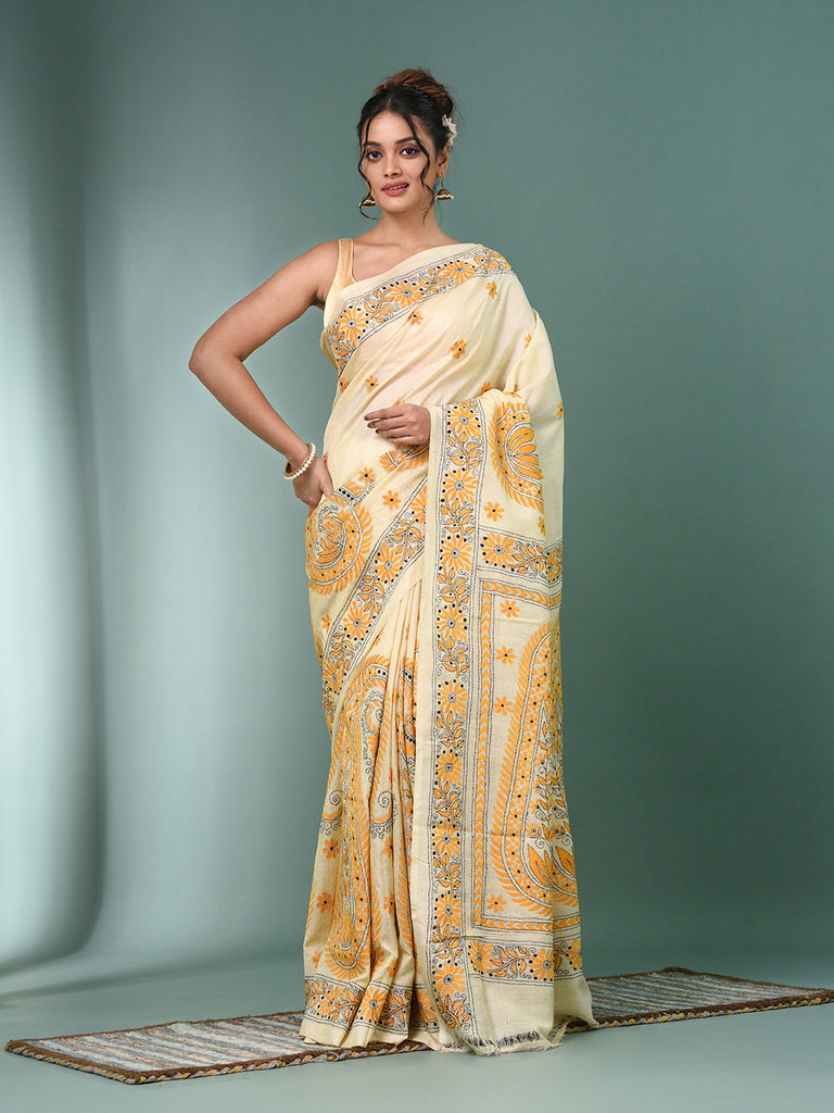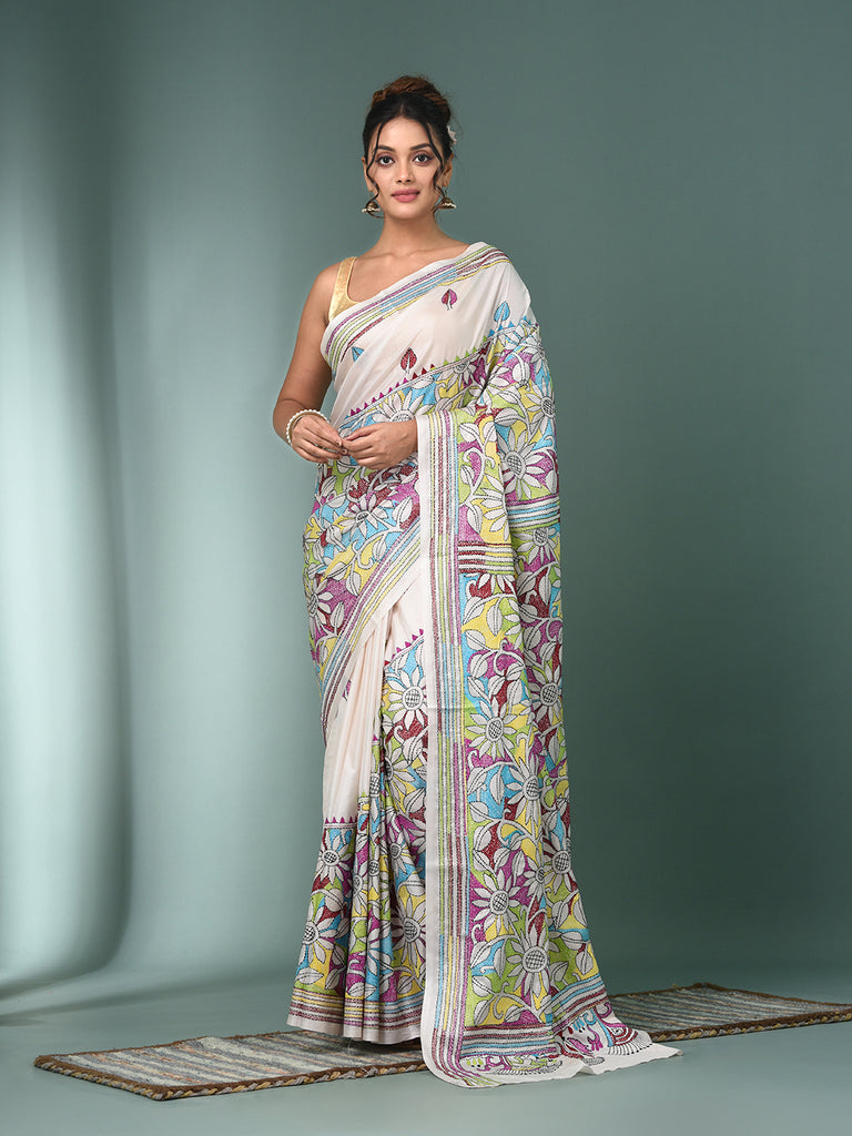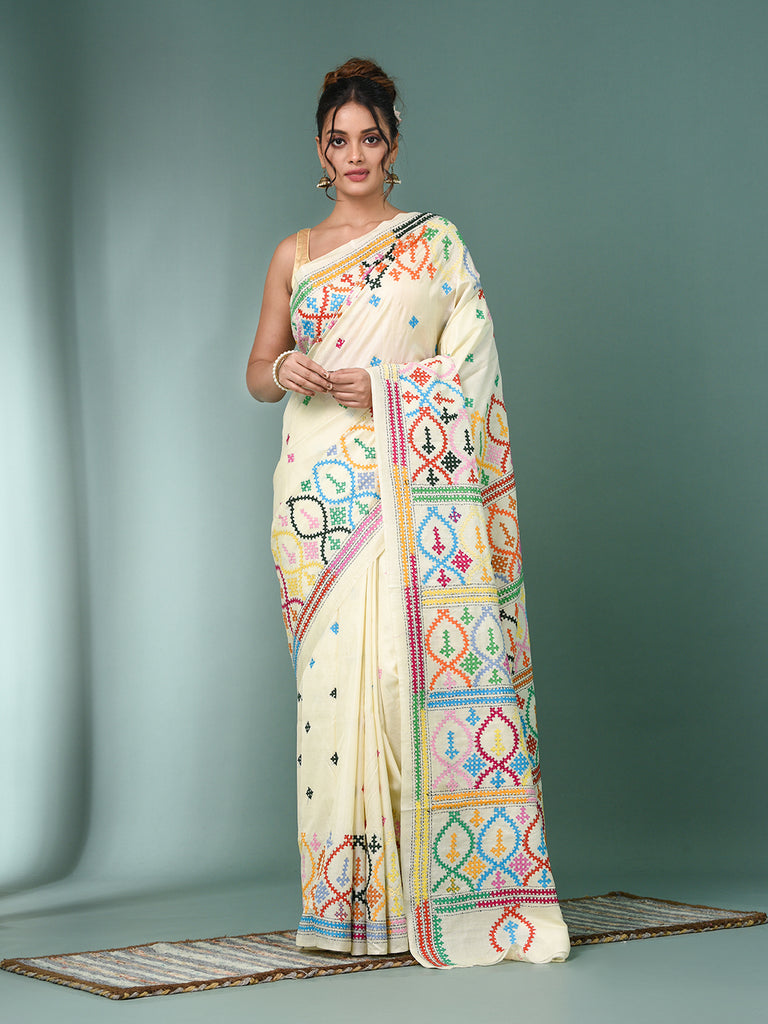 Off White Kantha Stitch Bangalore Silk Soft Saree