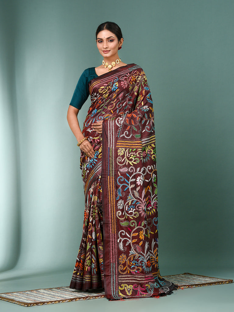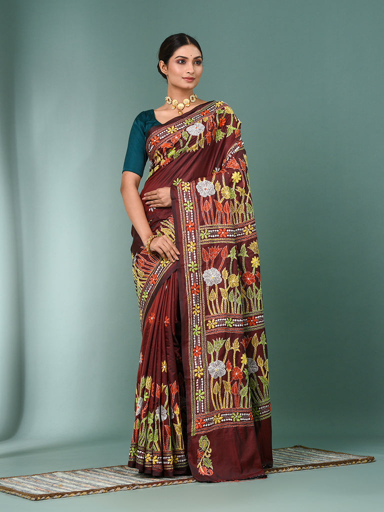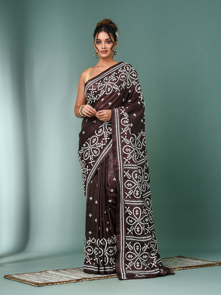 Brown Gujrati Work Kantha Stitch Silk Soft Saree