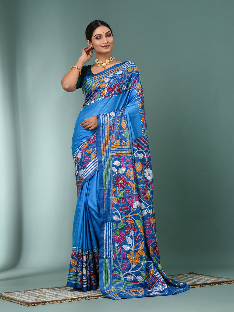 Blue Gujrati Work Kantha Stitch Silk Soft Saree