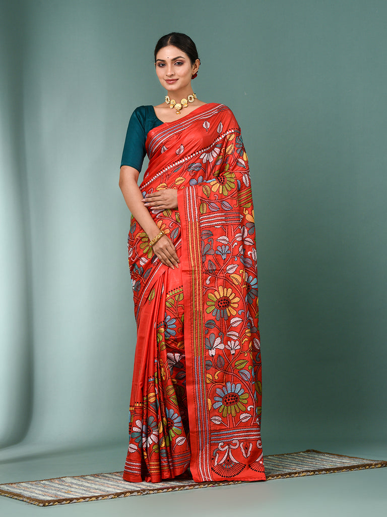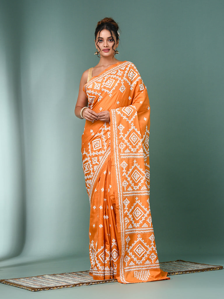 Orange Gujrati Work Kantha Stitch Silk Soft Saree