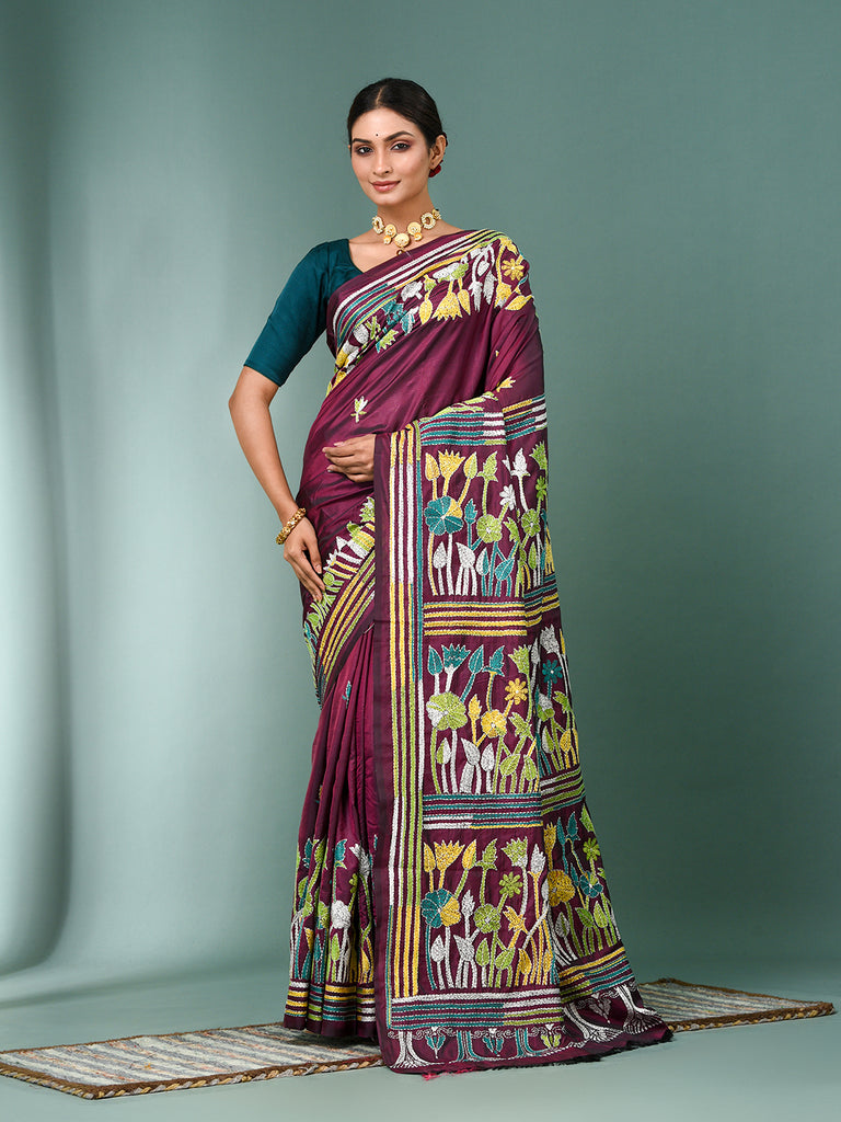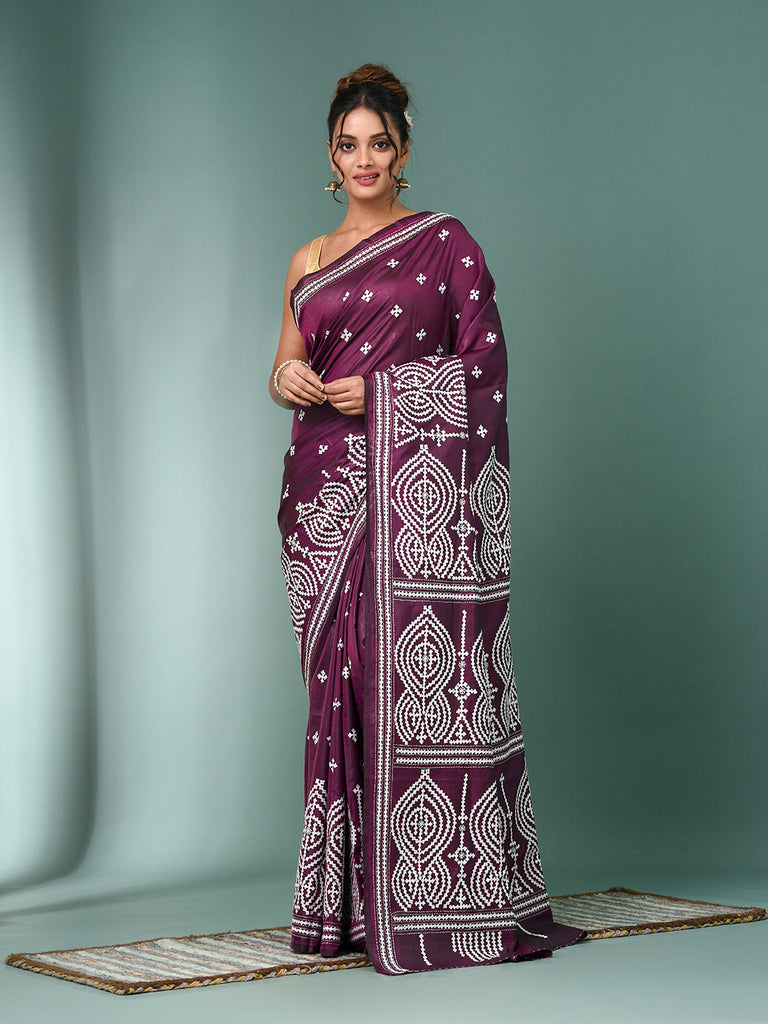 Purple Gujrati Work Kantha Stitch Silk Soft Saree