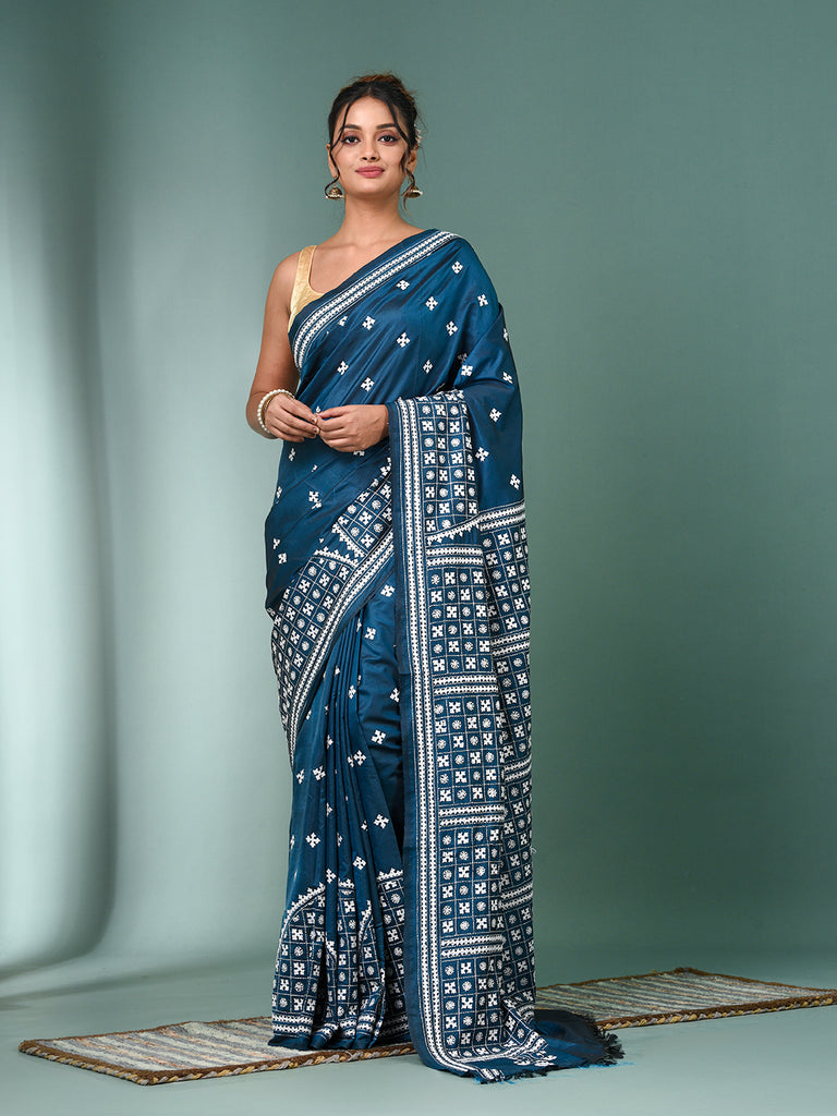 Teal Gujrati Work Kantha Stitch Silk Soft Saree