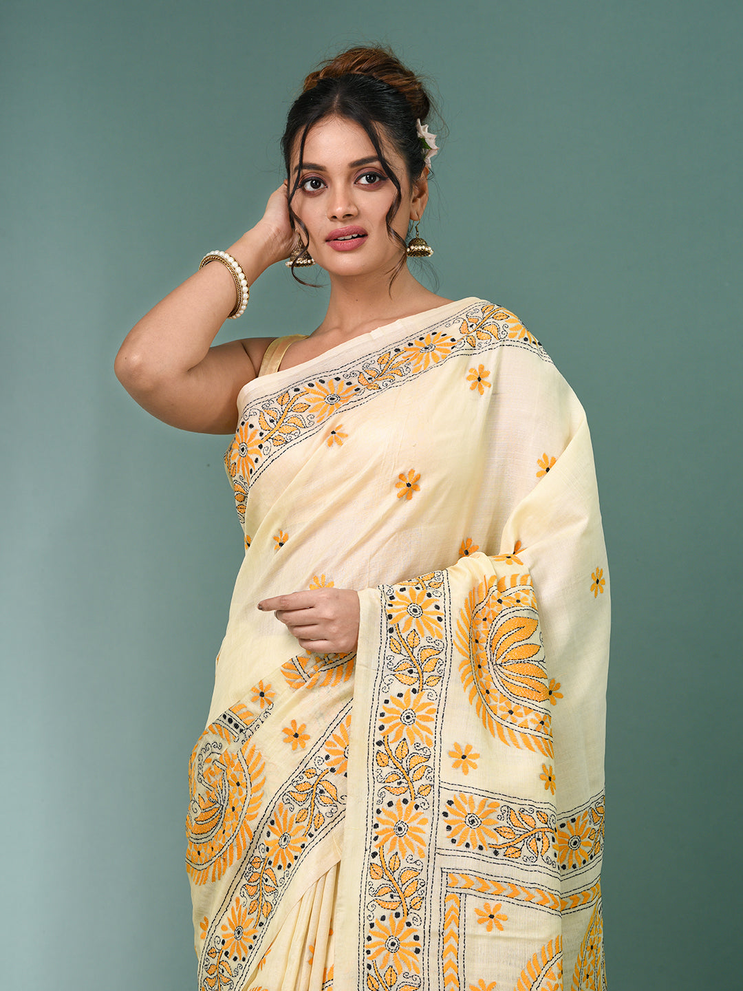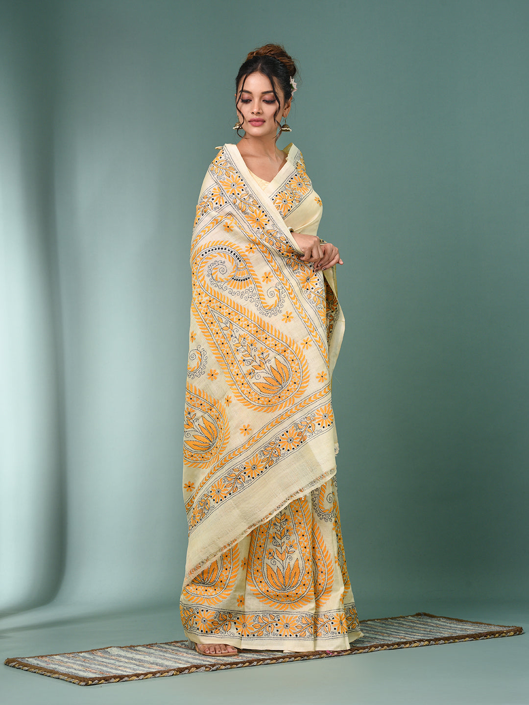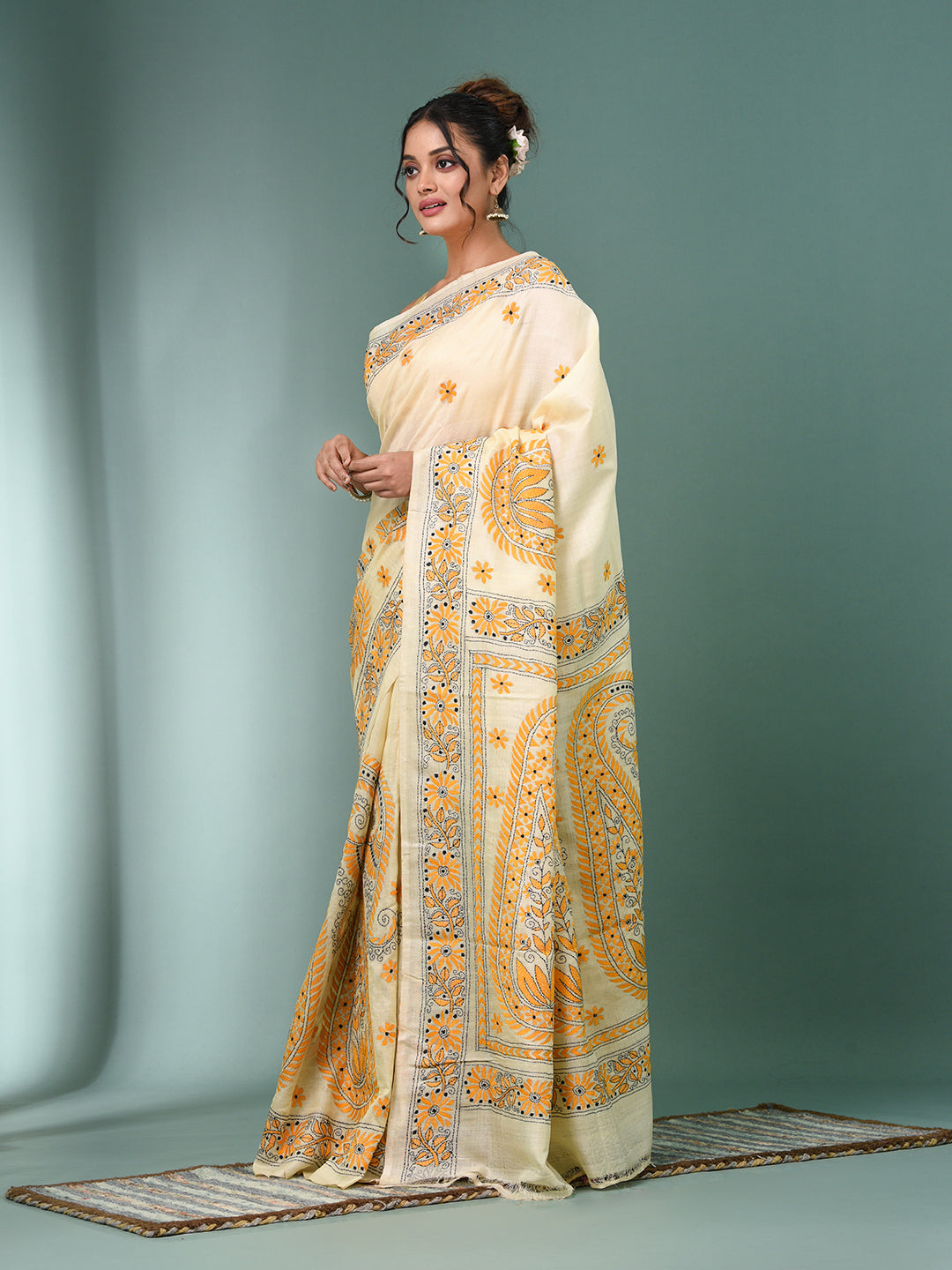 Beige Kantha Stitch Bangalore Silk Soft Saree