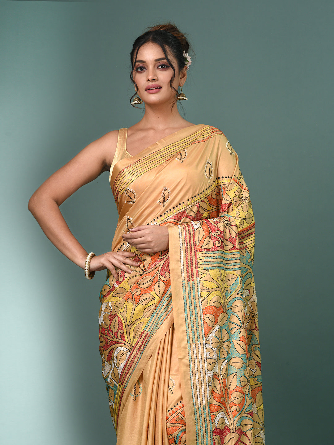 Embrace timeless craftsmanship with our Kantha Stitch sarees. Handcrafted with intricate, traditional embroidery, each piece showcases delicate motifs and vibrant patterns, bringing a touch of heritage to your wardrobe. Made from soft, comfortable fabric, these sarees are perfect for casual gatherings, festive occasions, and even daily wear. The unique Kantha stitch adds texture and depth, making every saree a work of art. Available in a variety of colors and designs, they offer a blend of tradition and modern elegance. Perfect for those who appreciate artisan craftsmanship and cultural artistry.