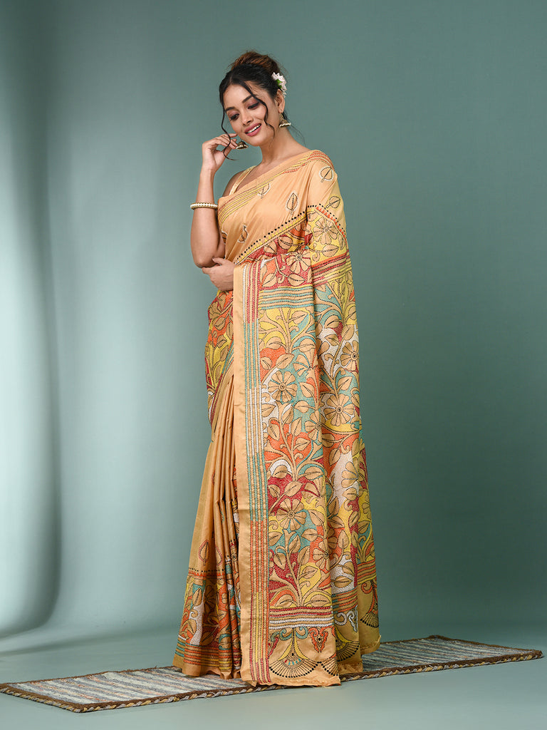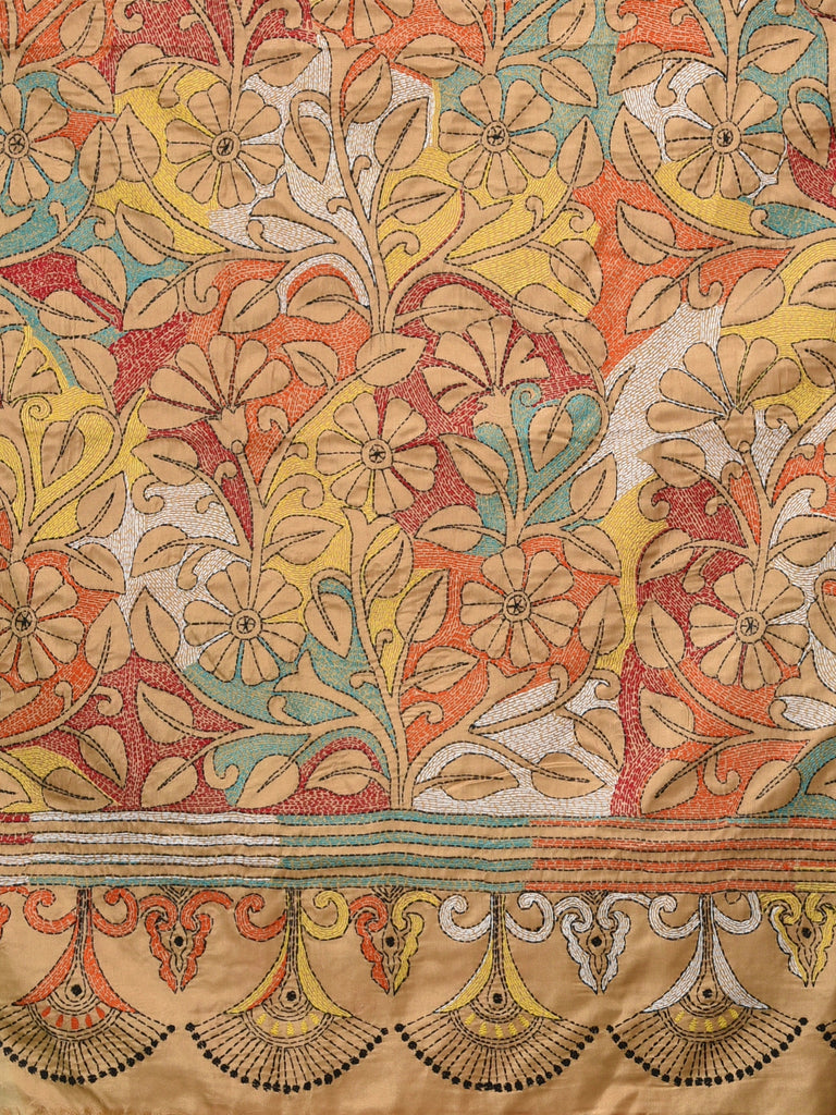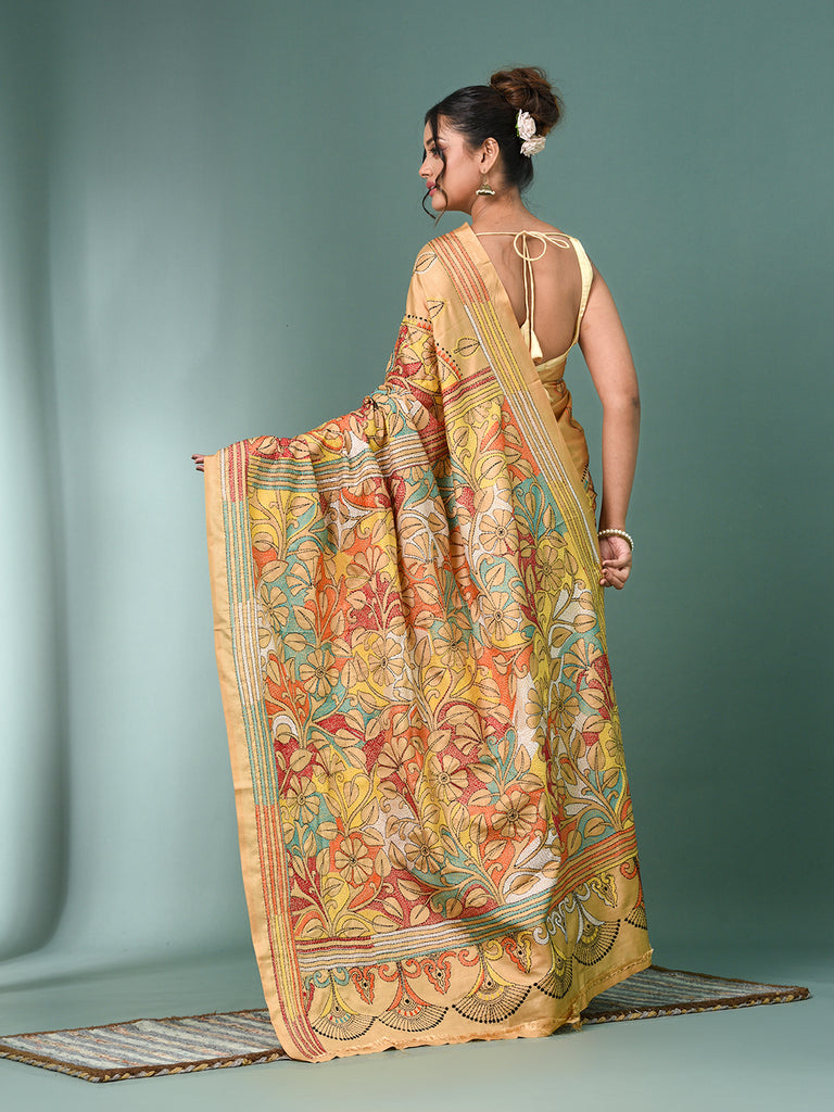 Beige Kantha Stitch Silk Soft Saree