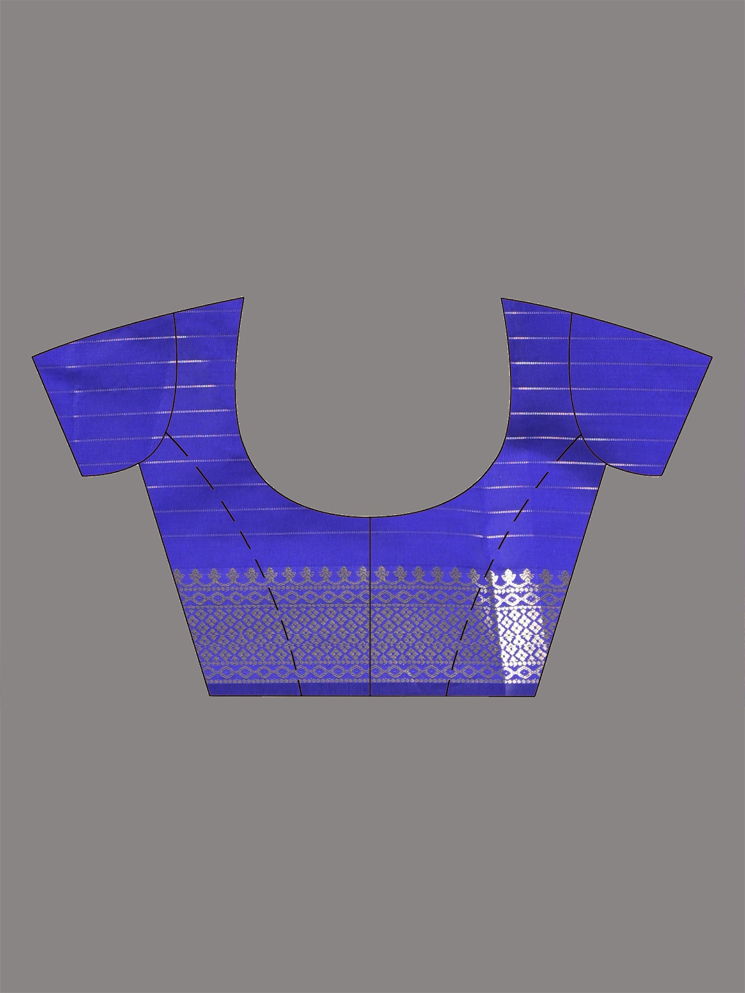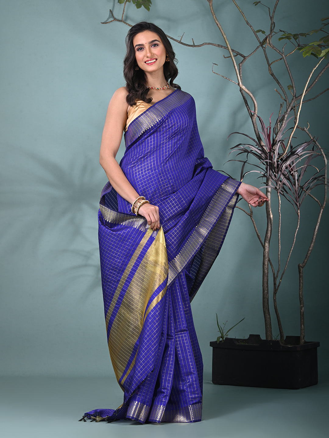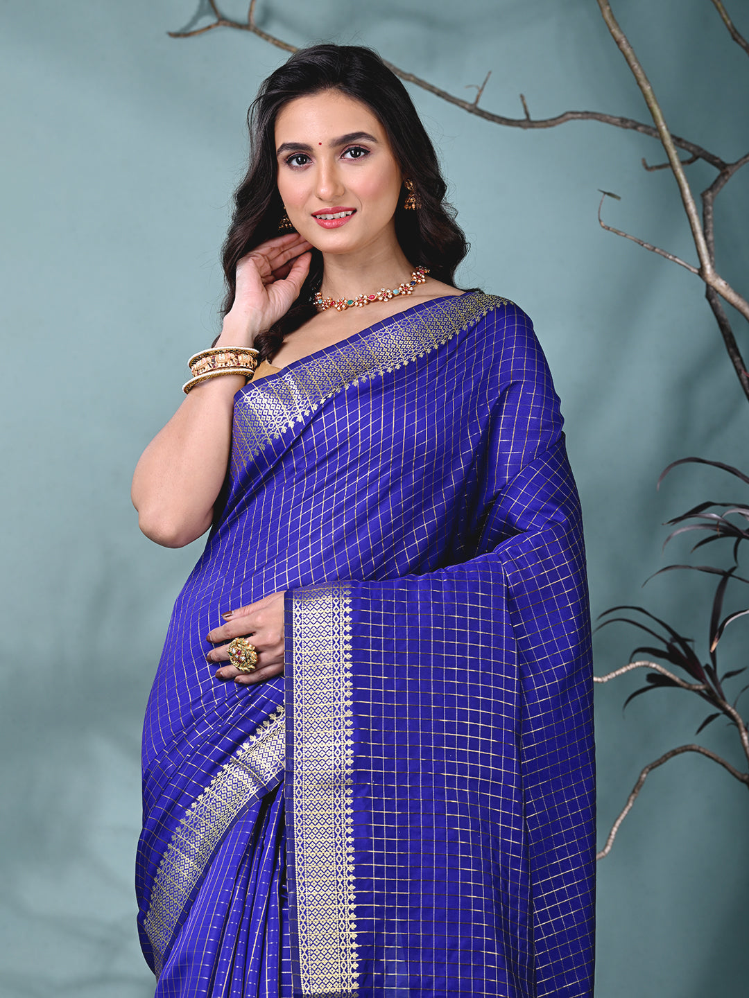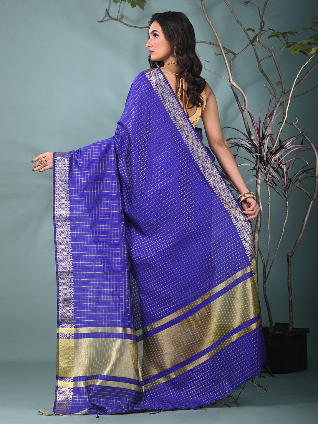 Blue Catlon Soft Silk Saree with Checkered Pattern